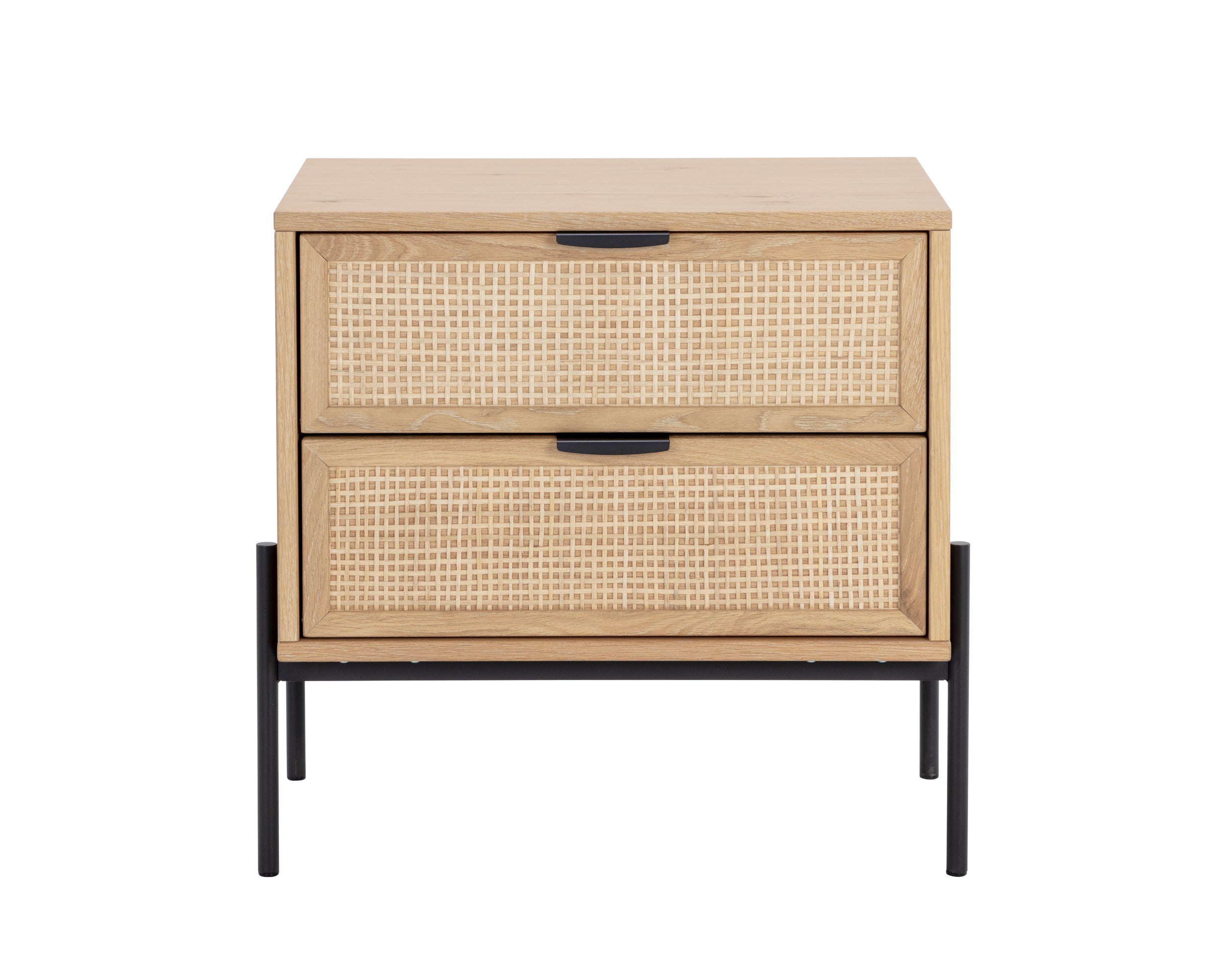 Create a bedroom influenced by global travels with this stylish nightstand crafted in Indonesia. Features two natural rattan drawers contrasted with a rustic oak wood frame. Matte black iron feet and matching iron handles complete the design. Handle With Care: This design has been crafted with rattan. This artisan-crafted material features intricate weaving that results in natural variations where no two pieces are alike. Colour and texture differences are to be expected and embraced with this natural material. Due to the weaving process used, the fibres in this material may display shorter or longer lengths where the weaving ends. Visit our Product Care page for more information on how to ensure the lasting beauty of this piece. As wood is an organic, porous material, these pieces will contain natural variation of texture and may also exhibit fine indentations and cracks. Wood pieces will also display a disparity of colour and grain, and visible knots and burls that add to the character of each piece.