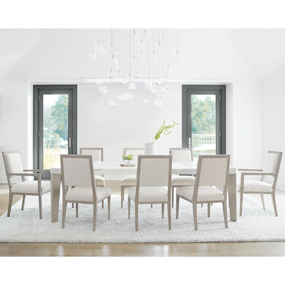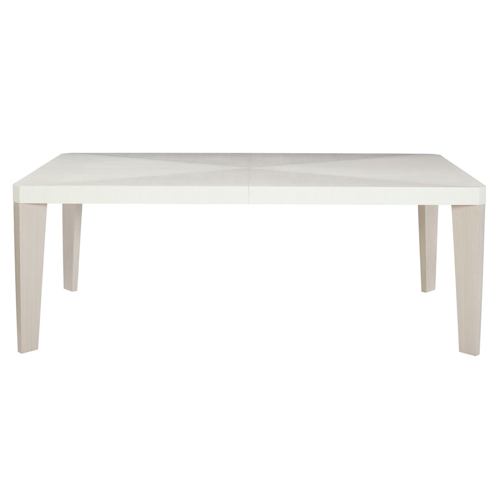 This transitional dining table combines clean lines with light finishes, signaling sleek sophistication with a warm, inviting feel. The Axiom dining table uses angular shapes and light, silky finishes to create a distinct style. The tabletop features a fancy face pyramid pattern in Linear White finish. Completing the clean, contemporary look, legs in a Linear