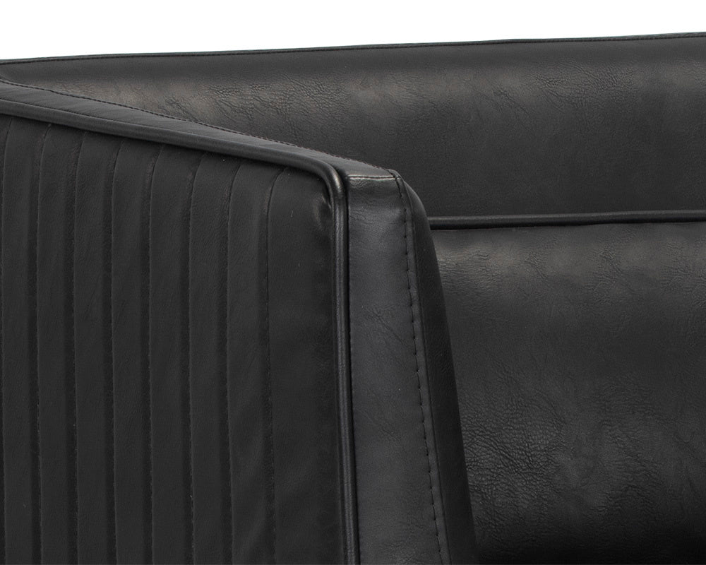 Inspire conversation while seated in this bold armchair. Streamlined and refined, this design features a seat in vintage black faux leather with channel tufting on the exterior. Sleek piping and a bronze steel base complete the look. Coordinating sofa also available. Handle With Care: This design has been crafted with faux leather. Faux leather is manufactured to reflect the natural characteristics of leather; as such, colour variations, markings, wrinkles, grooves, and light scratches are appreciated characteristics. No two pieces will be alike. Visit our Product Care page for more information on how to ensure the lasting beauty of this piece.
