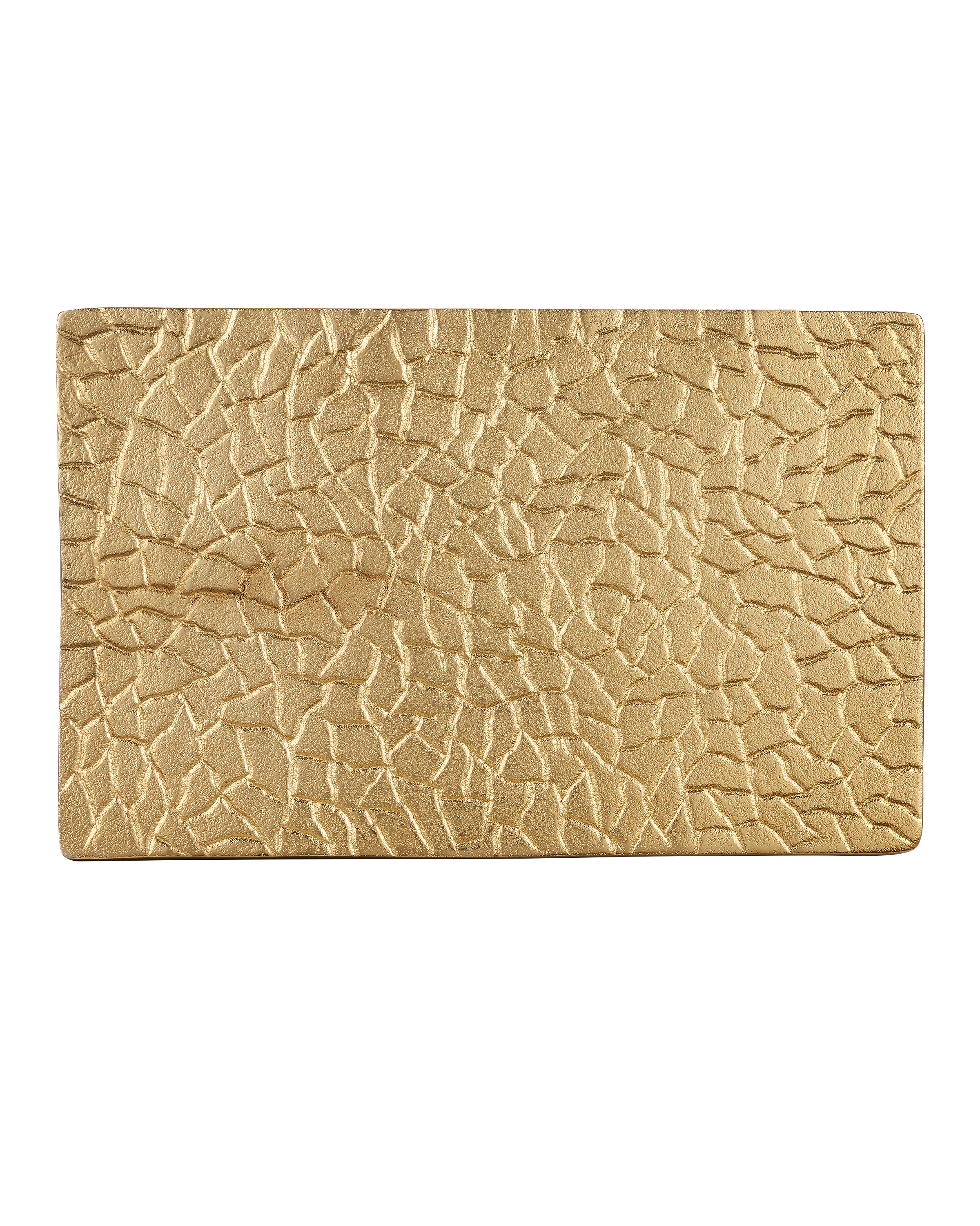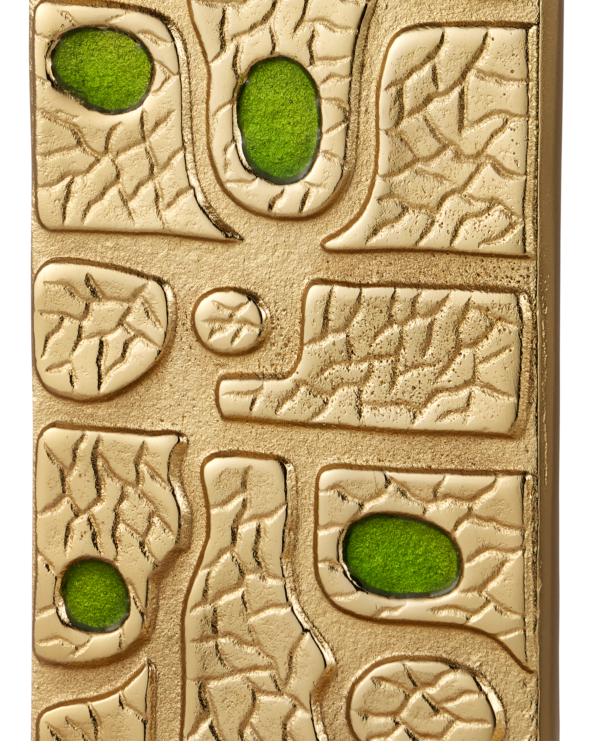 Inspired by a 1940s design, the Beau Monde Gold & Green C Table has textural shapes made of aluminum in a gold finish, ornamented with green enamel lozenges that create a lively pattern along the sides of the pedestal. Inspired by a mirror seen at a French flea market, the gold accent table has the same patterning on its top and base.