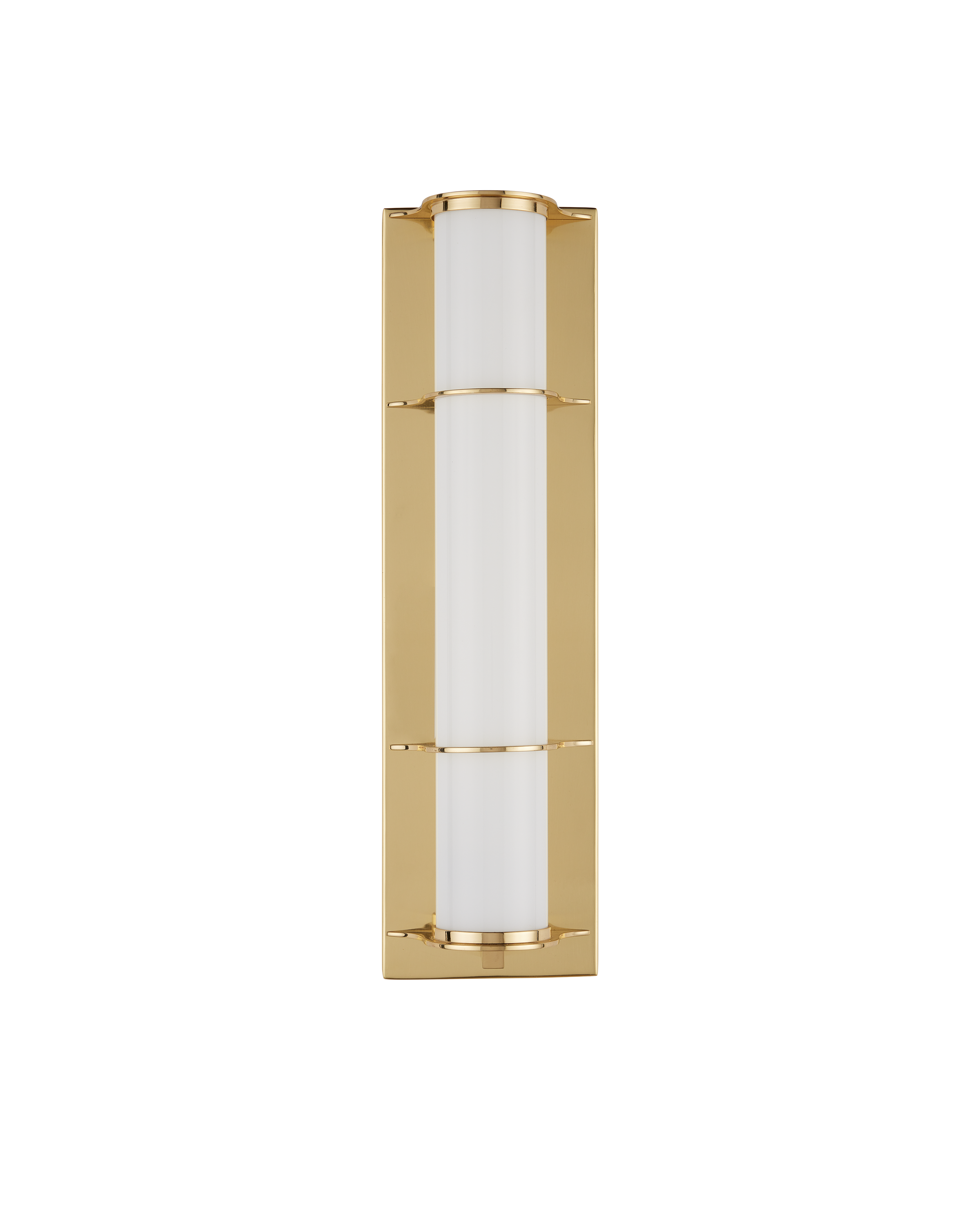 The Blaine Brass Bath Wall Sconce has a tubular design, with the milky glass tube set into the metal rings that match the wallplate in a polished brass finish. Perfect for lighting up a bathroom vanity, the Blaine has a simple design that will work well within a number of design styles.