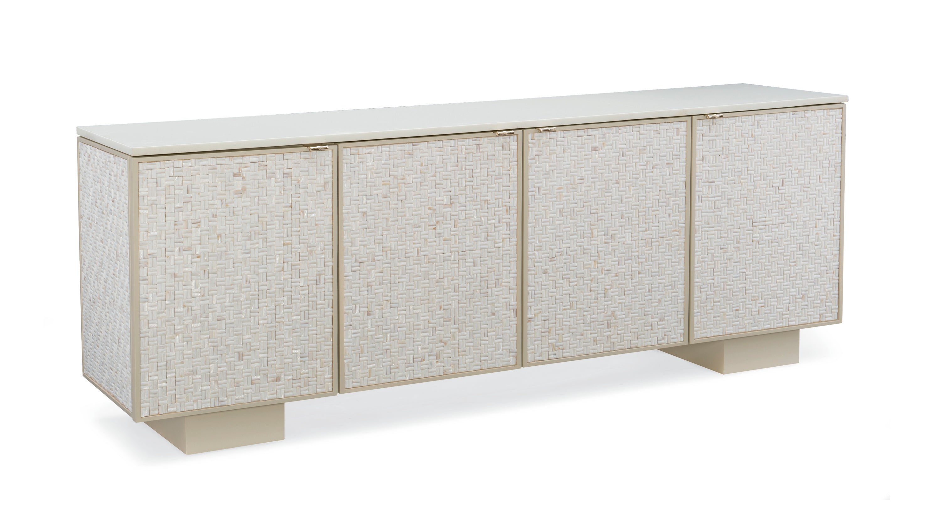 This dramatic sideboard is wrapped in three-dimensional rectangles of pearlescent shell, presented in a basketweave pattern, resulting in a cabinet with unprecedented luster and sheen. Topped with white stone and fitted with Soft Taupe adjustable footings, this piece stands up to the height of a credenza or drops down to the height of an entertainment center. Featuring four doors with hidden pulls and loads of storage, Bomb-Shell takes center stage in any room.