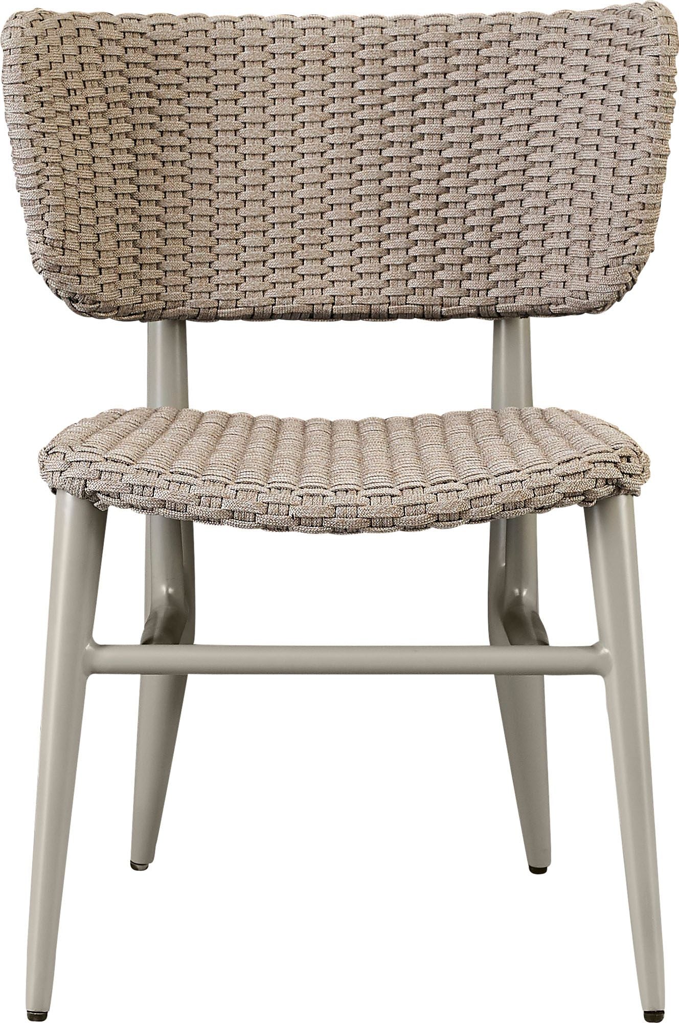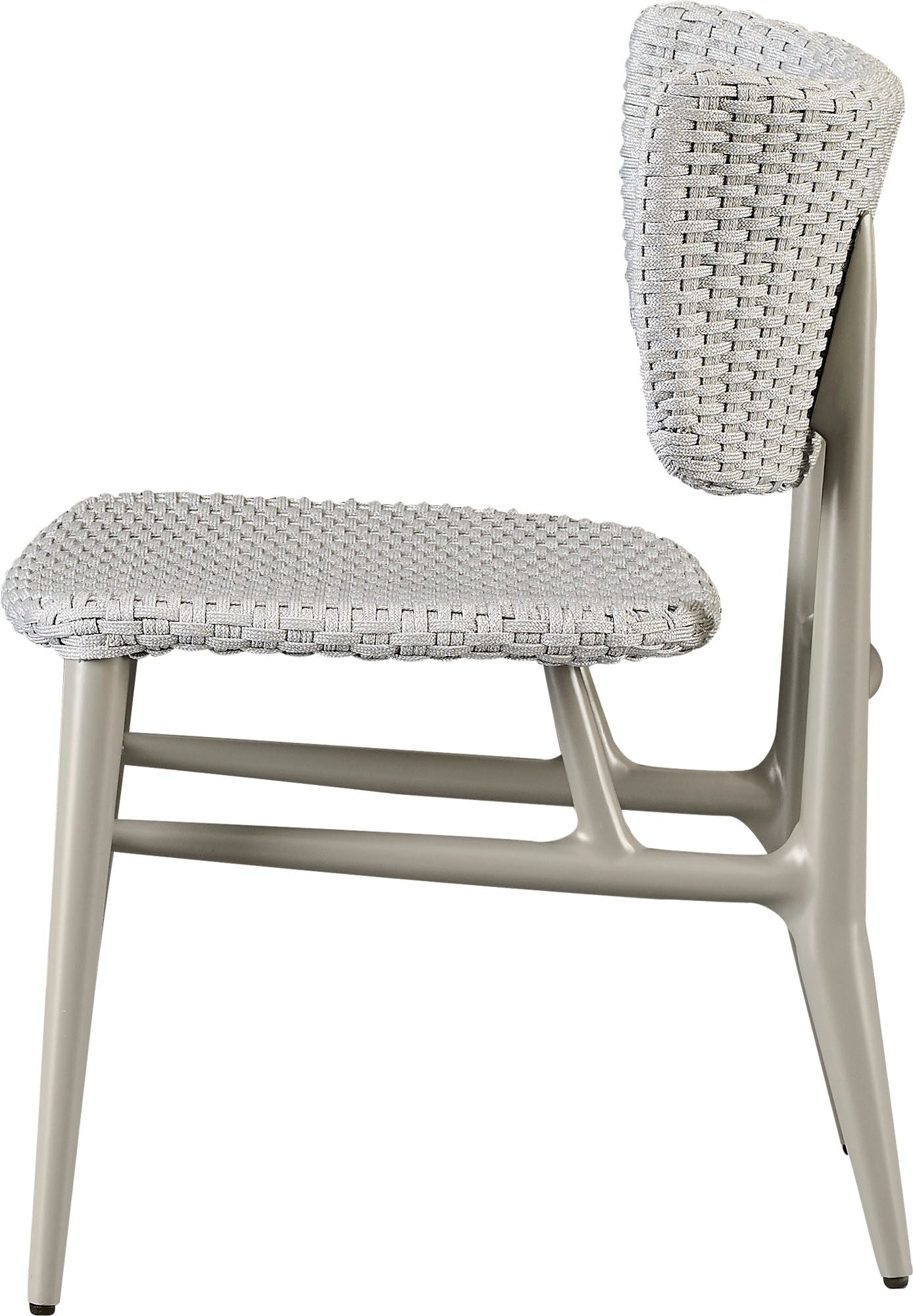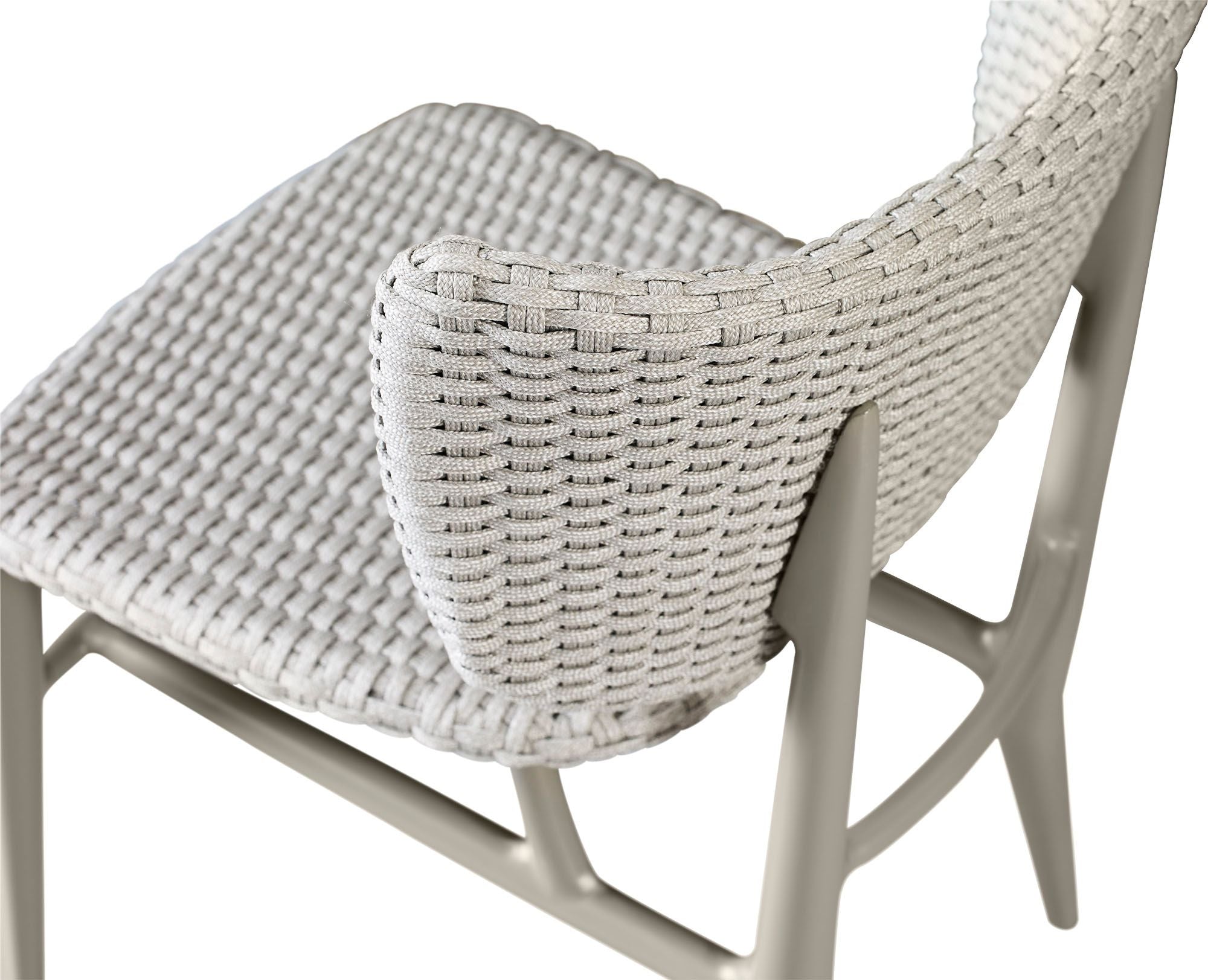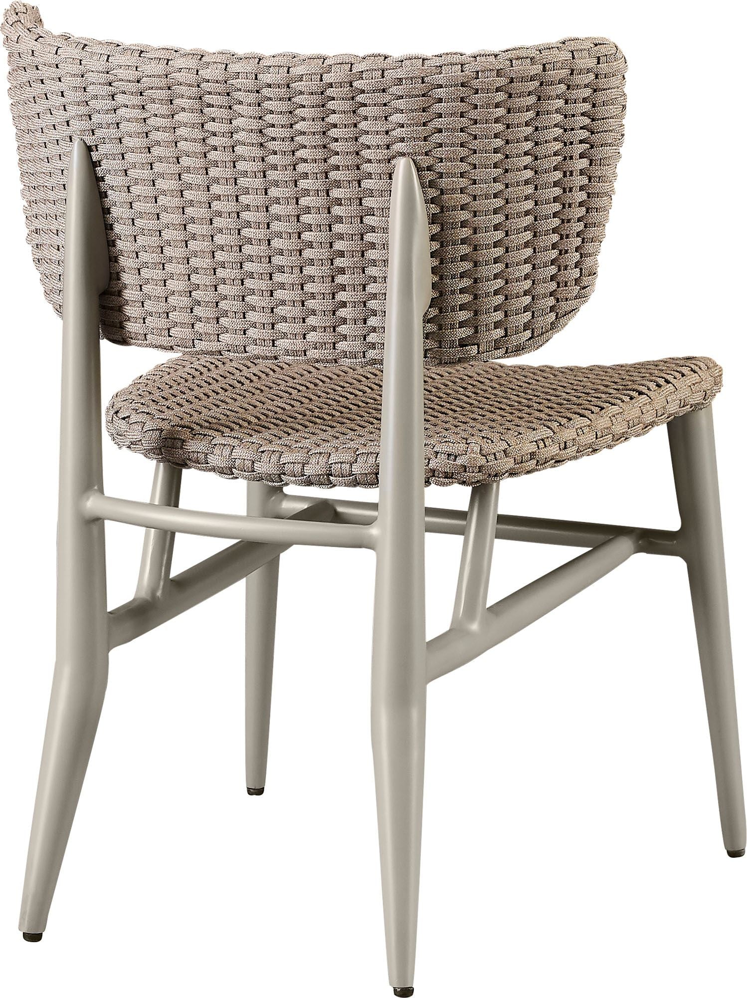 Cast aluminum dining chair in Gravel finish with flat woven acrylic rope in Stone or Bark.