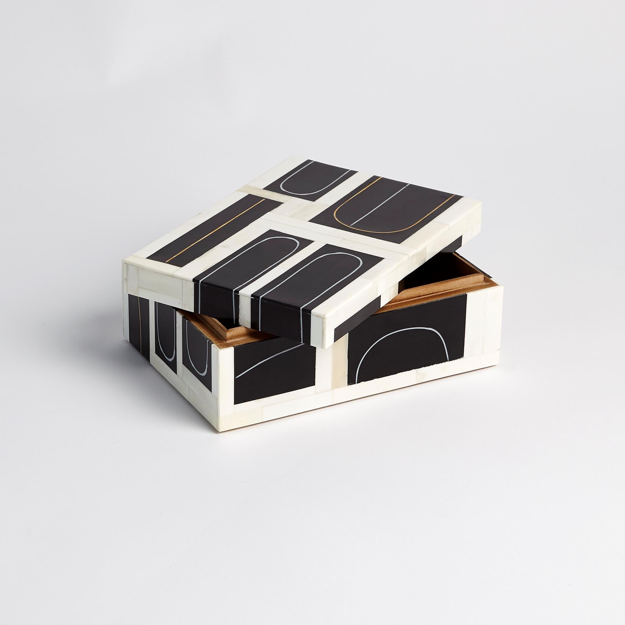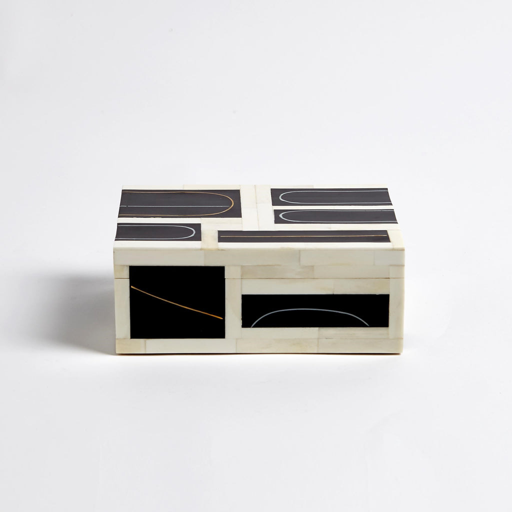 Dimensions: 9"L x 6.5"W x 3.5"H Weight: 2.4 - Materials: MDF, Brass, Bone, Resin