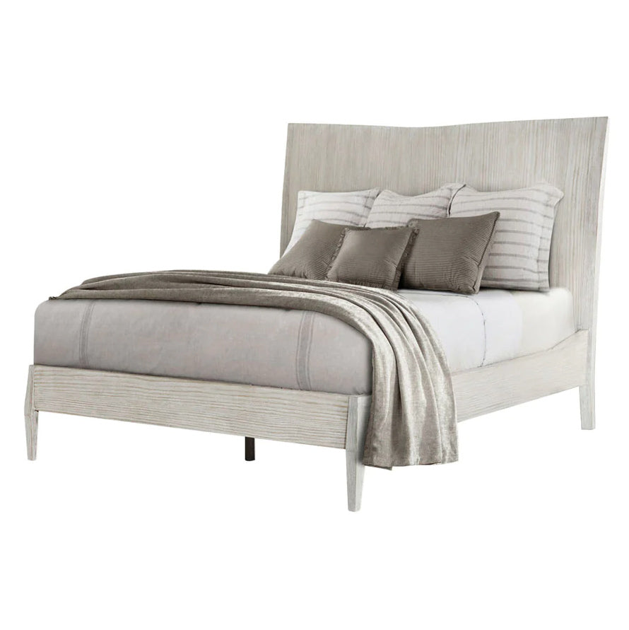 Featured in Theodore Alexander's new Sea Salt finish, the Breeze Collection's Wooden Panel California King Bed incorporates a beautiful beveled headboard along with faceted feet and frame crafted from wire-brushed cerused pine.