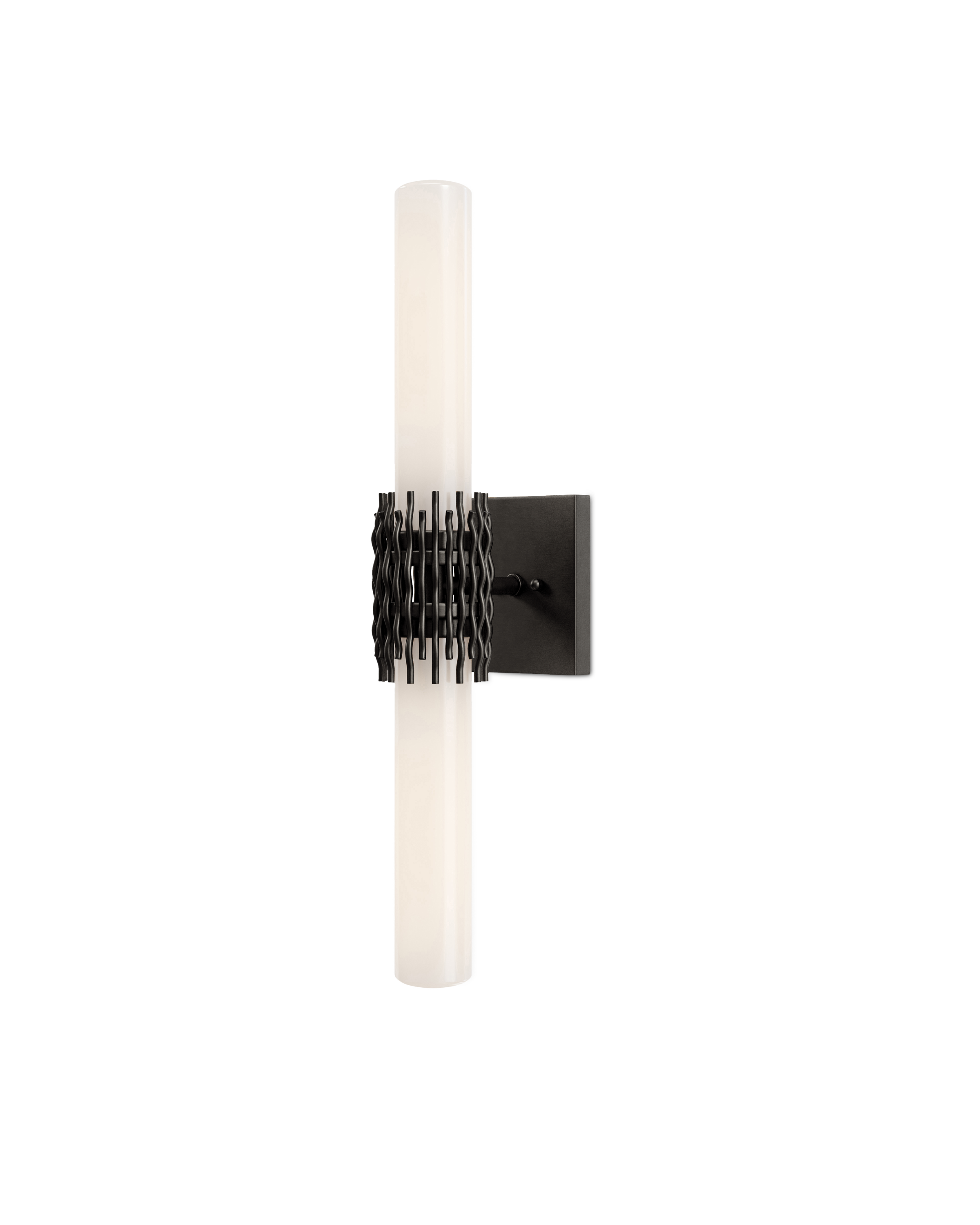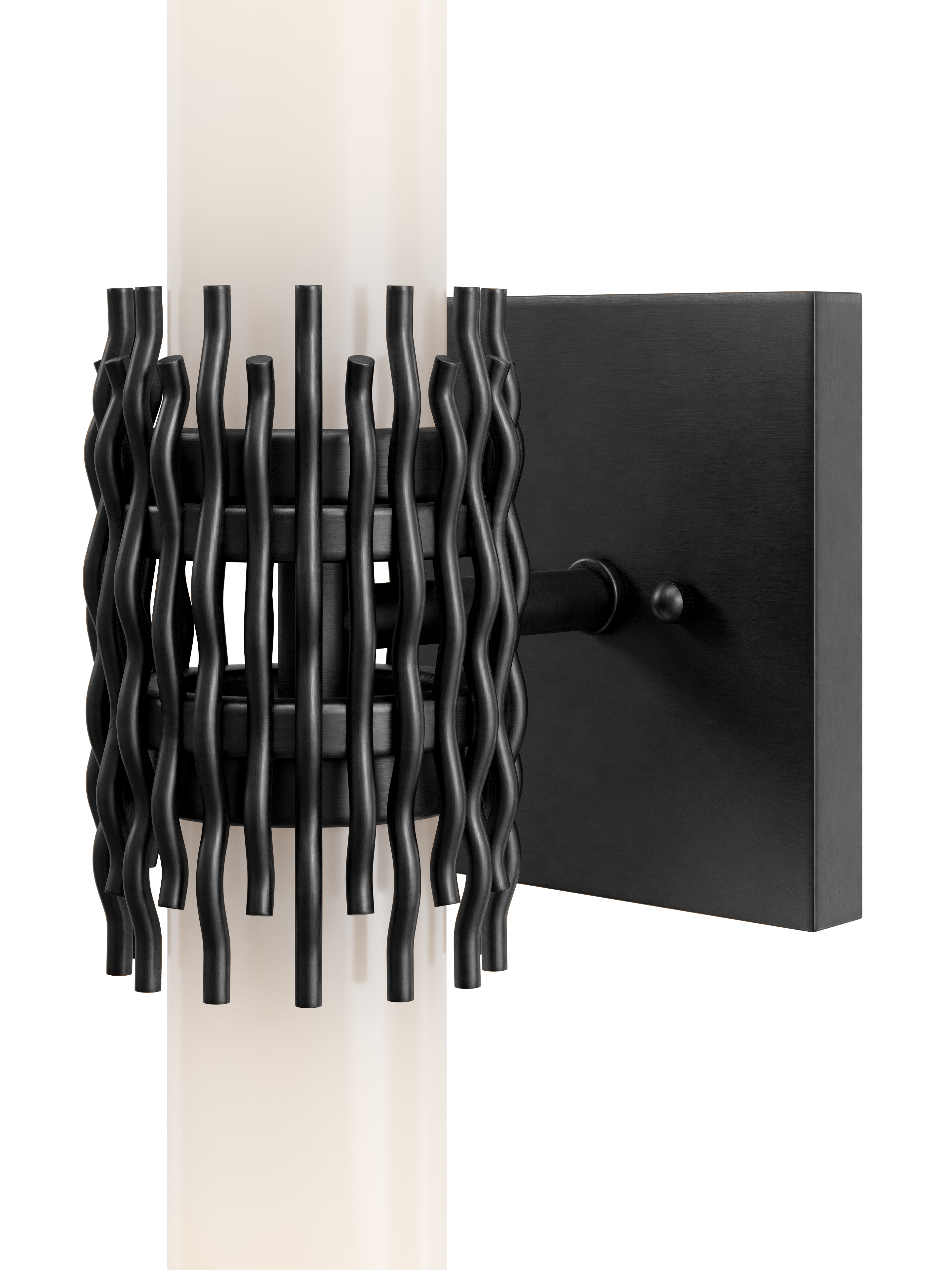 The Brietta Bronze Bath Wall Sconce is made of metal in an oil-rubbed bronze finish with a design that features undulating wirework that cradles two milky glass tubes, leaving an intentional negative space at the center that adds visual intrigue. Fitted with two elongated bulbs that fully illuminate the glass, a soft, ambient glow enhances the sculptural form.