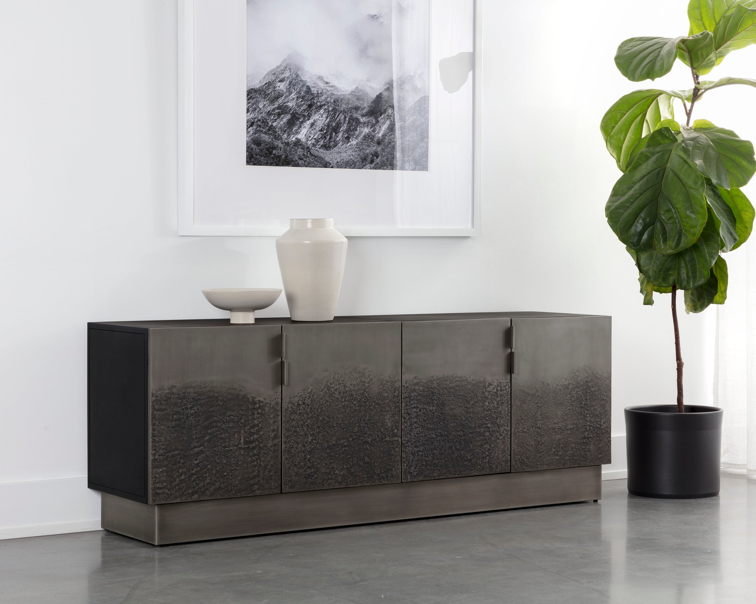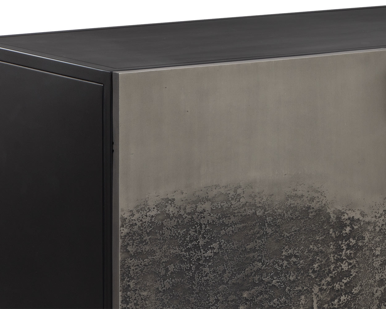 Carefully crafted, the Caddo Sideboard balances practicality and style. Four textured antique nickel aluminum doors reveal ample storage for all your essentials. A black powder-coated iron frame finishes off the look. Made in India. With refined craftsmanship, this design was brought to life by skilled local artisans. Due to the nature of handcraftsmanship, unique imperfections such as fissures, markings and variations in colour and shape are welcomed and appreciated characteristics for a truly one-of-a-kind piece.