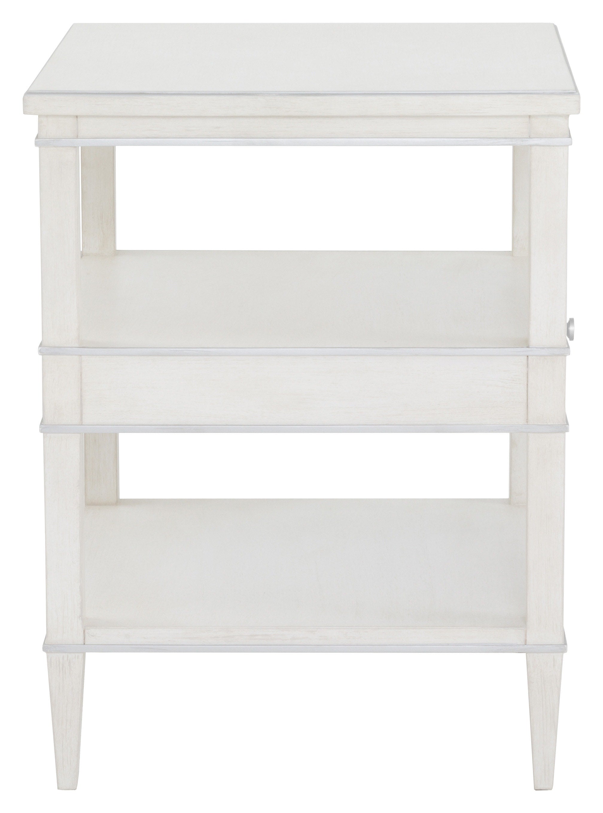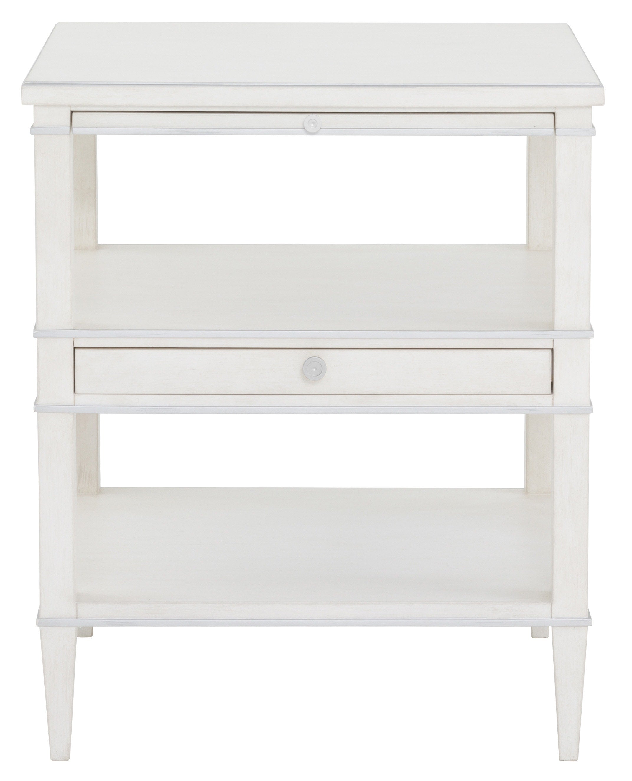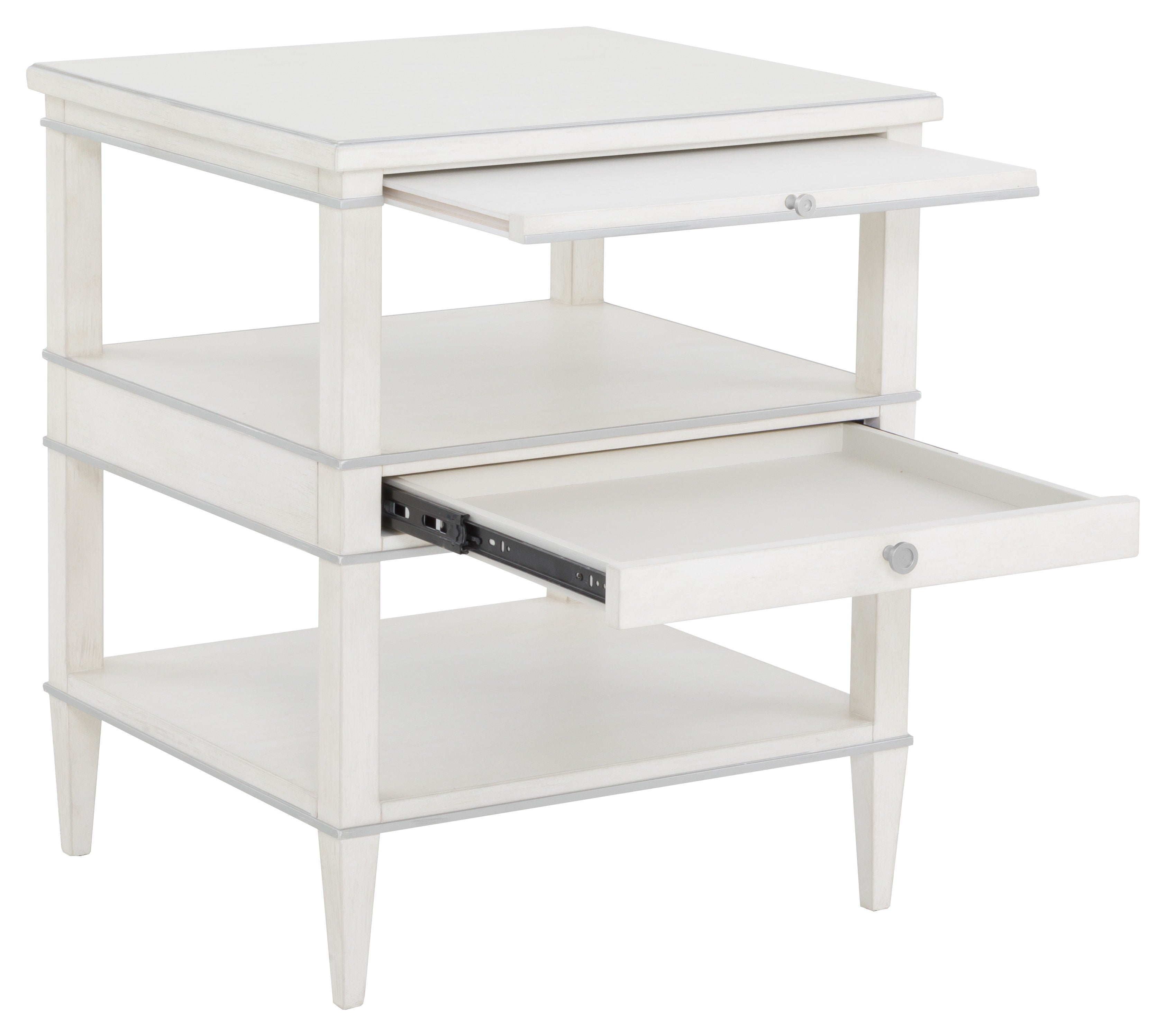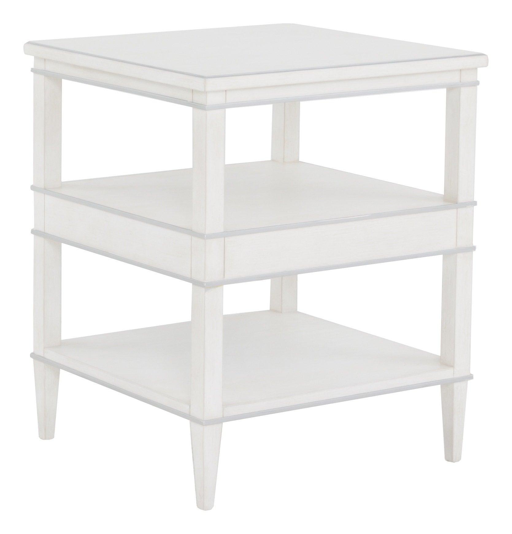 Our Camille Collection merges traditional design elements with a fresh perspective to create a classic and timeless look for today?s modern living. Crafted from rubberwood solids, Camille's classic silhouette is draped in a Linen finish and trimmedin Antique Gold metallic striping. This versatile and storage-friendly collection includes a 24" square and 24" round end tables with pull out shelves and drawer, cocktail table with one drawer, and a console table with one drawer. Camille is stocked Linen or available in 40+ additional custom finishes via our Monogram Program.