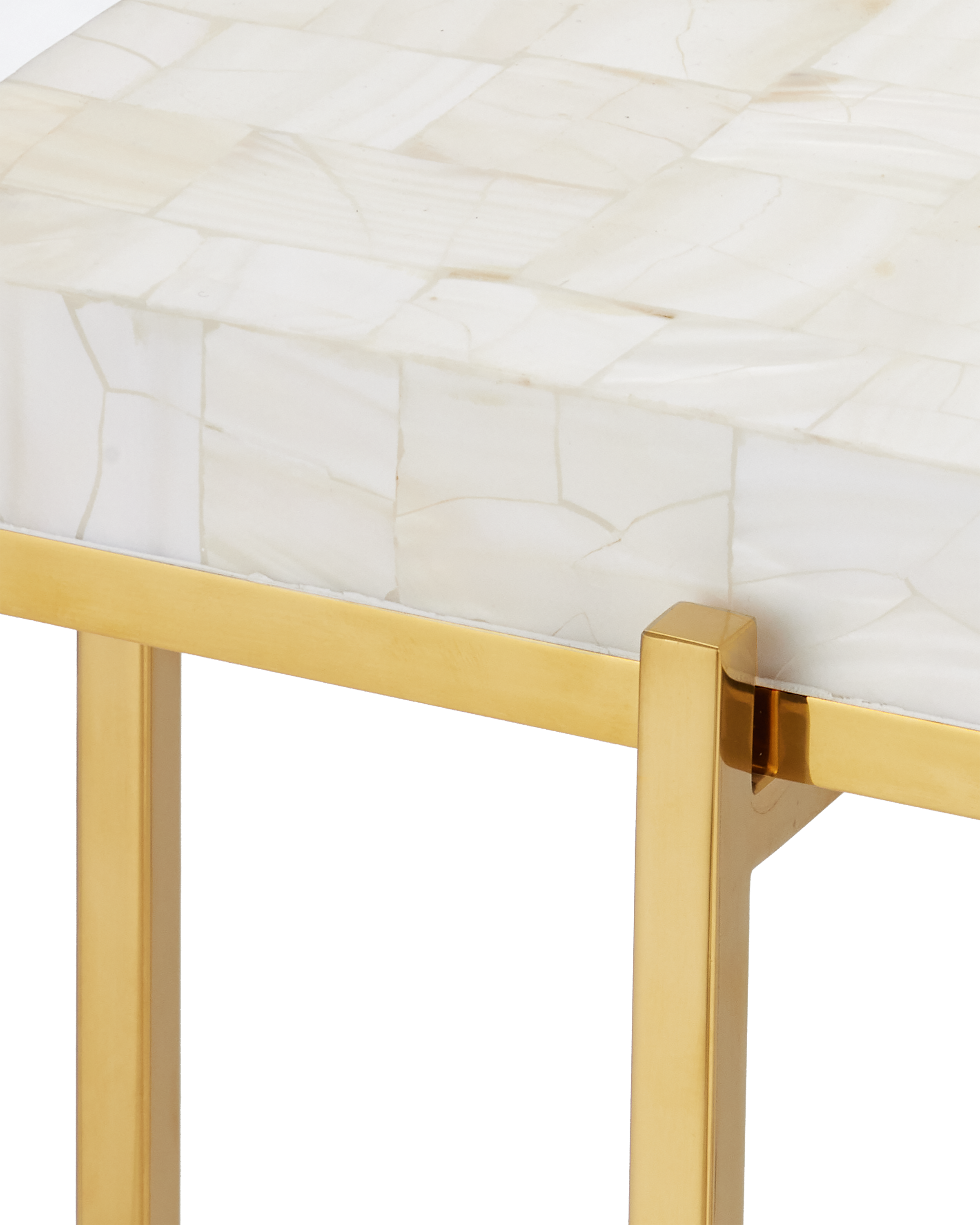 The luxe feel of a timeless material make the Casey Mother of Pearl Accent Table a striking display of fine artisanship. The top is covered in a mosaic of shells that were expertly placed to cover the rectangular slab, which is inset into the metal frame like a gem. Four legs made of stainless steel in a warm brass finish are connected by an ex-shaped stretcher. The gold and ivory drinks table will bring radiant charm to any spot even though it’s small.