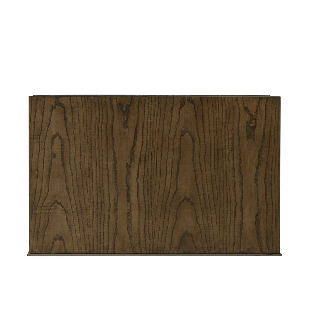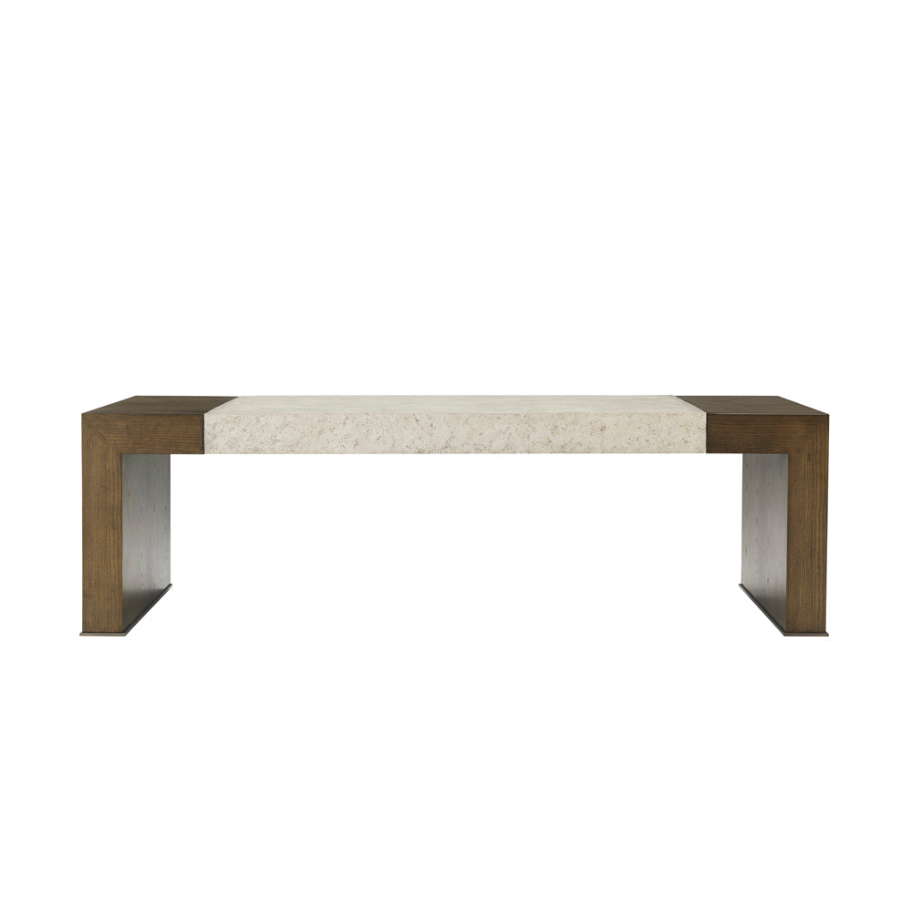 Modern parsons style cocktail table made of figured cathedral ash in your choice of Earth or Dune with our exclusive Mineral finish at the top and metal detail at the base of the legs in a bronze finish.