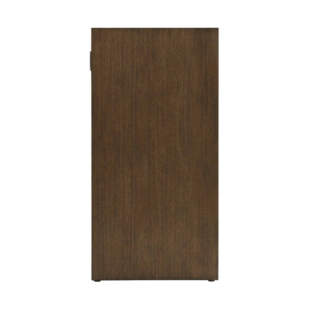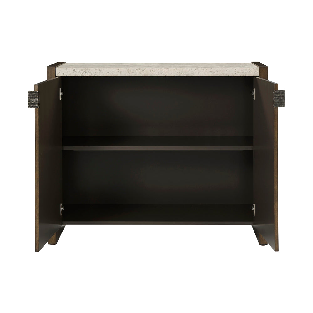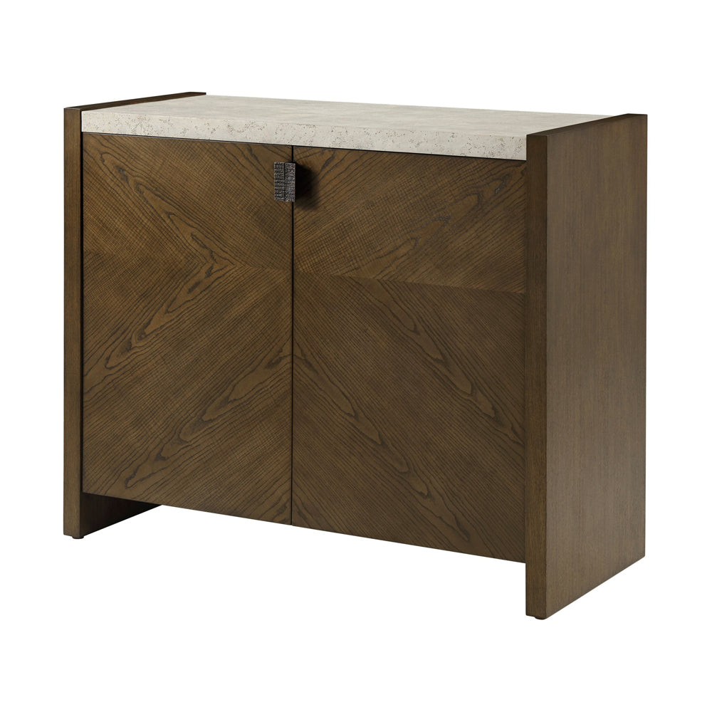 Figured two door hall chest in cathedral ash with peaceful symmetry available in Earth or Dune. Completed with textured metal pulls in our new Ember finish and a stone-like porous top in our exclusive Mineral finish. Includes an adjustable shelf.