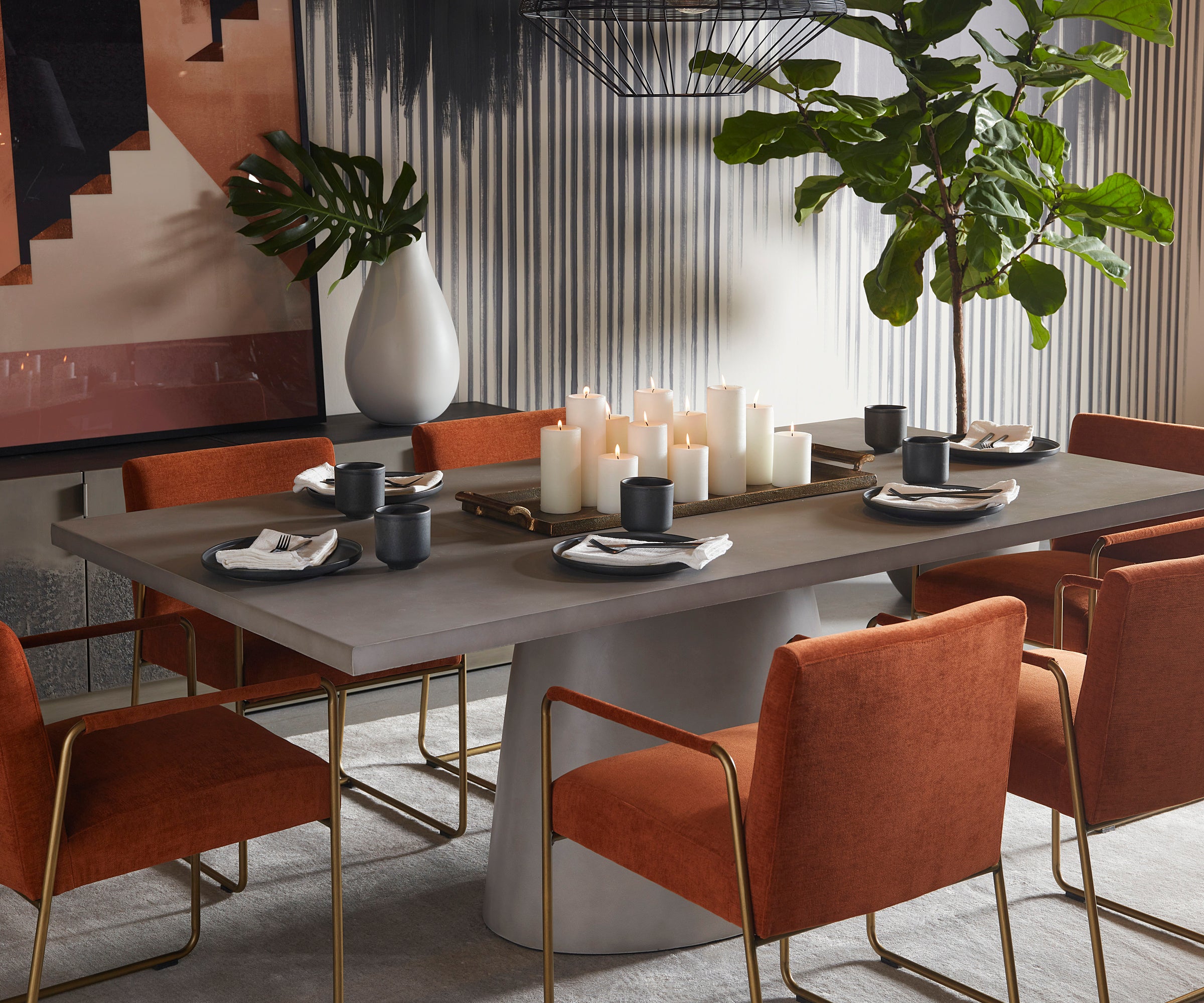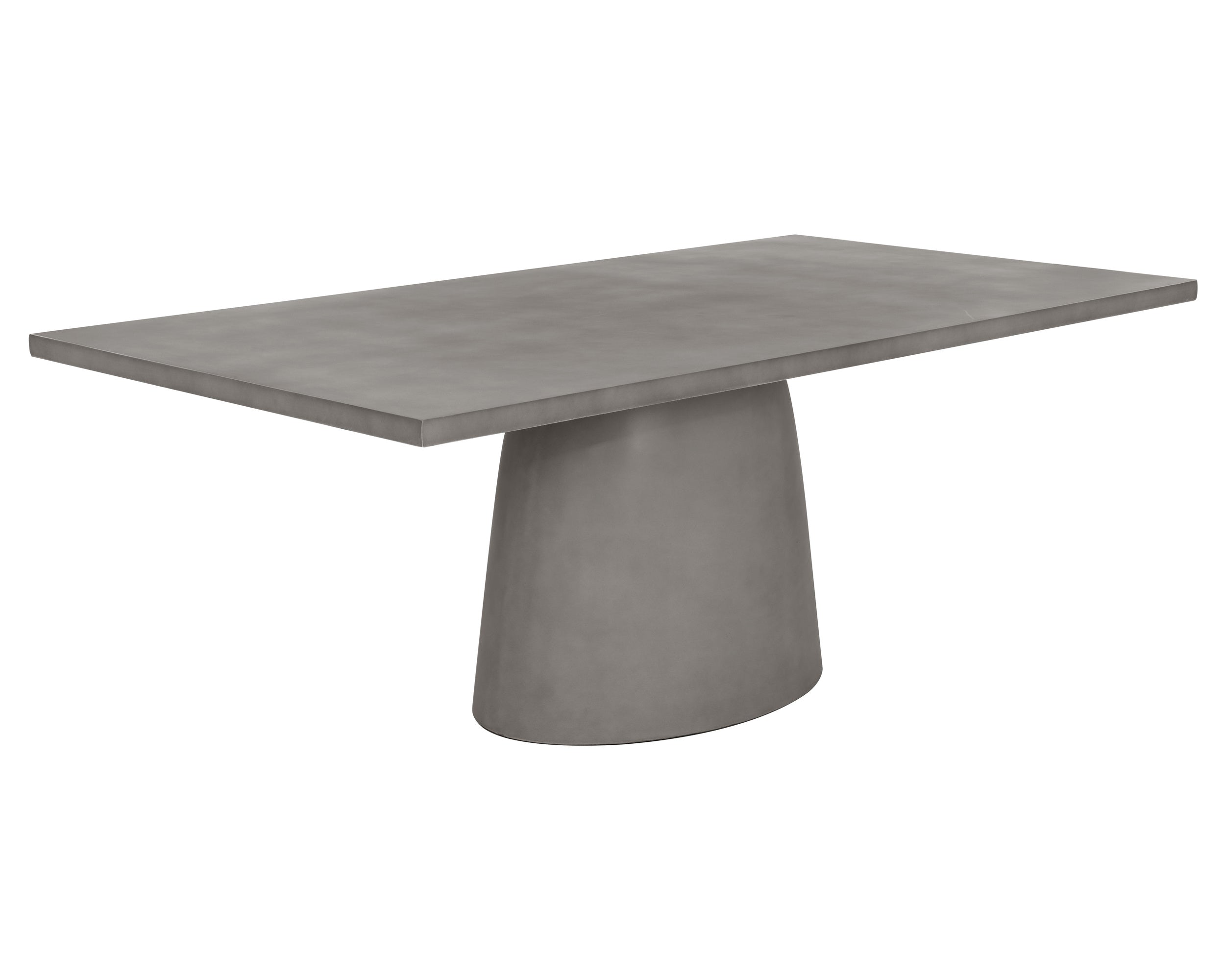 A grand dining table that features a sleek and contemporary design that is guaranteed to elevate any dining space. Features a rectangular tabletop with an oval base.