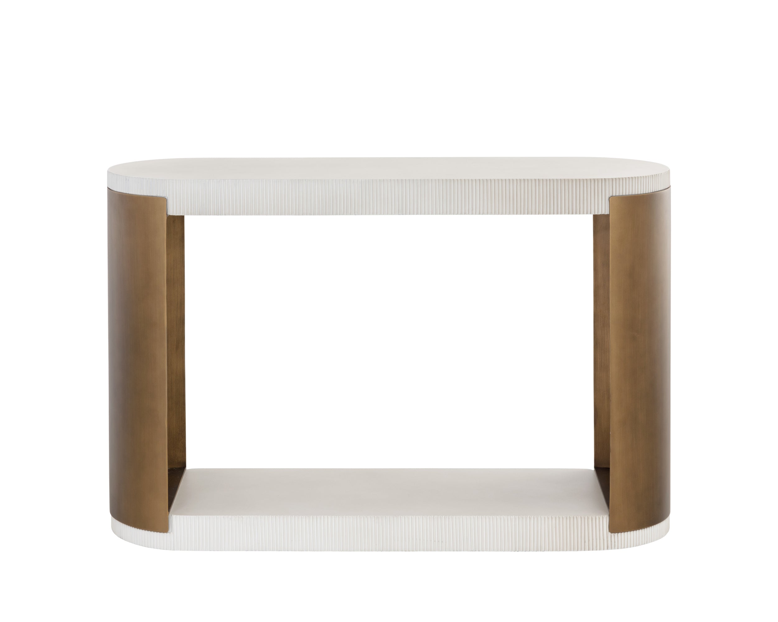 Combining old world influence with feminine flair, this stunning console table exudes opulence. Features a ridged white concrete top and base with a brass steel frame.