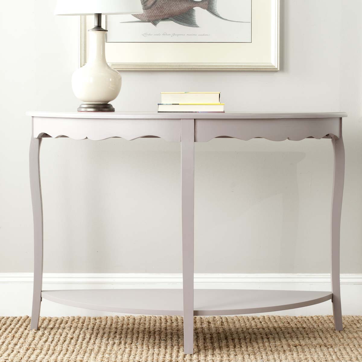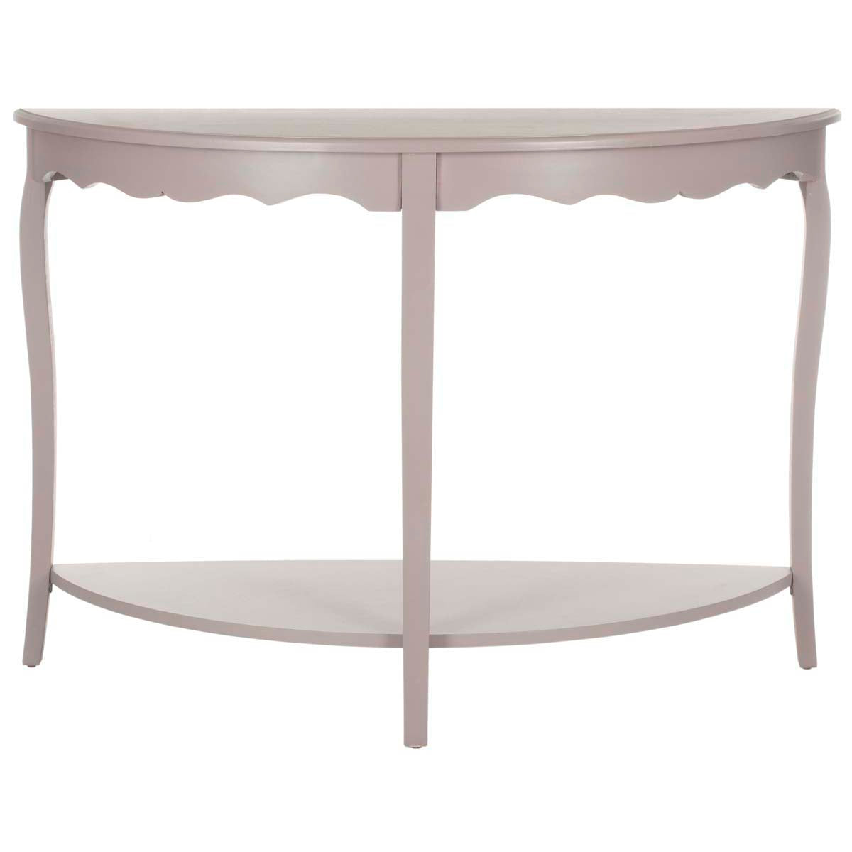 Delicate French elegance comes to the hall or entry with this lovely Christina Console. A gently scalloped apron and gently curved cabriole legs highlight Christina's romantic half moon silhouette, and a grey mauve finish is effortlessly sophisticated.