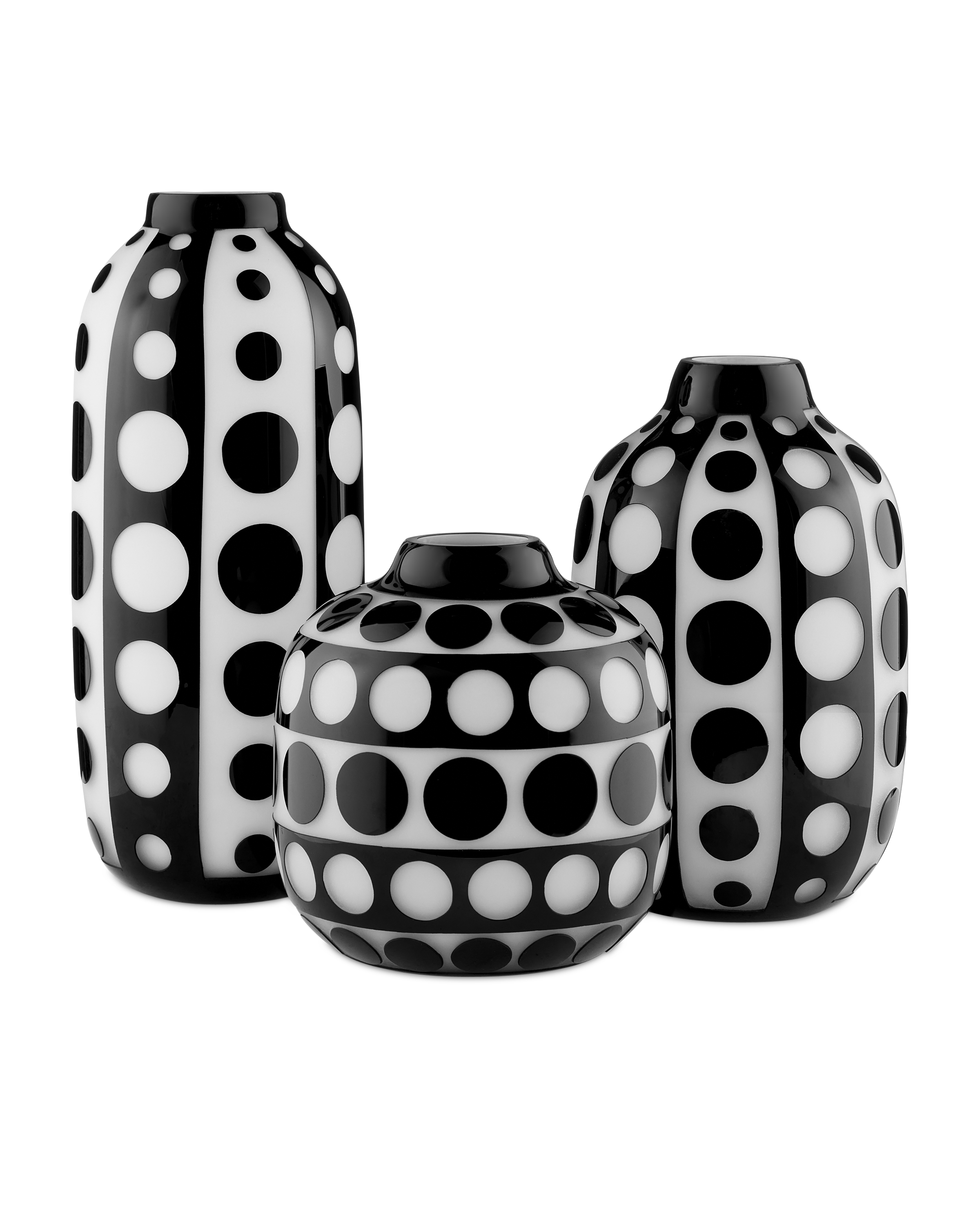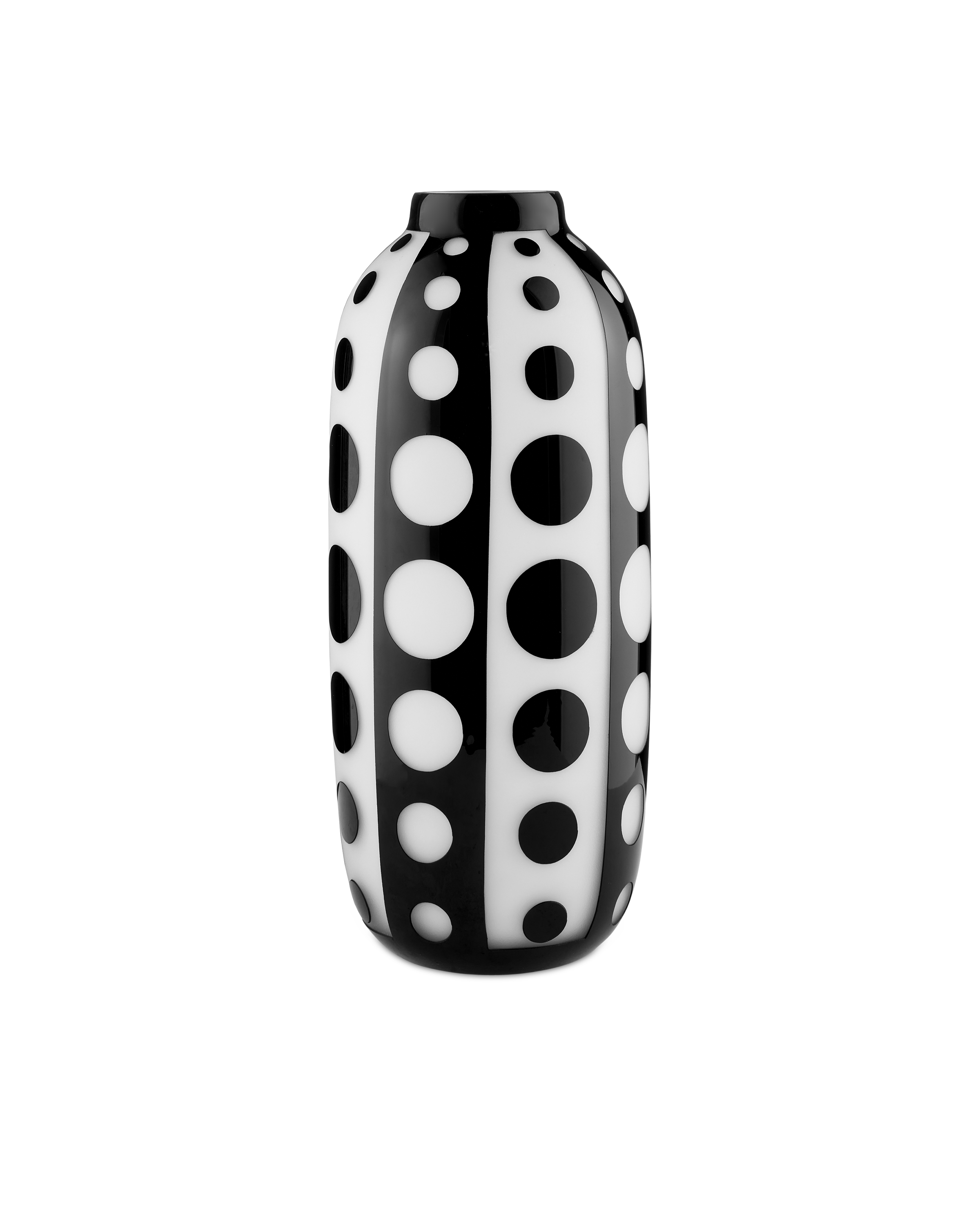 The Cicero Large Black & White Vase was created through an intensively complex process of layering clear, black, and white glass in that order. The dynamic profile with its mod geometric surface swirls with personality. Because the glass is layered on, there are slight raised areas that can be felt. This and the fact that the white layer of glass has to be sand-blasted away to reveal the black layer illustrates the artisanal quality of the white and black vase.