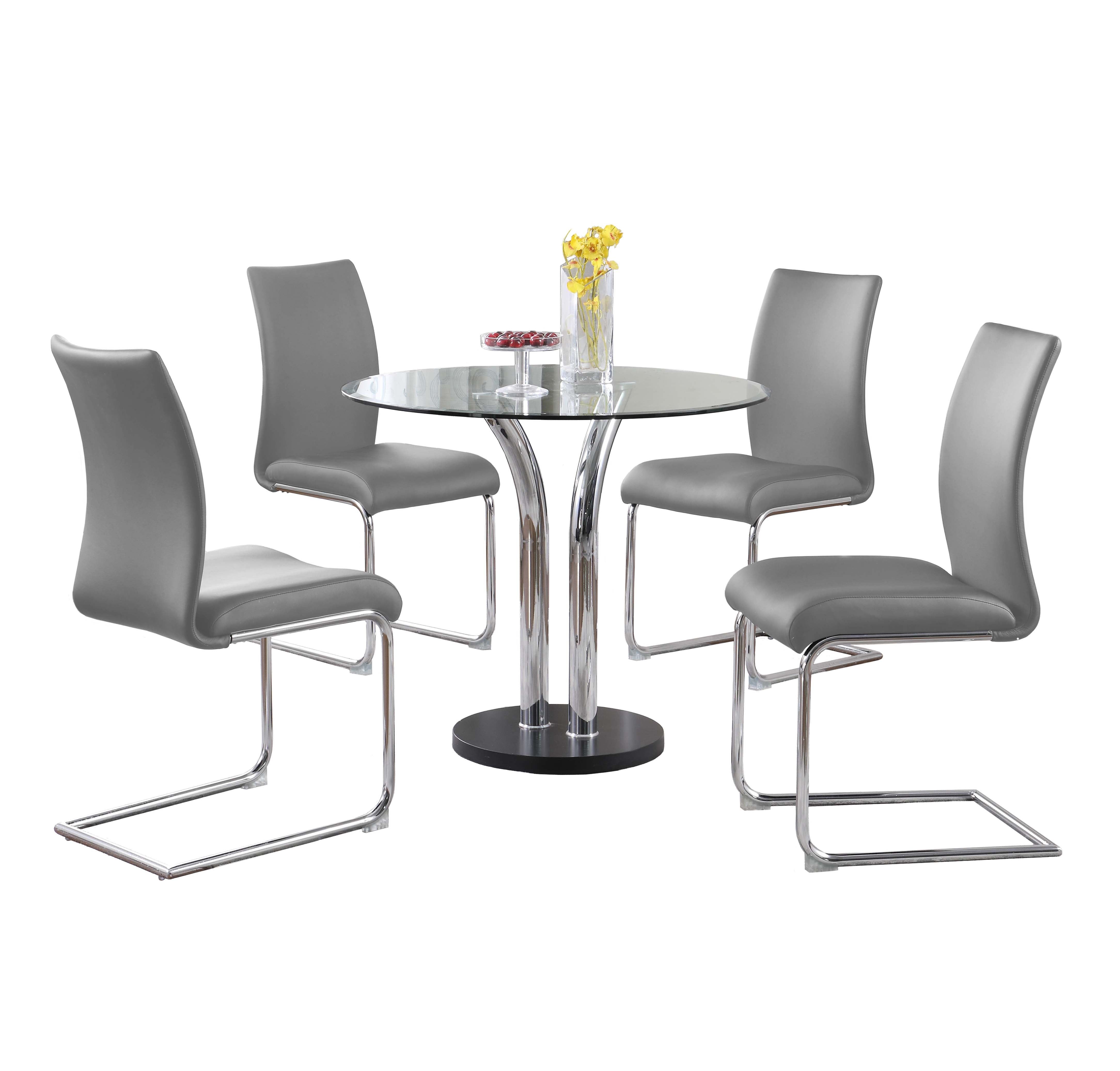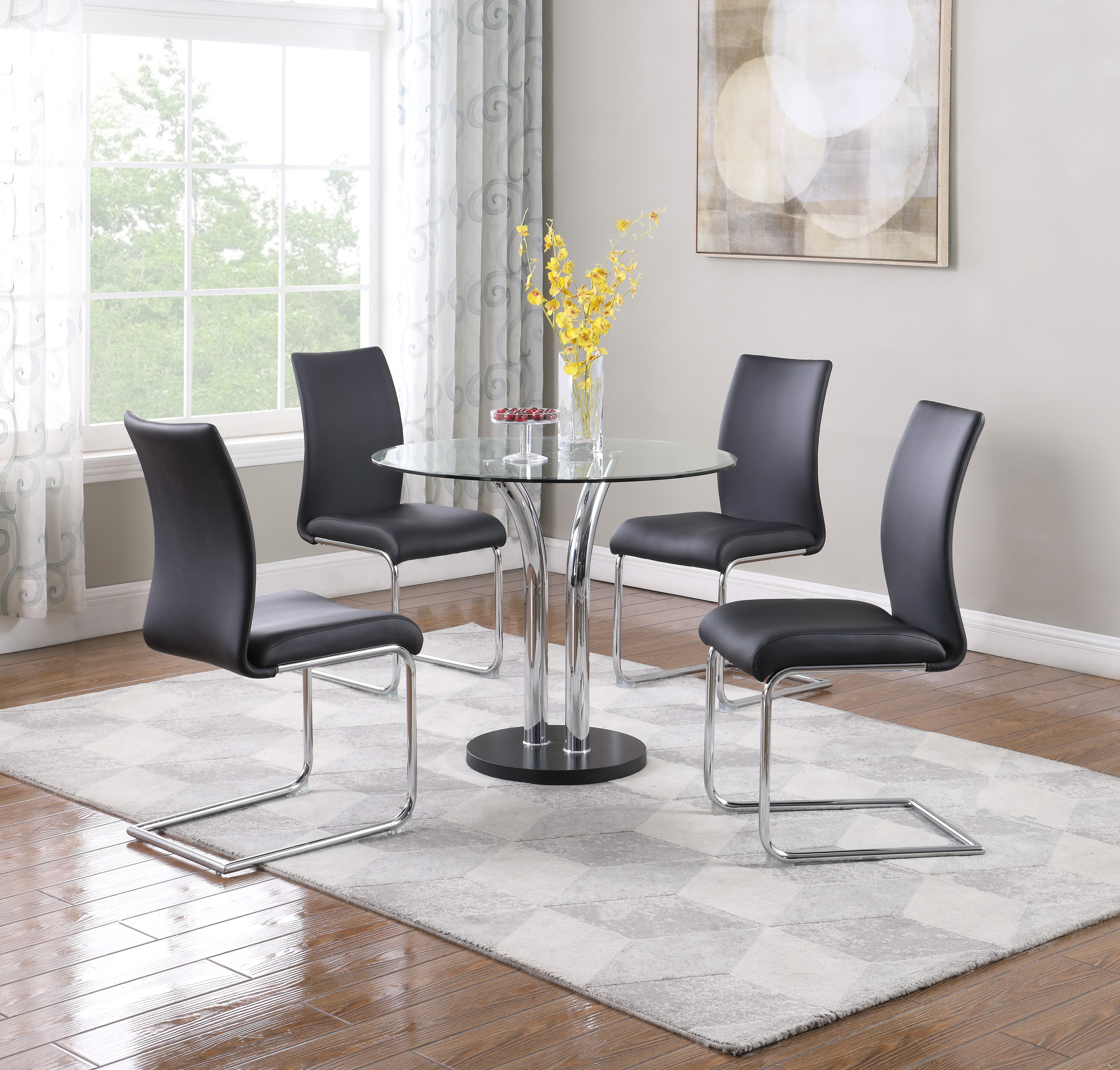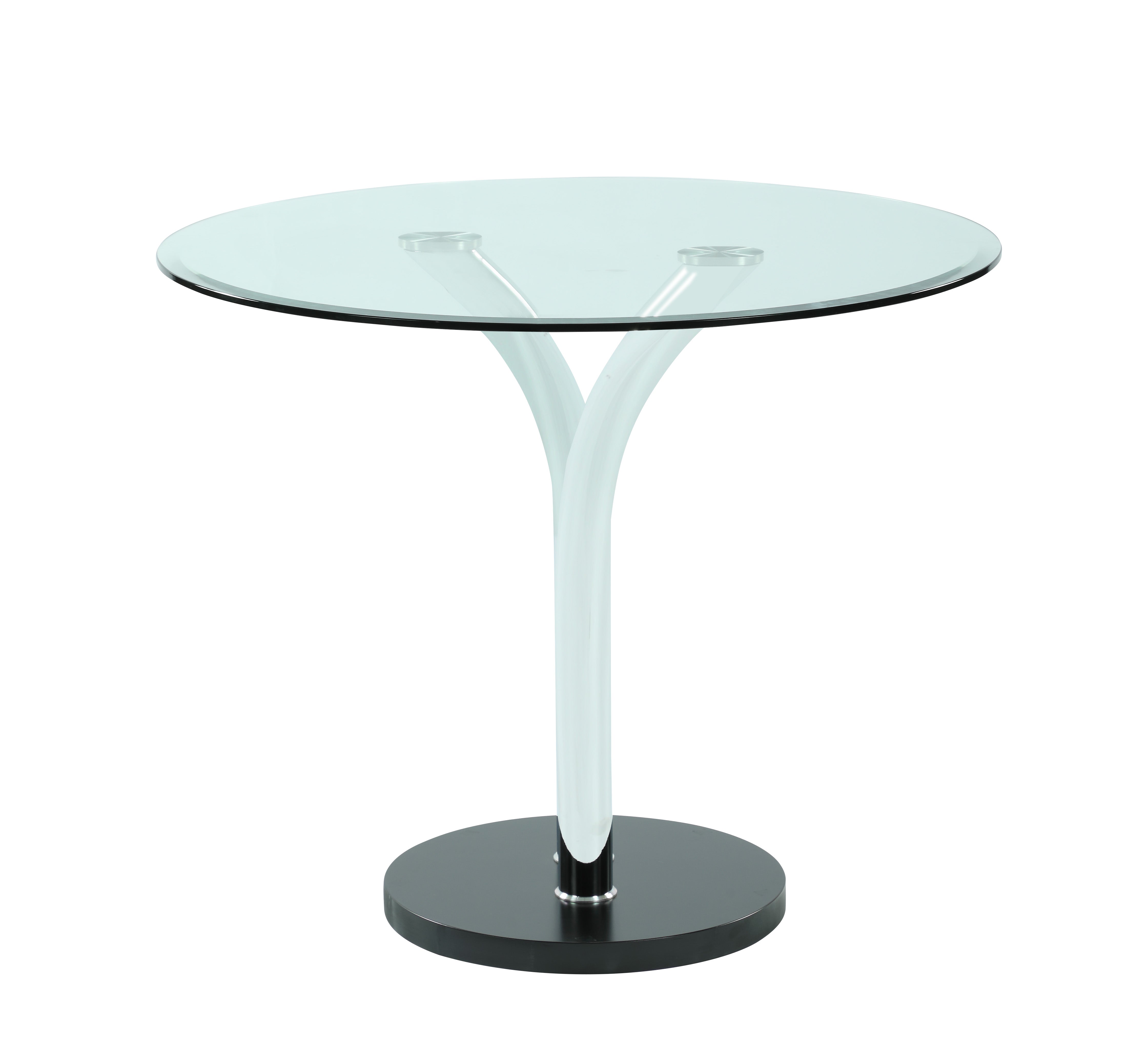 36" Round Clear Glass top Bistro Table features a chrome and black glass base that can be matched with a variety of chairs to fit any household.
