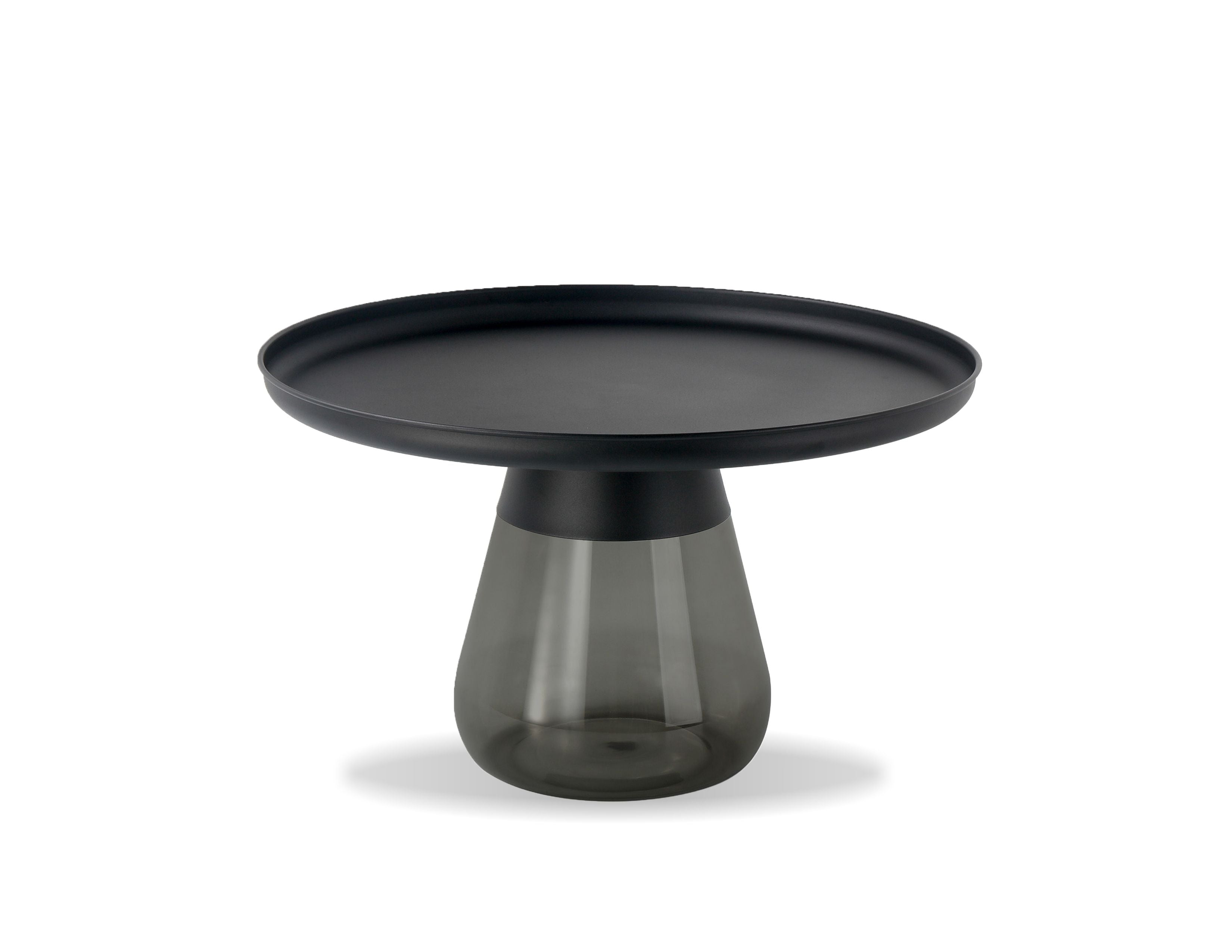 The Duverre series is made from beautifully hand blown glass and light weight spun aluminum tops. They pair and nest beautifully together for statement or just as a single table on its own. You can choose from smoked glass or transparent green bases and choose tall tops or low in powder coated matte back or brushed gold electroplate.