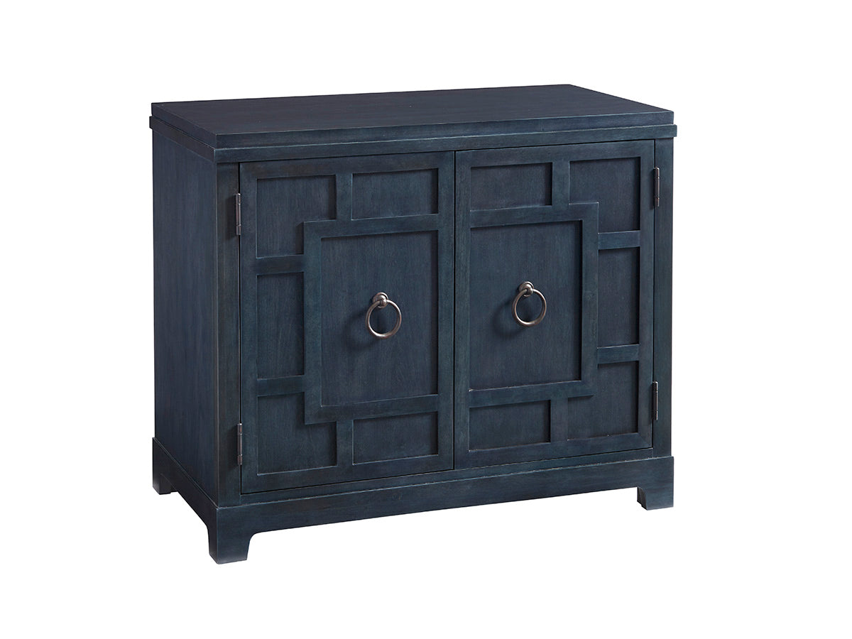 The 38-inch Collins bachelors chest features a striking geometric pattern of laser-cut fretwork on the doors, behind which are two adjustable shelves and grommets for wire management. This silhouette is available in the Sandstone, Sailcloth, Marine or Seaglass finishes for a totally custom look.