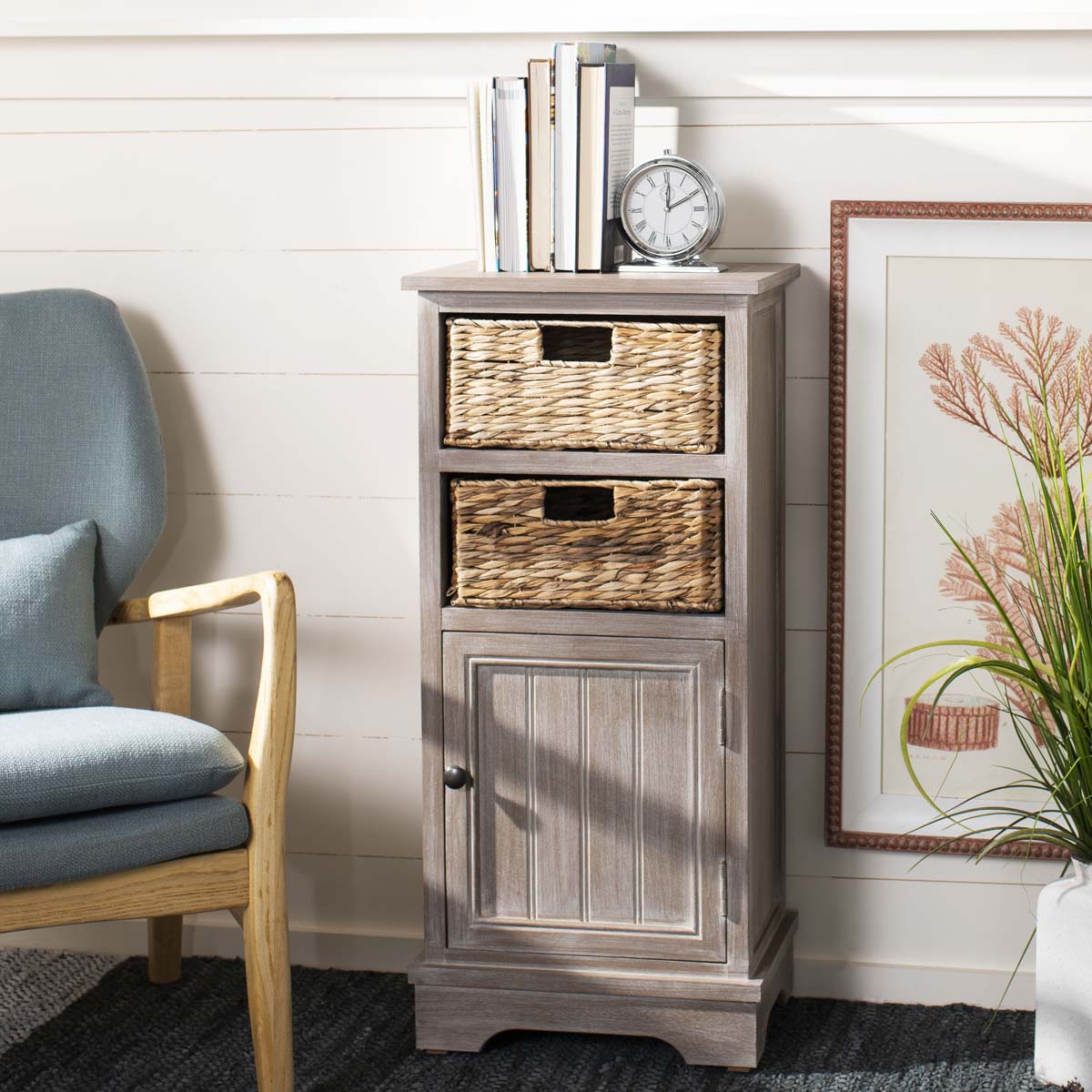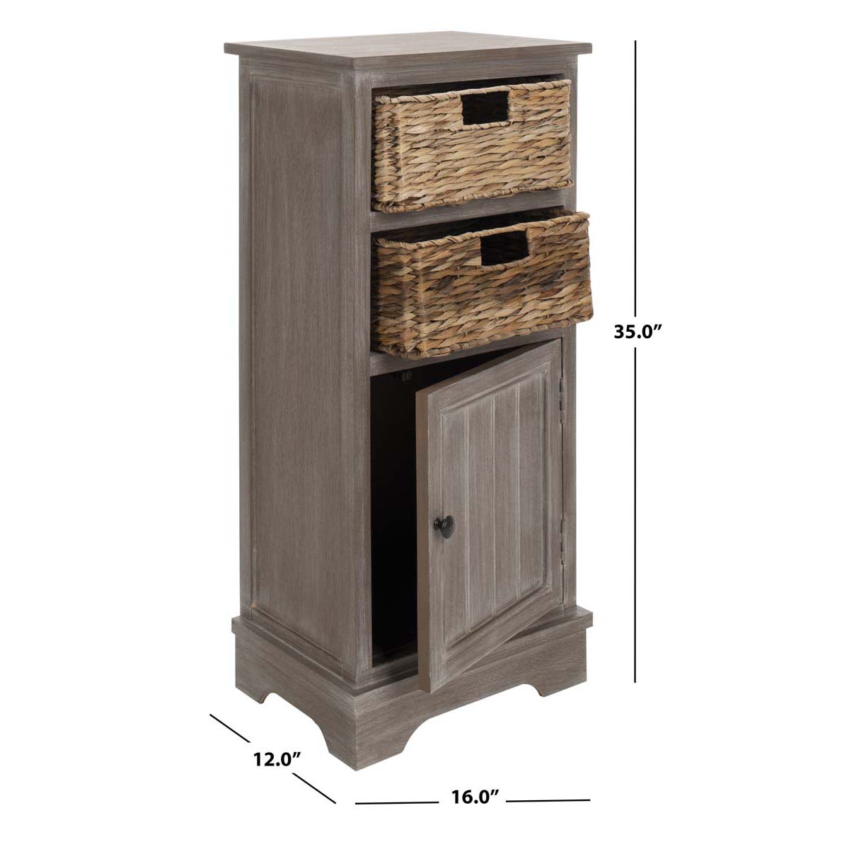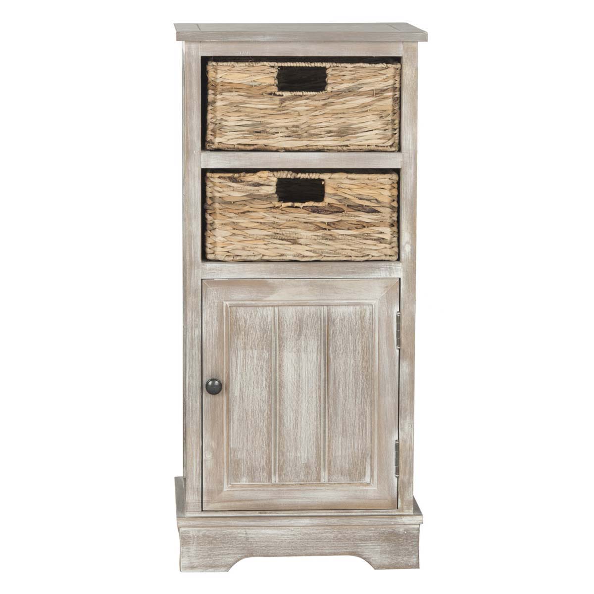 This Connery Cabinet elevates traditional farmhouse charm for today's classic contemporary interiors. Crafted of pine with wicker baskets above a closed door cabinet in a vintage white finish, Connery keeps essentials close at hand yet out of sight.