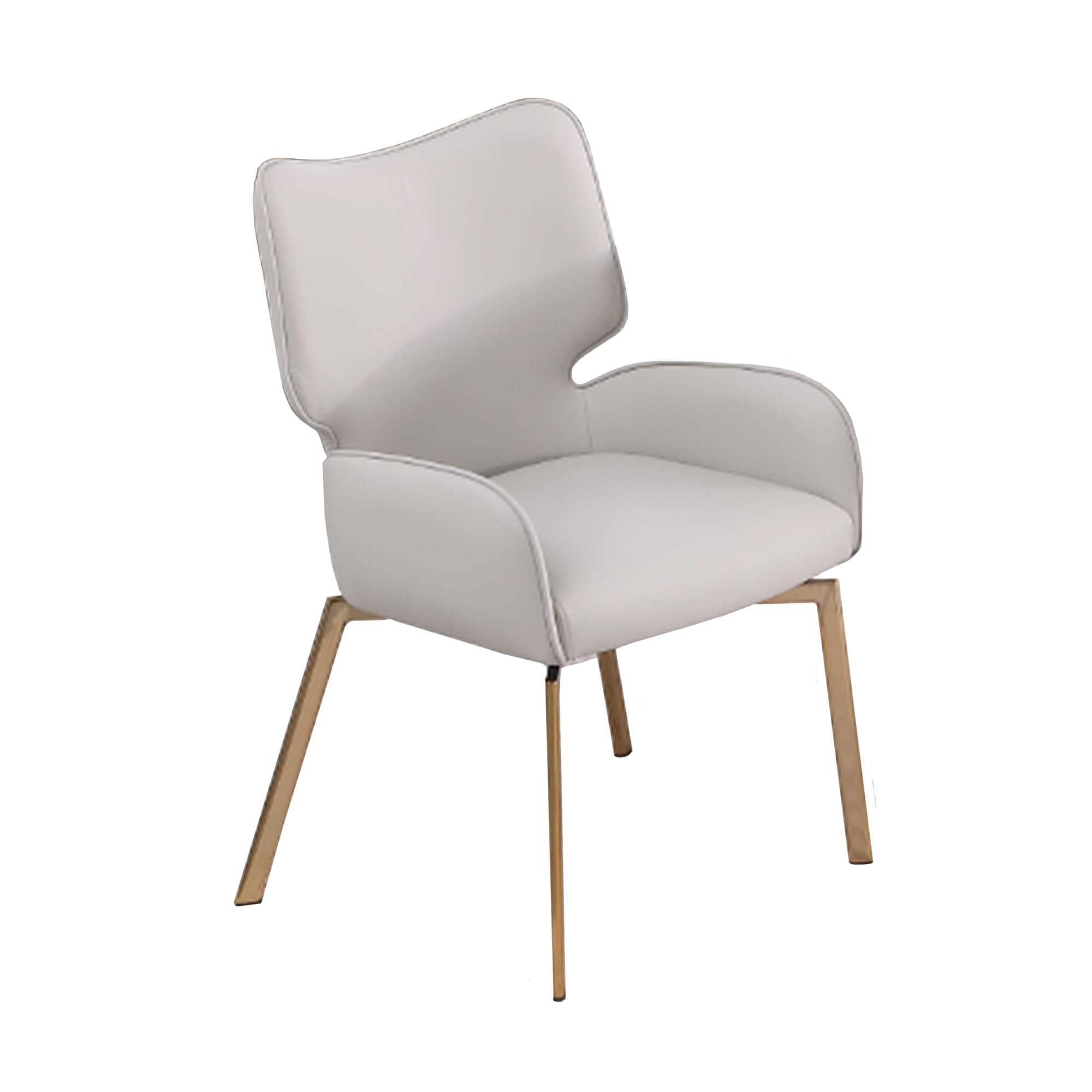 Sit in contemporary comfort in this unique swivel dining chair. Featuring a timeless gray faux leather upholstery, the wide-back and enveloping arms provide seamless comfort. The design comes alive resting atop tapered steel legs in brushed gold, and the memory swivel is an added bonus for an already superb seat.