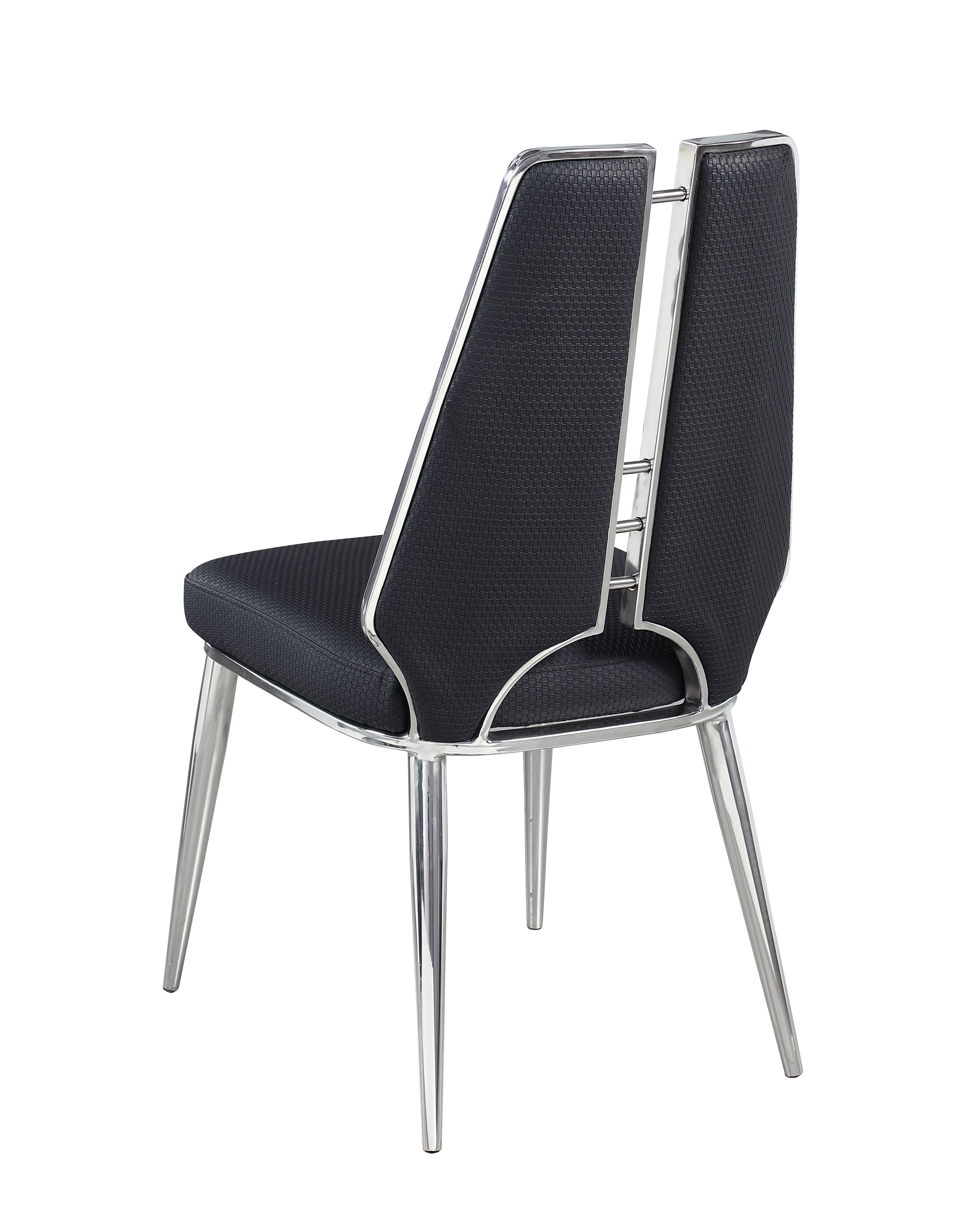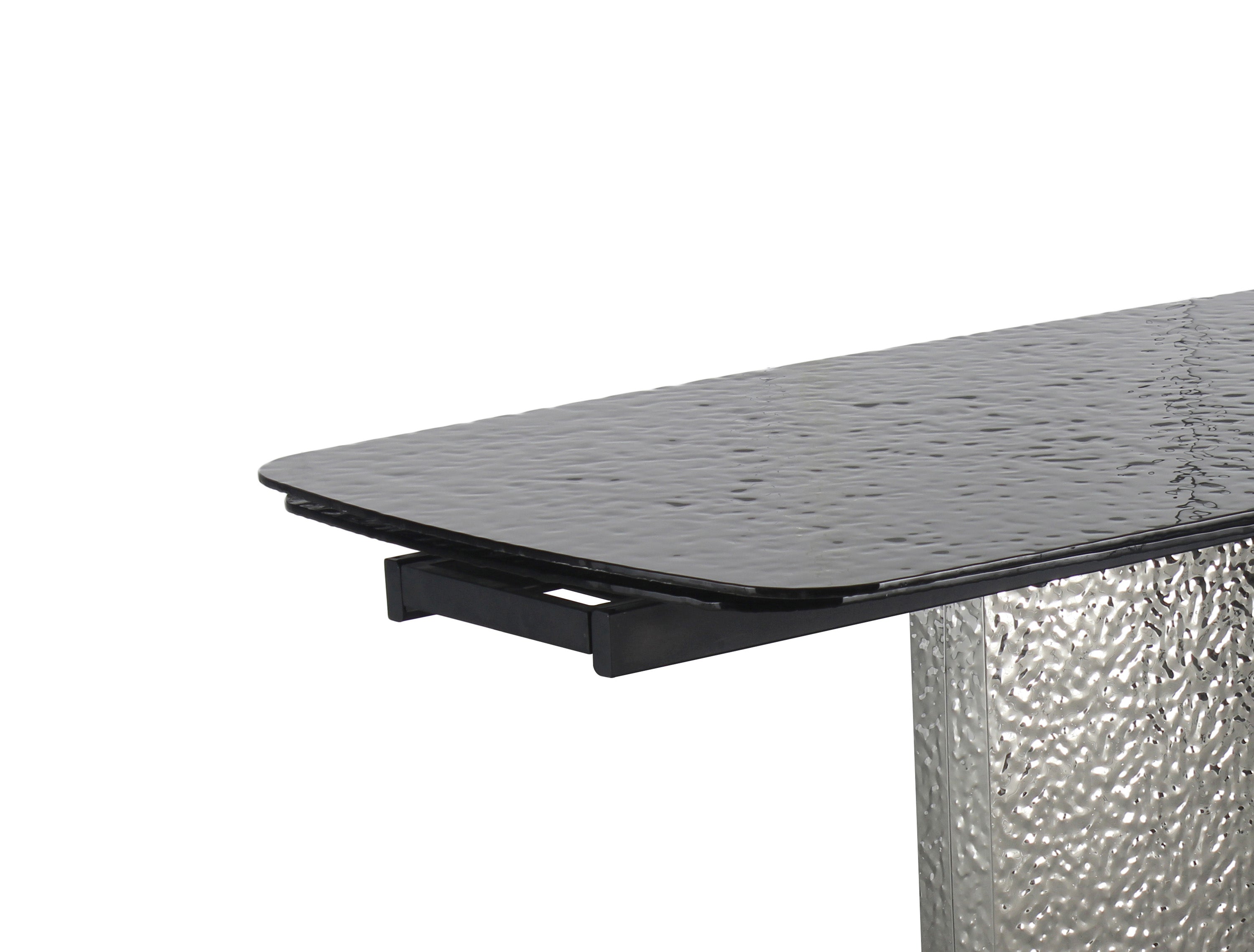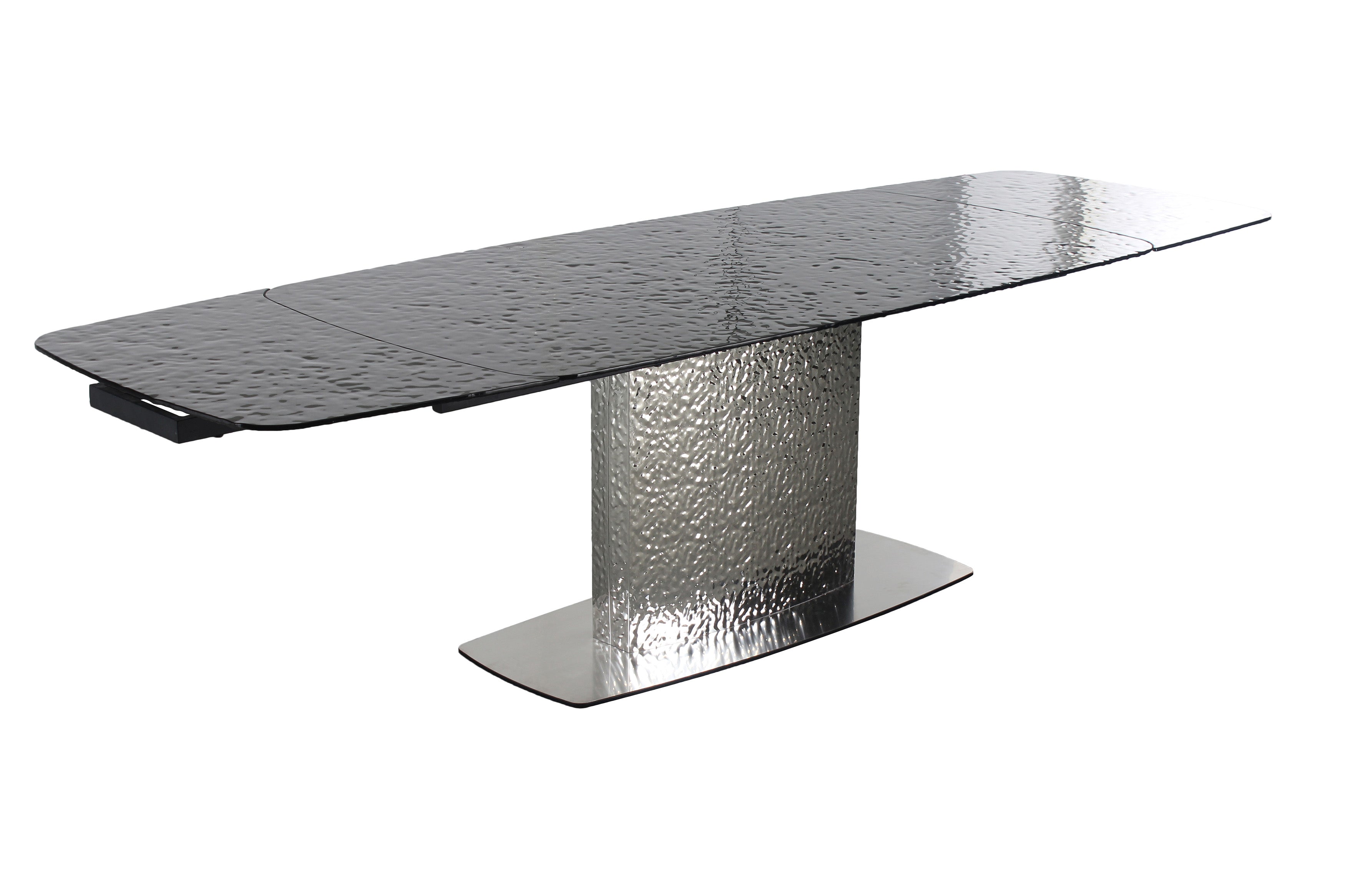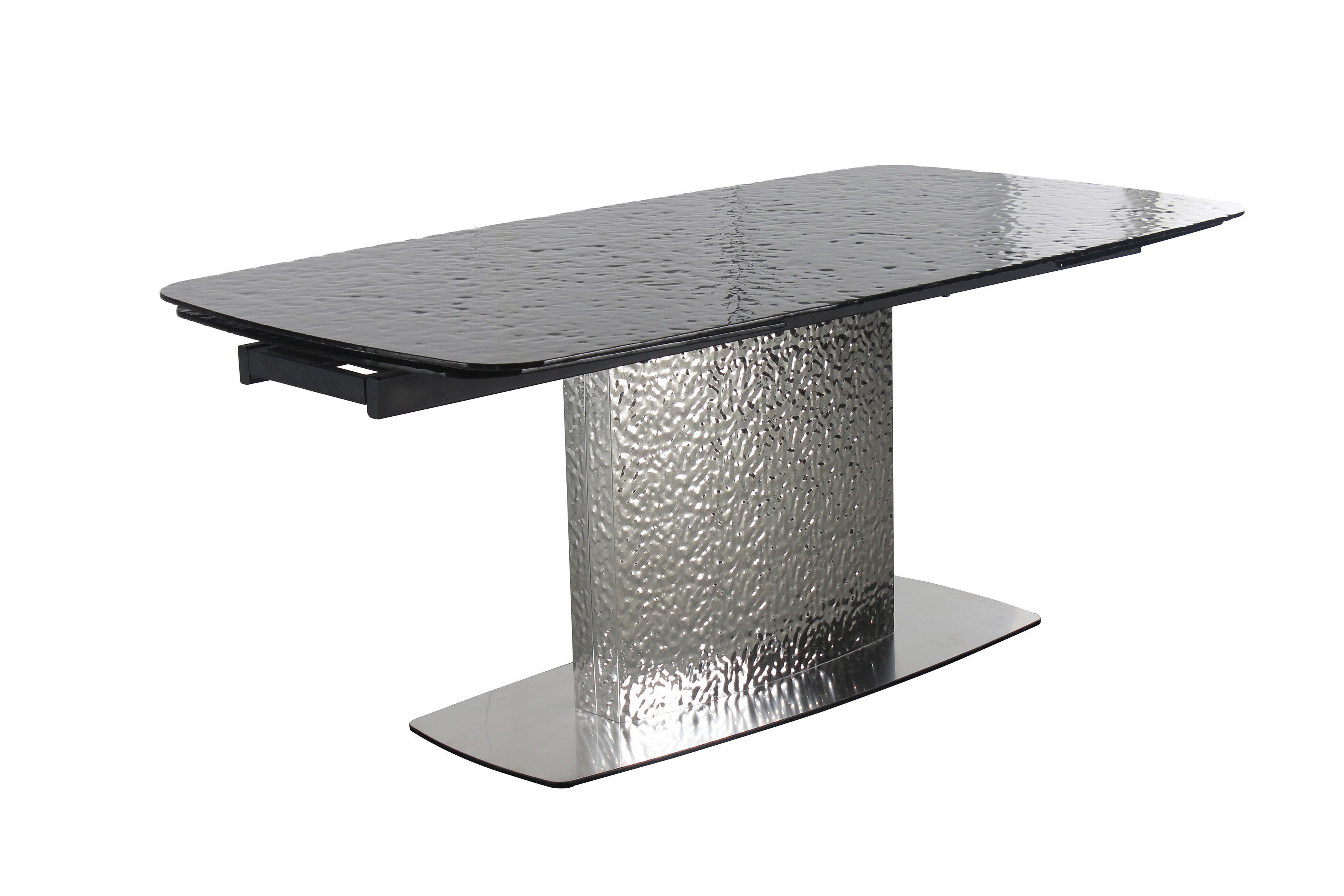 This daringly designed contemporary dining table and matching dining chairs is sure to be a show-stopper in your dining area. An intricate black painted glass finish with a unique dimpled pattern is just the start, with two extensions opening to 110", you can sit in style and comfort and gather the whole party around. Resting on an eye-popping glossy stainless-steel pedestal with a matching textured design, look no further for your next contemporary essential. The matching chairs feature a split-back construction coinciding nicely with a plush black faux leather upholstery. Set atop a sleek polished stainless-steel frame, the chair adds the right touch to elevate the set and add to any space.