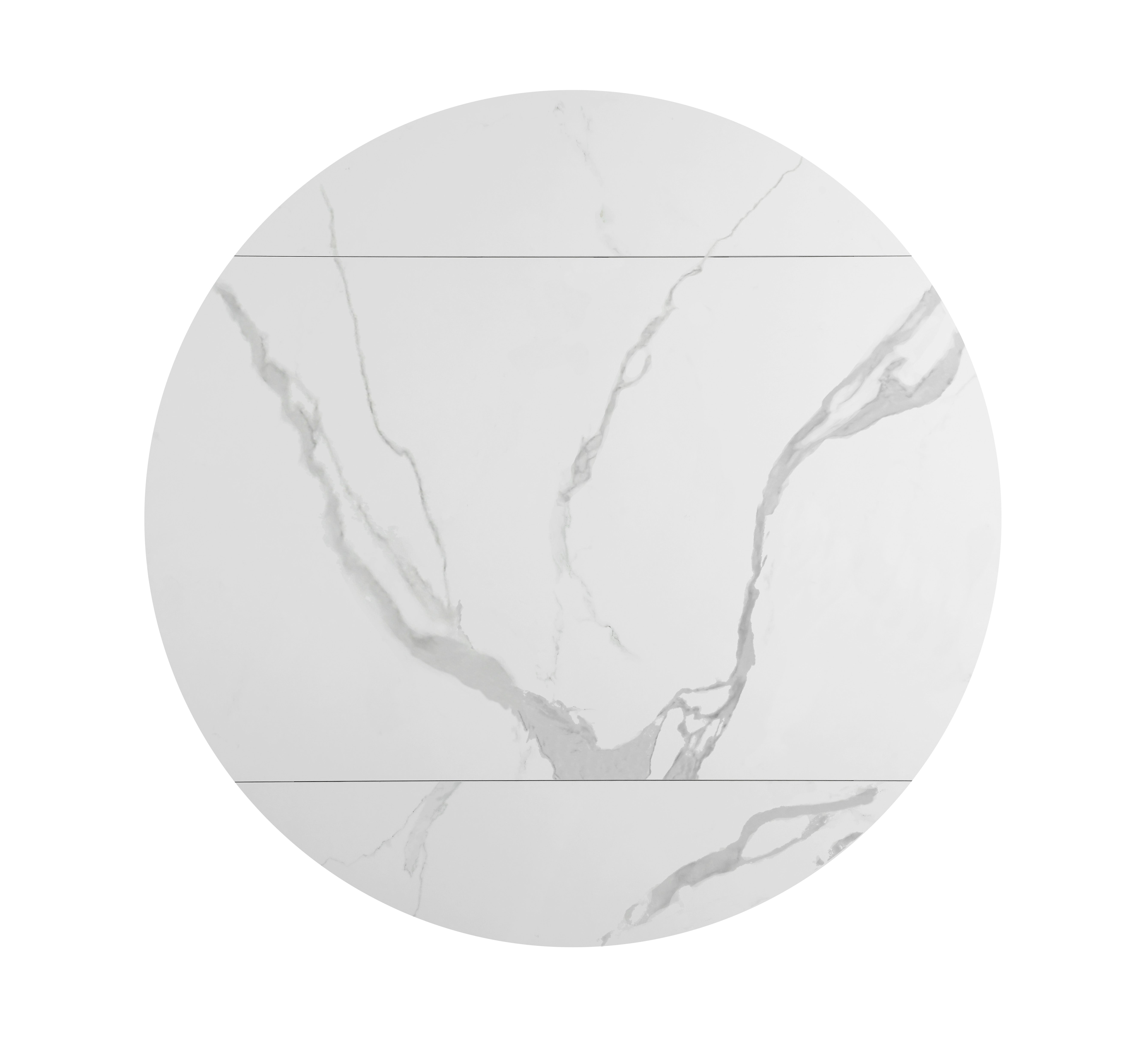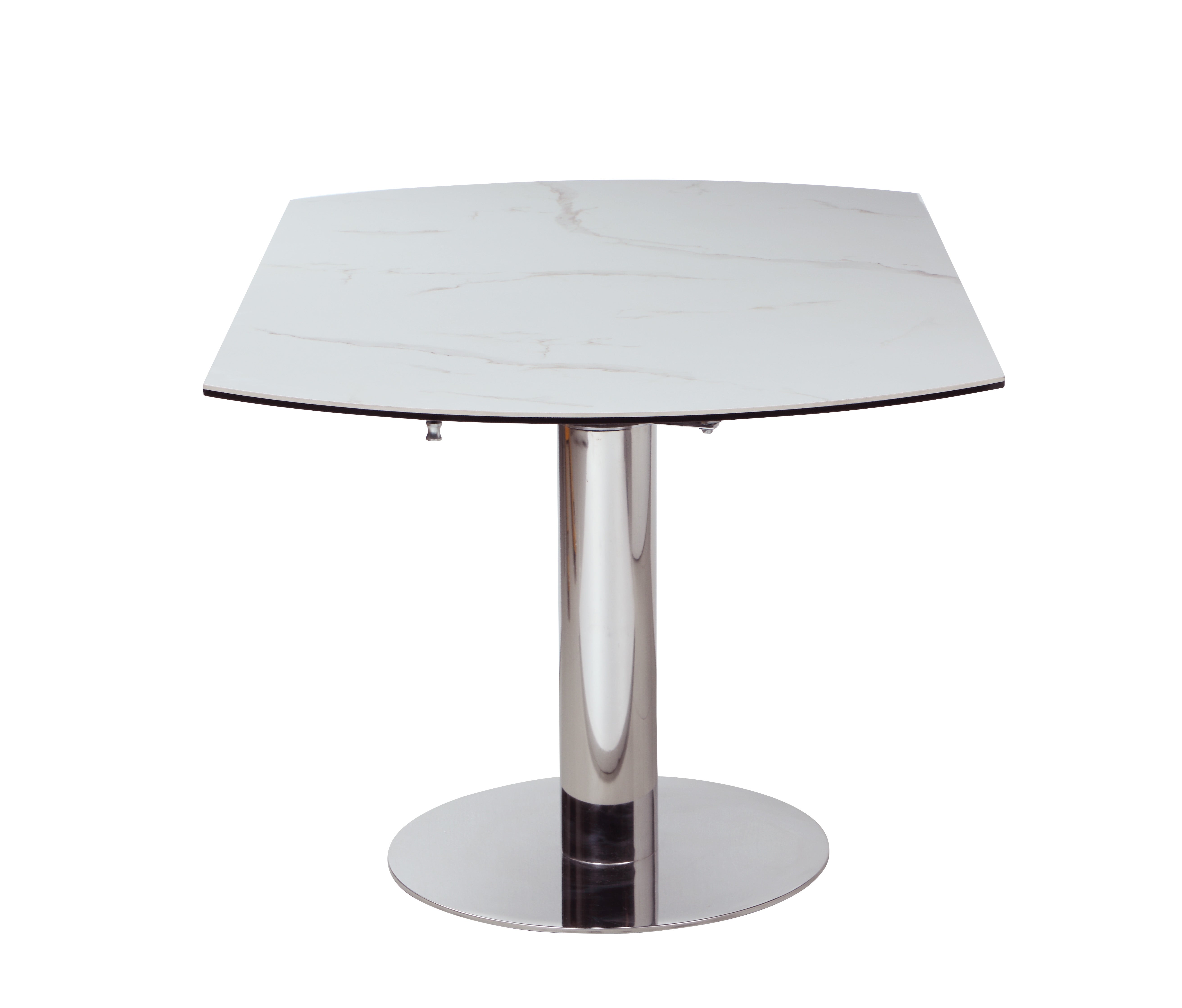 This dining table features a jazz white ceramic top that is scratch, heat and stain resistant, extendable with one simple, circular motion from a bow-end to a full round dining surface, set on a polished stainless steel pedestal base and floor plate.