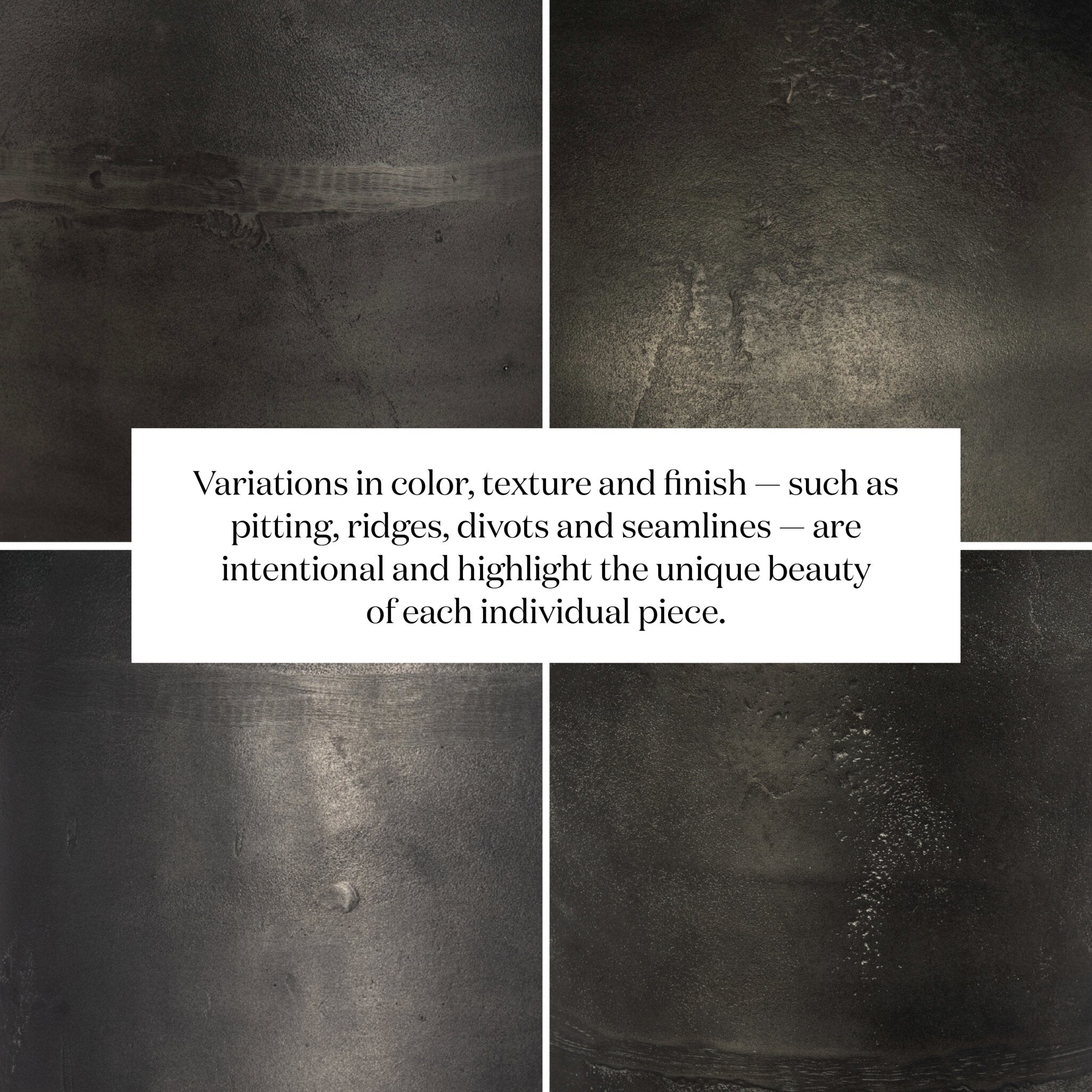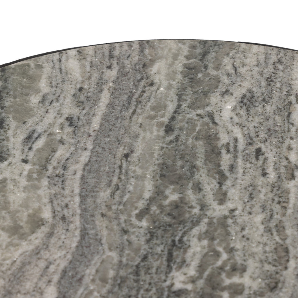A sculptural play on shape. Hammered grey-finished aluminum base supports a rounded tabletop of grey marble with natural veining.
