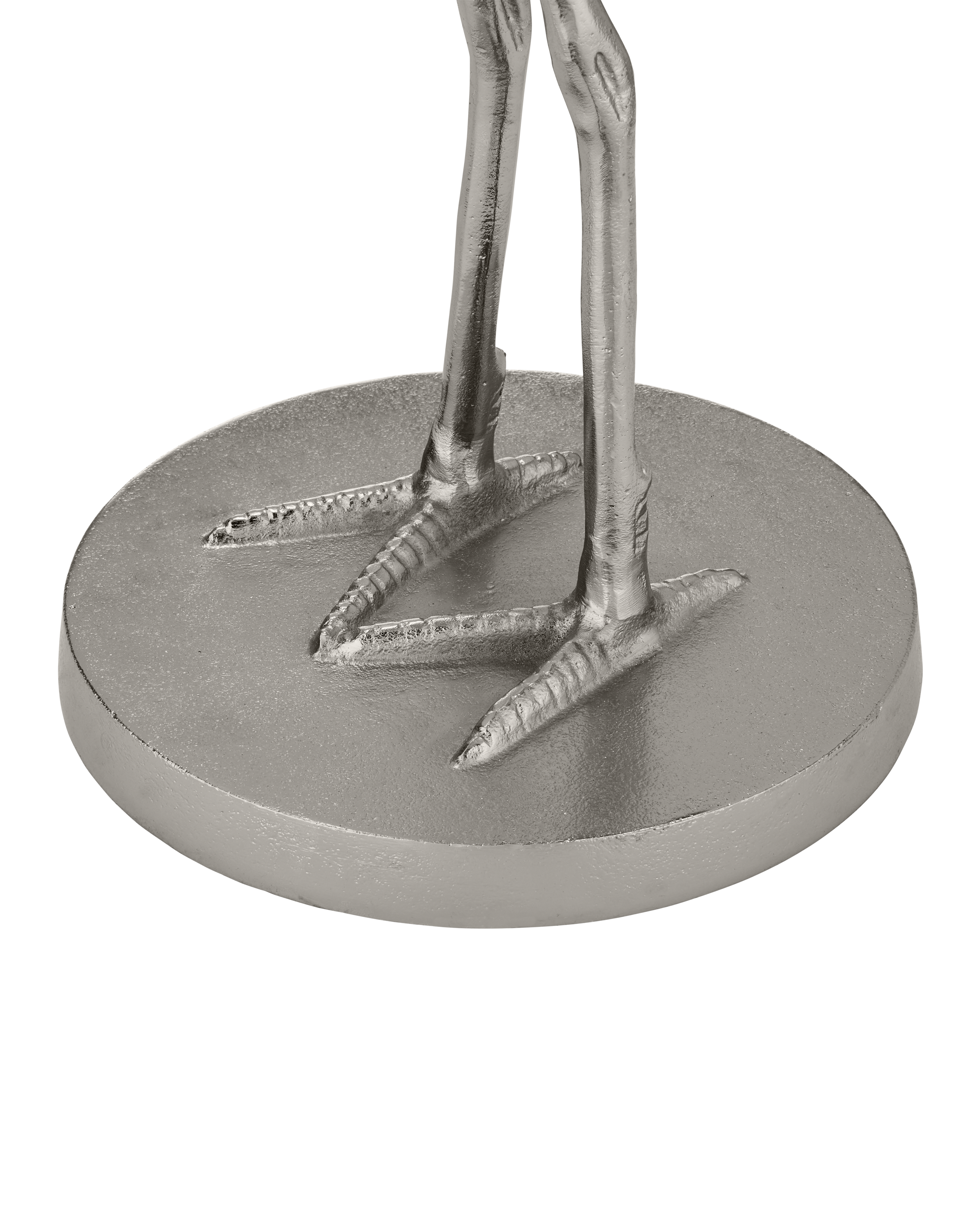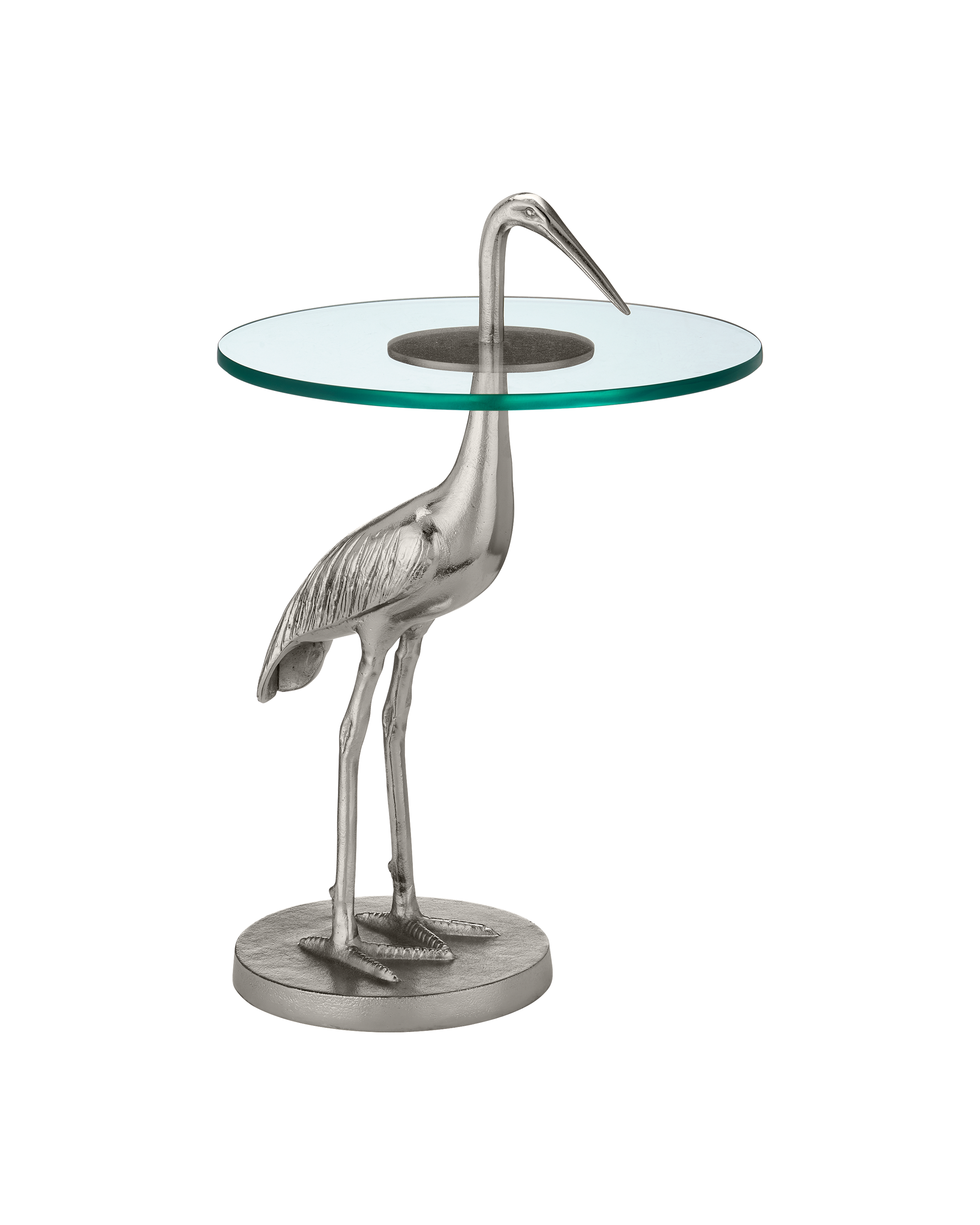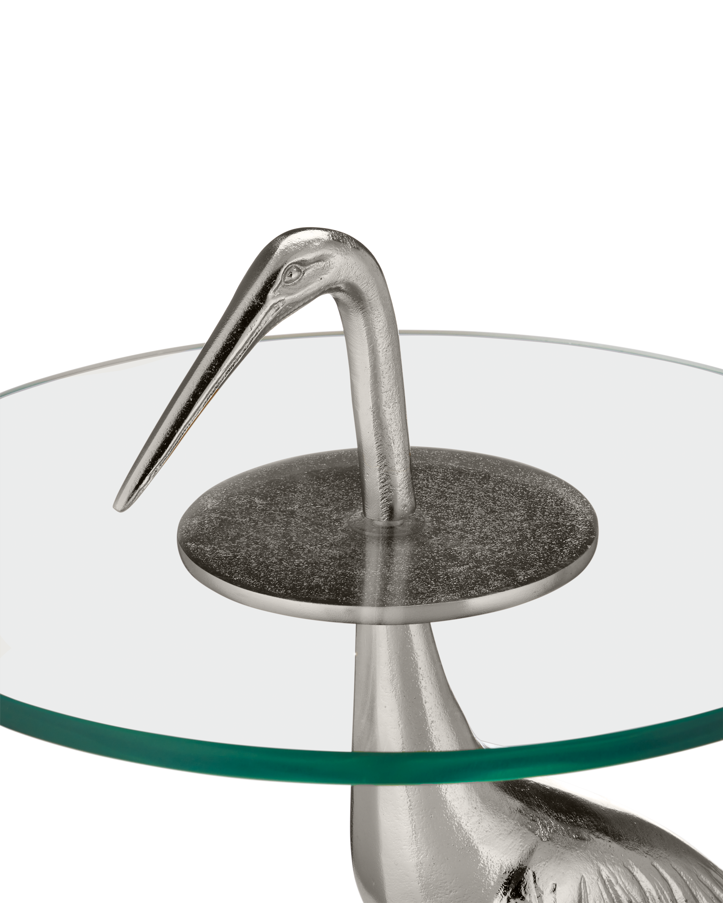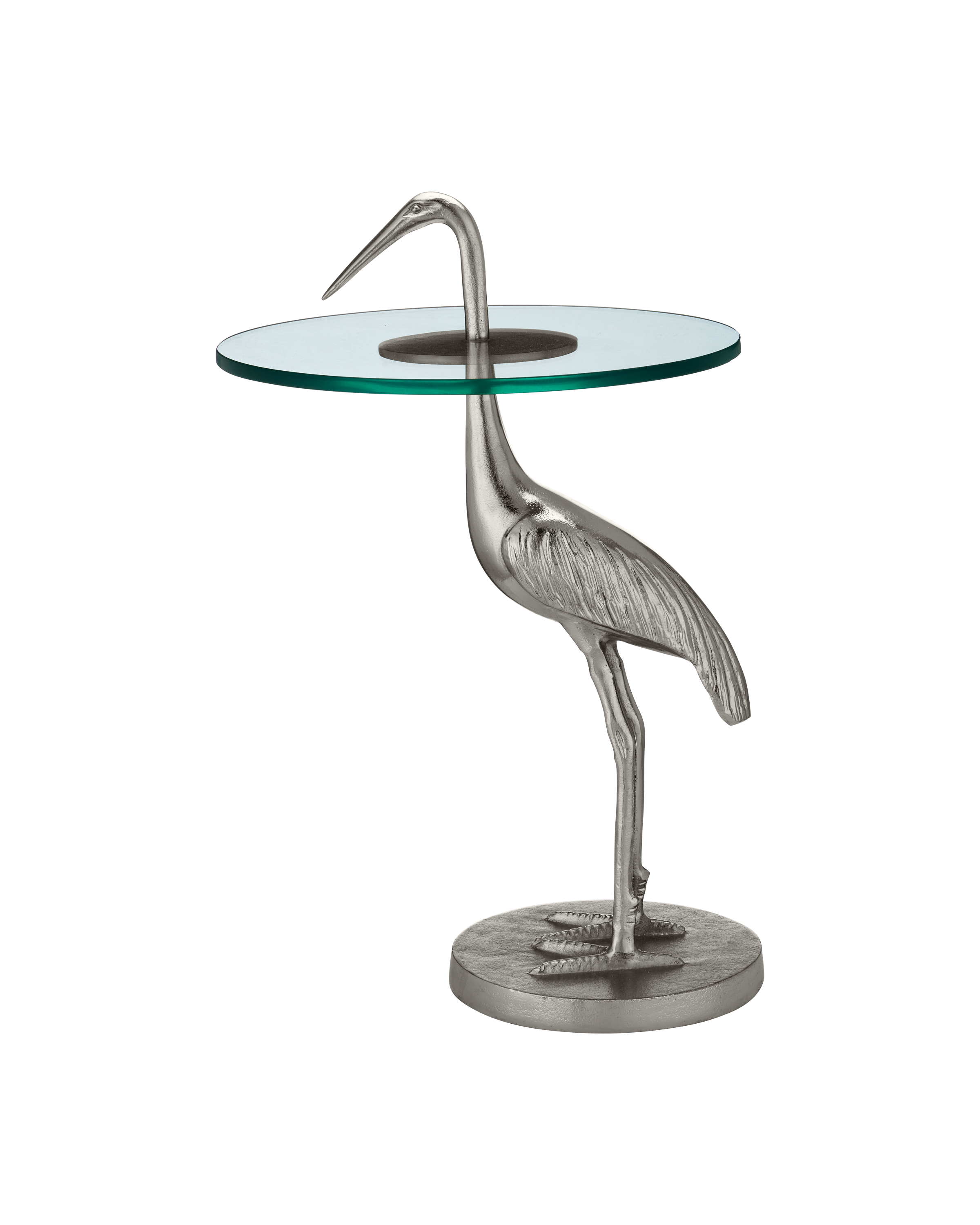 The Crane Silver Accent Table has an artfully realized bird that is made of cast aluminum covered in a nickel finish. The table is all the more whimsical given the glass top is fitted to the crane at a narrowing point on its neck. The table, which ships without the glass top in place, is easy to assemble, as the crane's head unscrews so the top can be inserted. The base edges have slight bevels on the top and bottom.