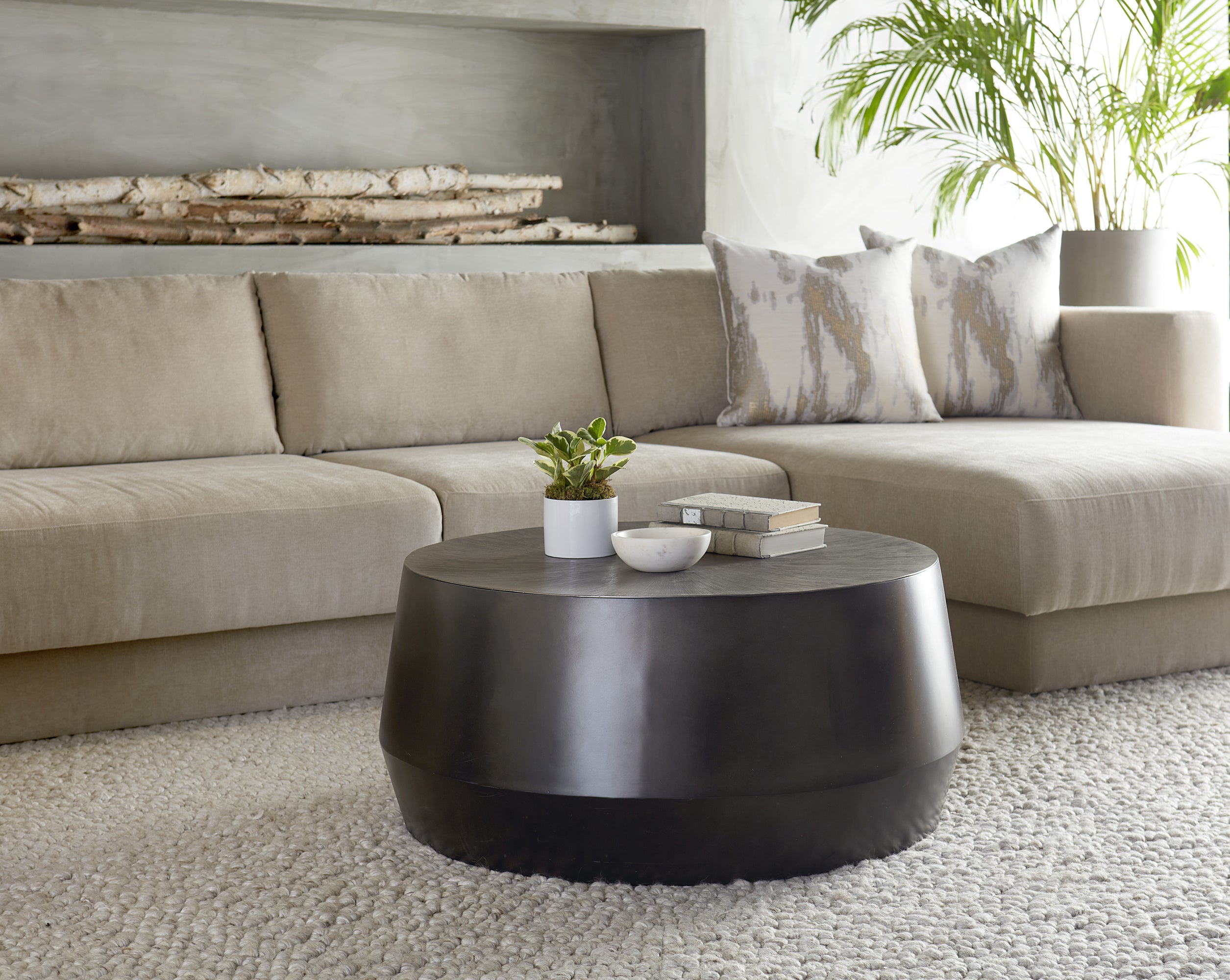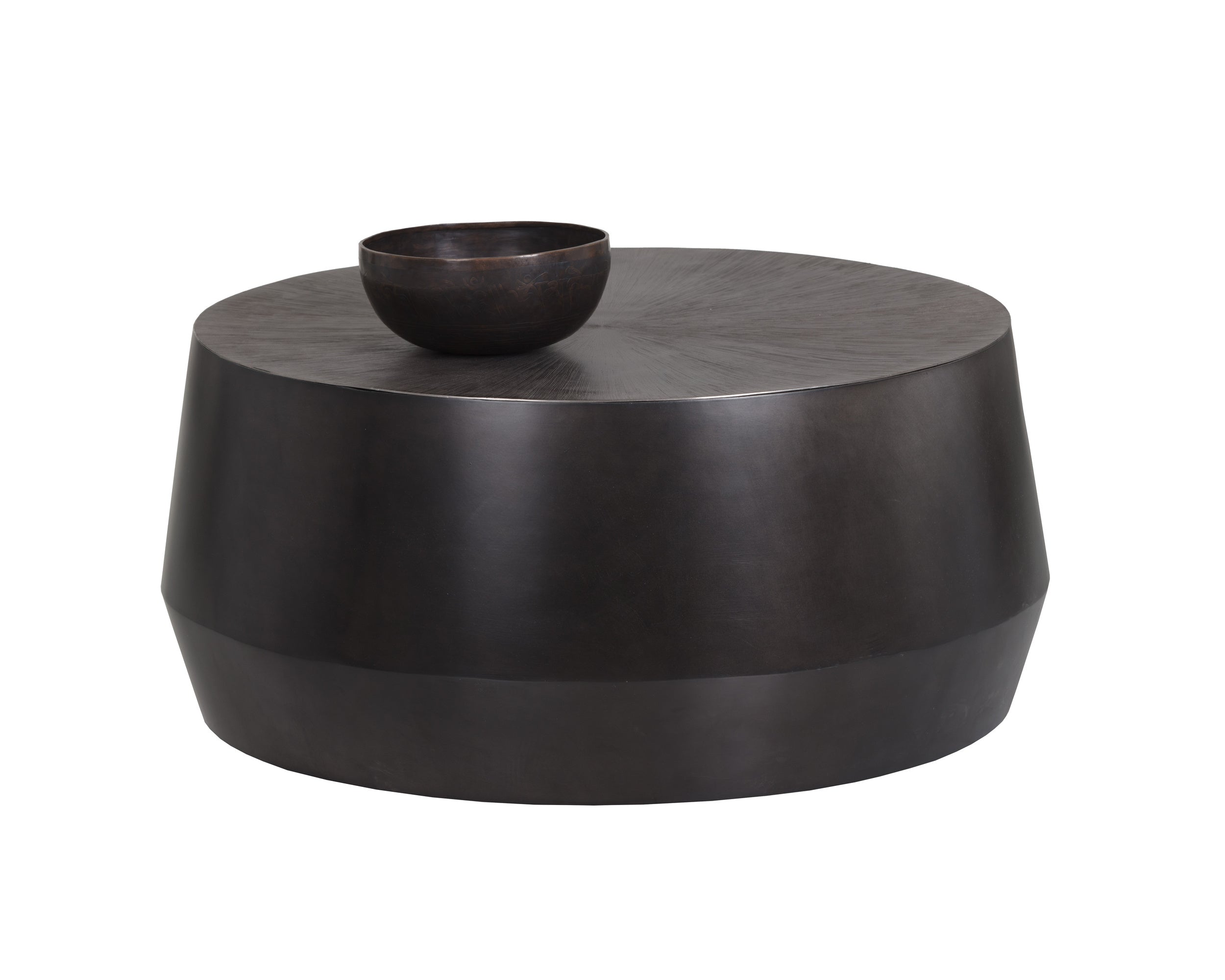 A captivating coffee table from our Ferrous collection with an alluring bronzed gunmetal finish. Features a hand-etched and hand-hammered top with a drum style base. This piece will add a contemporary flair to living, lounge and office spaces. Made in India. With refined craftsmanship, this design was brought to life by skilled local artisans. Due to the nature of handcraftsmanship, unique imperfections such as fissures, markings and variations in colour and shape are welcomed and appreciated characteristics for a truly one-of-a-kind piece.