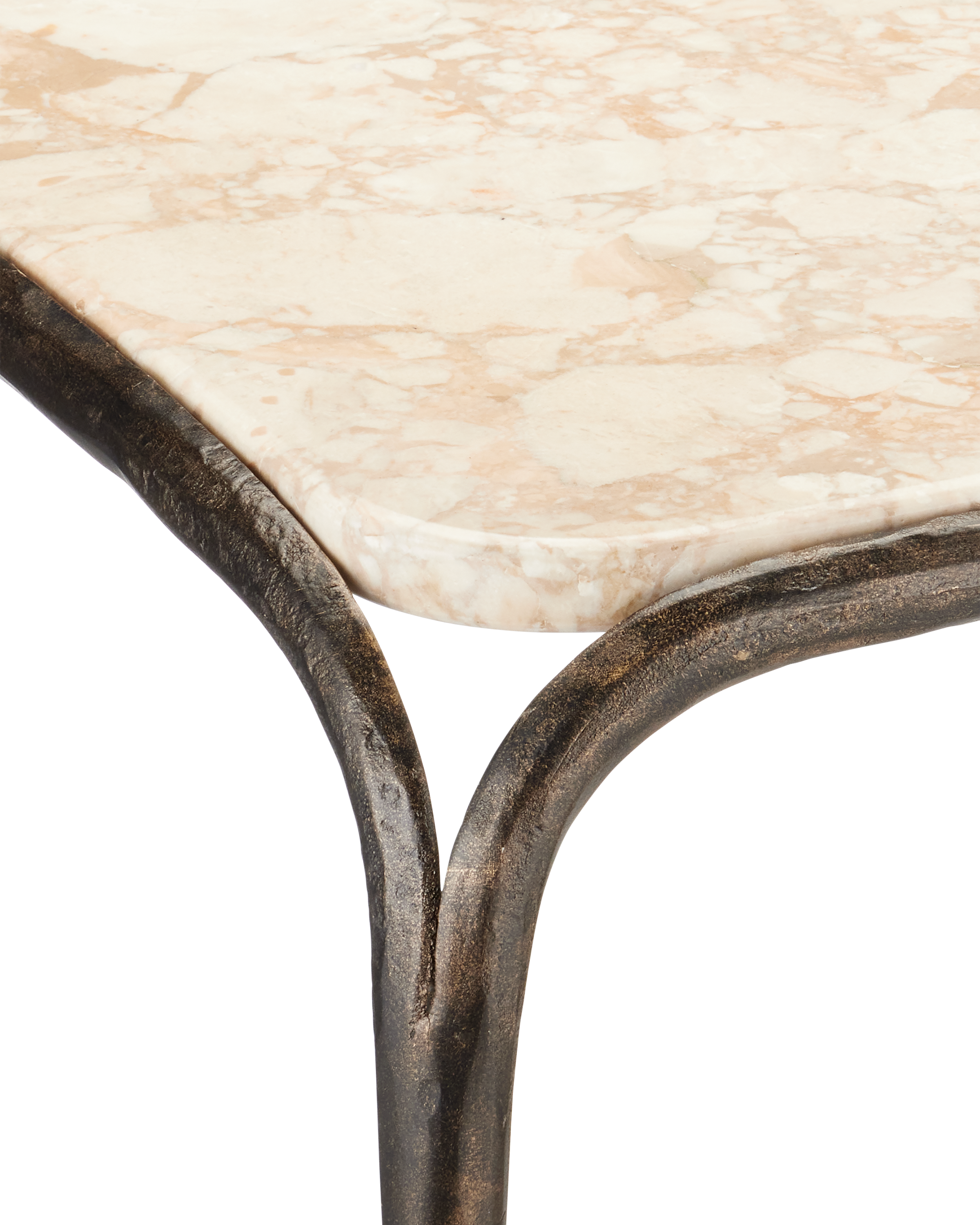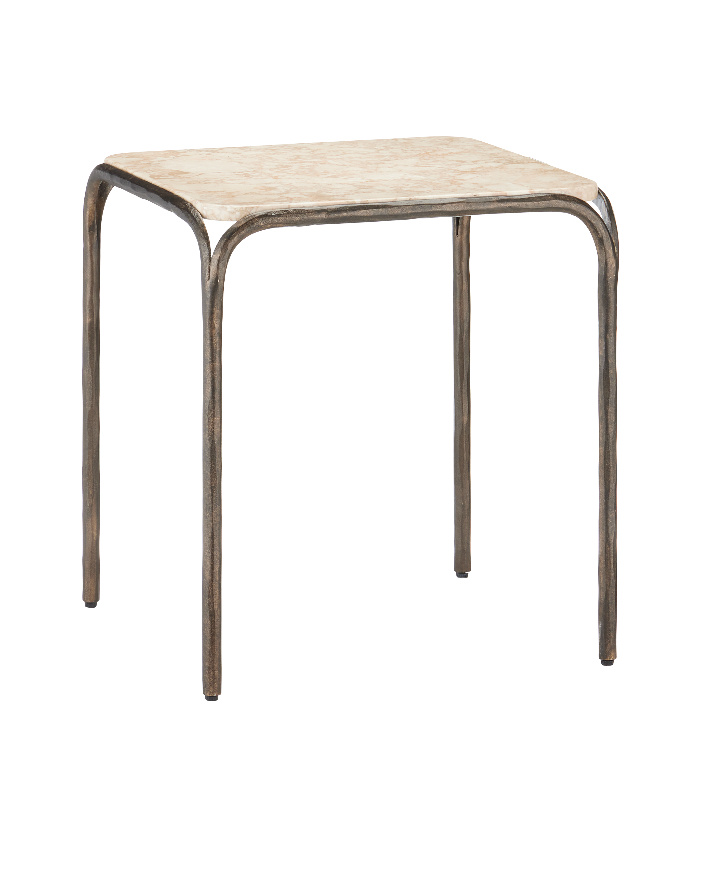 Combining industrial elegance with artisanal craftsmanship, the Crema Side Table is made of metal in a warm bronze finish with a hand-forged appearance that adds depth to its streamlined silhouette. The frame folds down and away from a crema marble top at the corners to create a forked design that matches the ends of the stretchers where they meet the legs.
