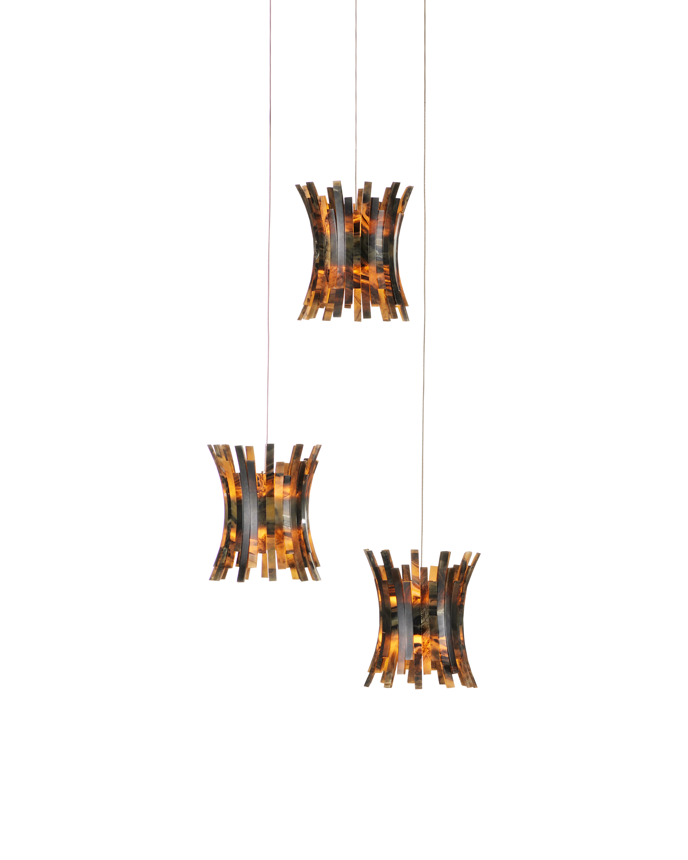 The shades of the Alsop 3-Light Multi-Drop Pendant were inspired by tortoise shell bracelets that were popular during the era when Hollywood glamour was at its height. Made of composite with faux-horn surfaces, the shades on the brown pendant will be warm elements in a space. A refined aspect of the design is how the ribs arc outward and how they are staggered for greater texture than their surfaces bring. The canopy of this piece is luminous in a painted silver finish. This fixture is among Currey & Company's introduction of cluster lights, which includes multiple configurations.