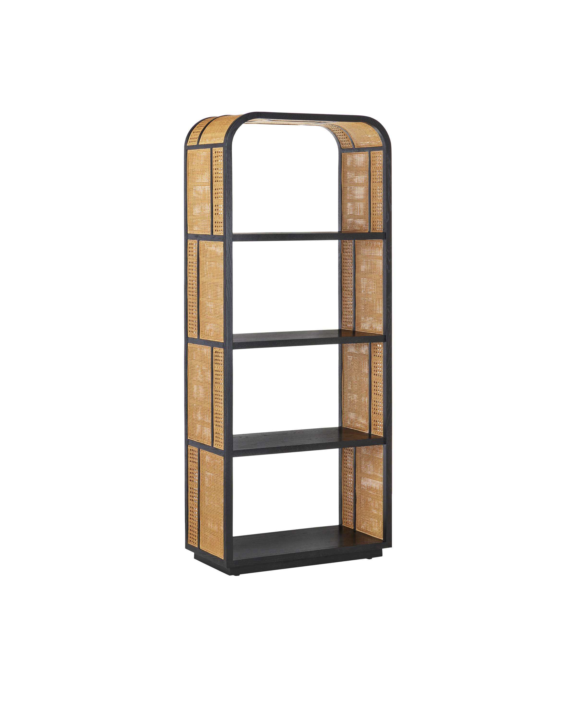 The Anisa Black Etagere has a trick up its sleeve: because the frame that is covered in oak veneer in a caviar black finish is fitted with rattan cane panels, it is artfully attractive from all sides. The larger rattan sections are in a radio weave and the smaller ones in an open weave to mix it up and bring the black and tan etagere a dynamic textural quality. The contrast of the sleek, dark frame and the straw-colored material sets this firmly in a black and natural style story.