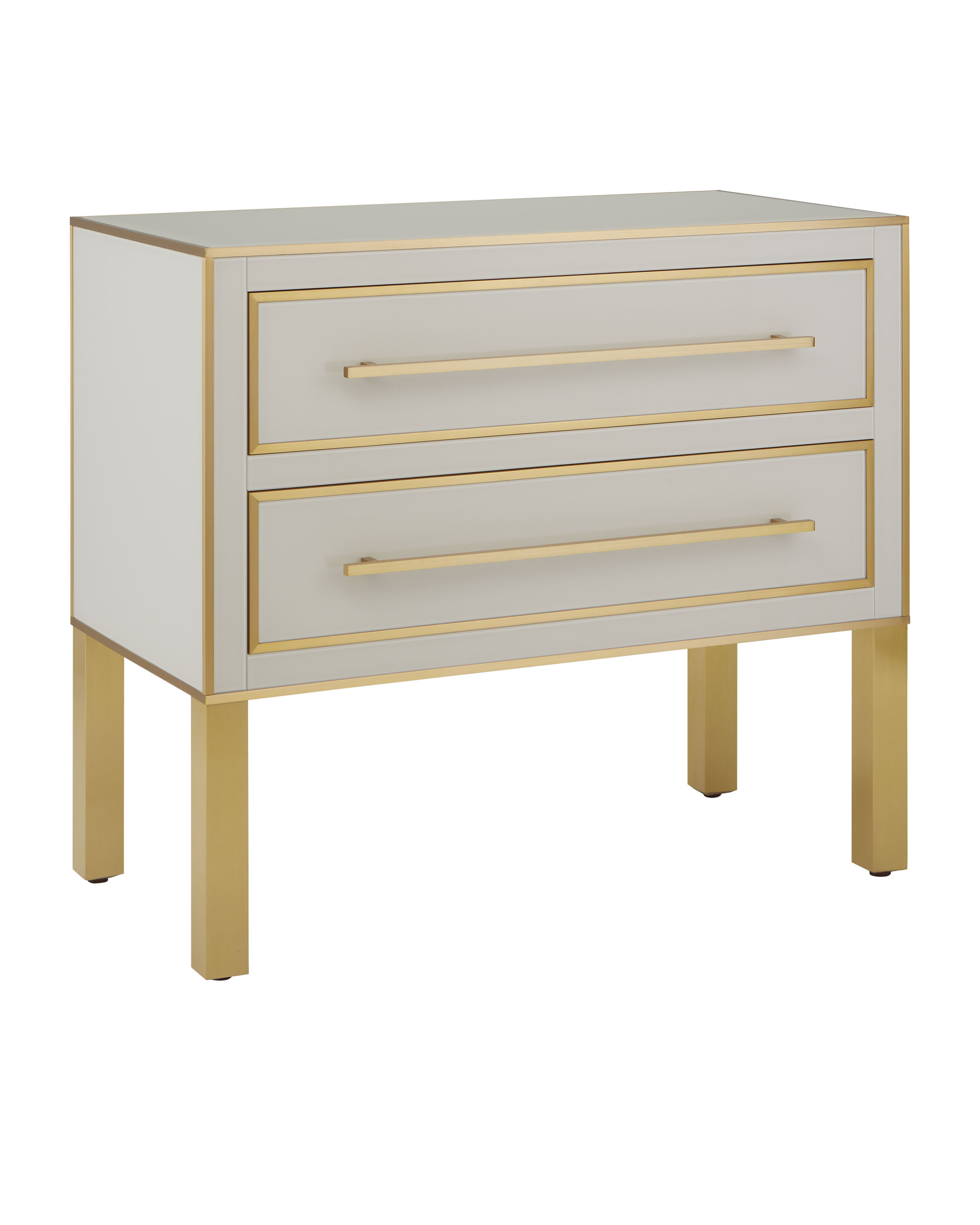 The Arden Ivory Chest is inspired by a 1970s reverse-painted glass antique our director of furniture Aimee Kurzner found at the Paris flea market. The chest features ivory reverse-painted glass panels on the top, front, and sides with solid brass trim, hardware, and legs. The ivory and gold chest has a beveled top, and drawers with soft-close glides.