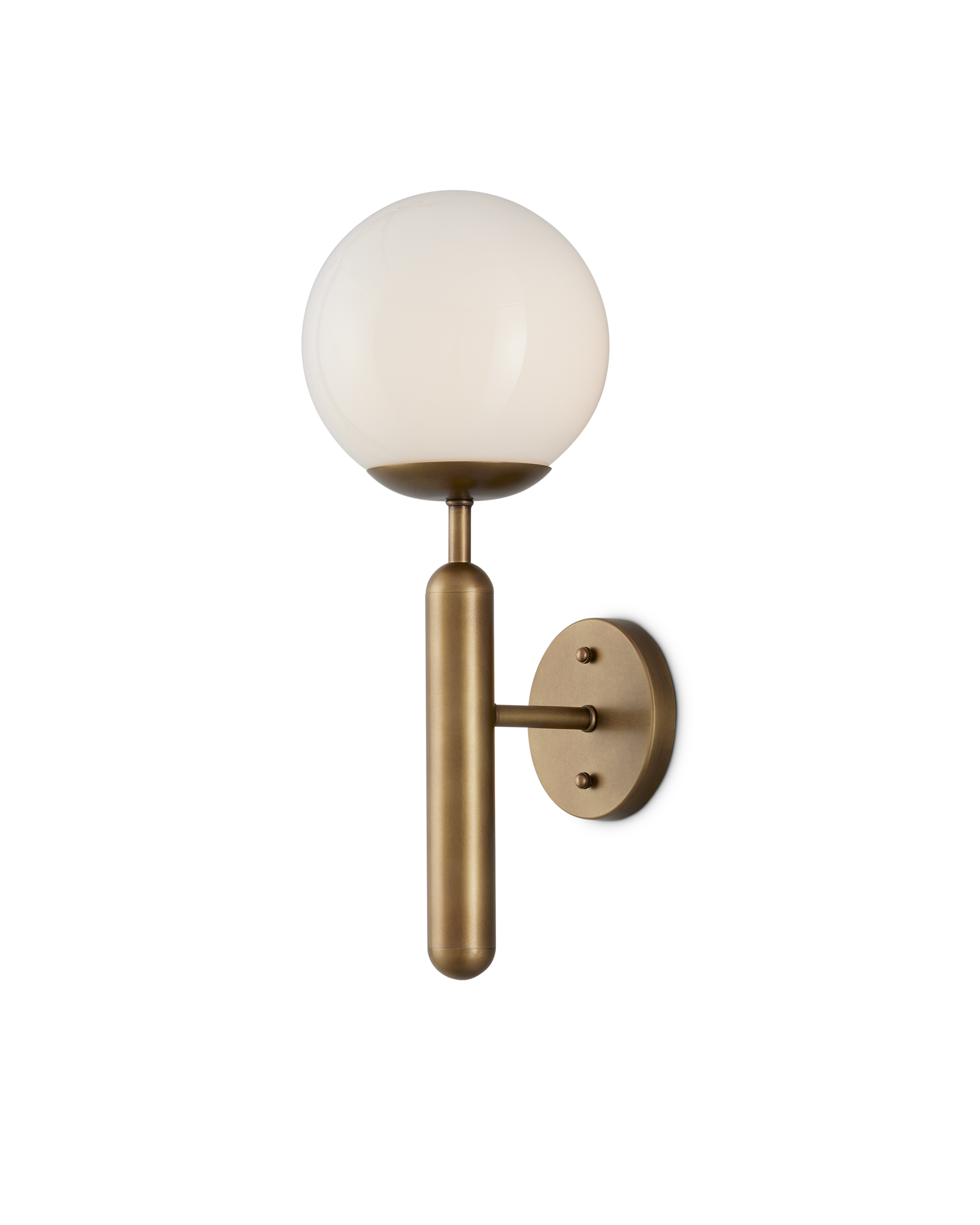 The Barbican Single-Light Brass Wall Sconce has a tubular stem that balances a cup-like shape into which a translucent glass globe nestles. Also meant to keep the design minimal is the button-like hardware that Ian Thornton designed to be as streamlined as possible. This gold sconce is included in our Bagno Collection of damp-rated lighting that is designed specifically for bathrooms.The Barbican can be mounted sideways to fit over a mirror.