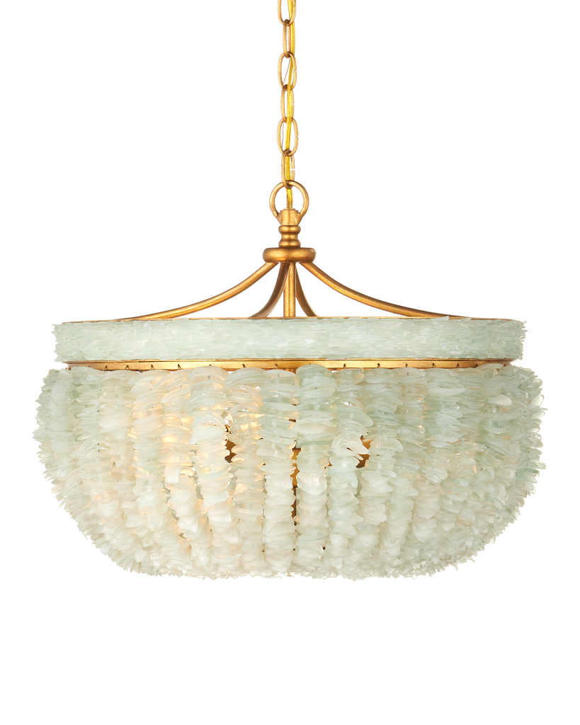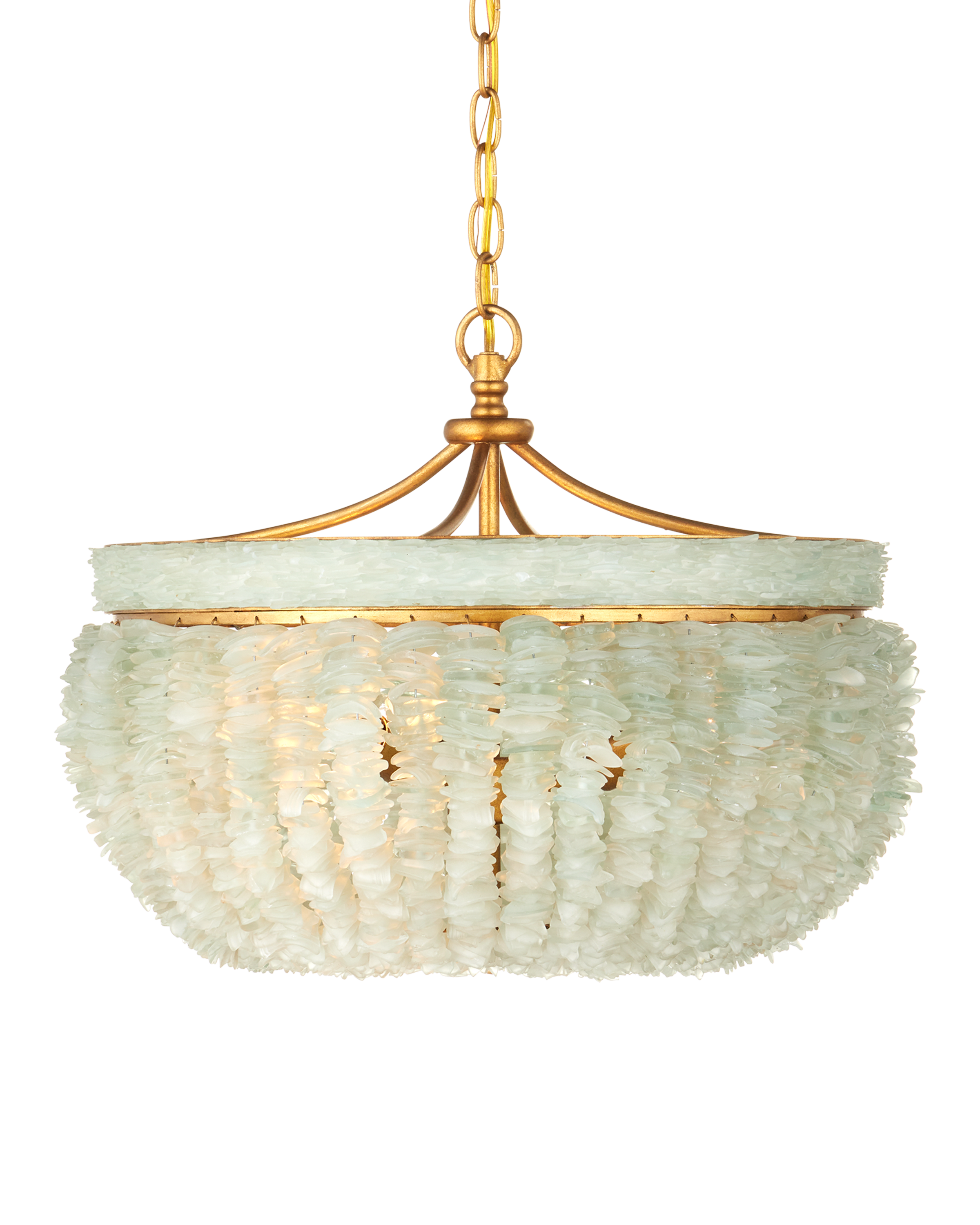 The Bayou Pendant is fitted with a thick layering of tumbled sea-glass in aquamarine and seafoam tones, which will bring hints of the ocean into an interior. The bands that encircle this three-tiered fixture, in a contemporary gold leaf finish, bring the frosted glass pendant a luxurious vibe.