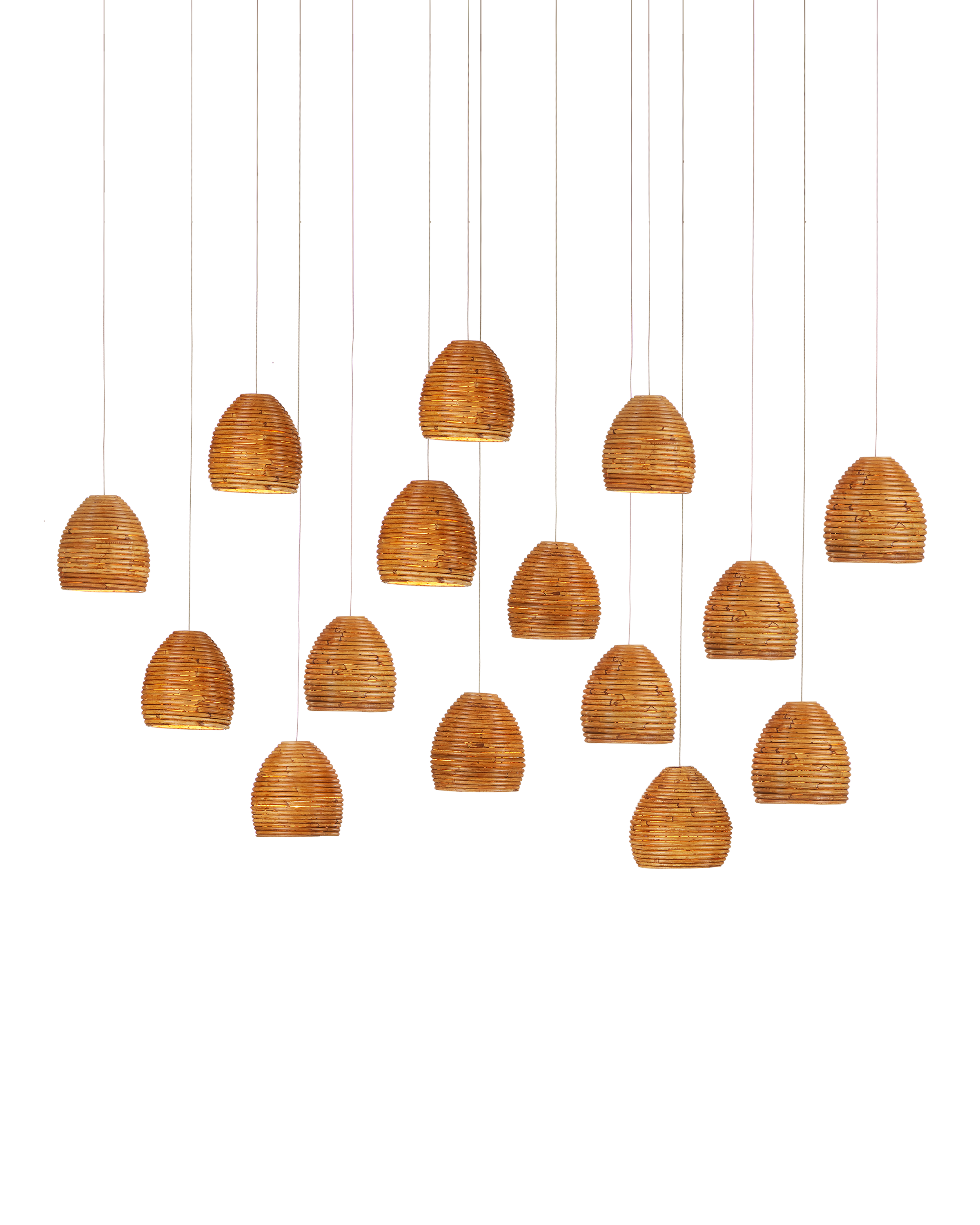 The Beehive Rectangular 15-Light Multi-Drop Pendant has rattan bell-shaped shades. Because the natural material is not perfectly uniform, there are fissures in the shades that allow illumination to escape to create a warm glow. The canopy of this piece is luminous in a painted silver finish. This fixture is among Currey & Company's multi-drop pendant collection, which includes multiple configurations.