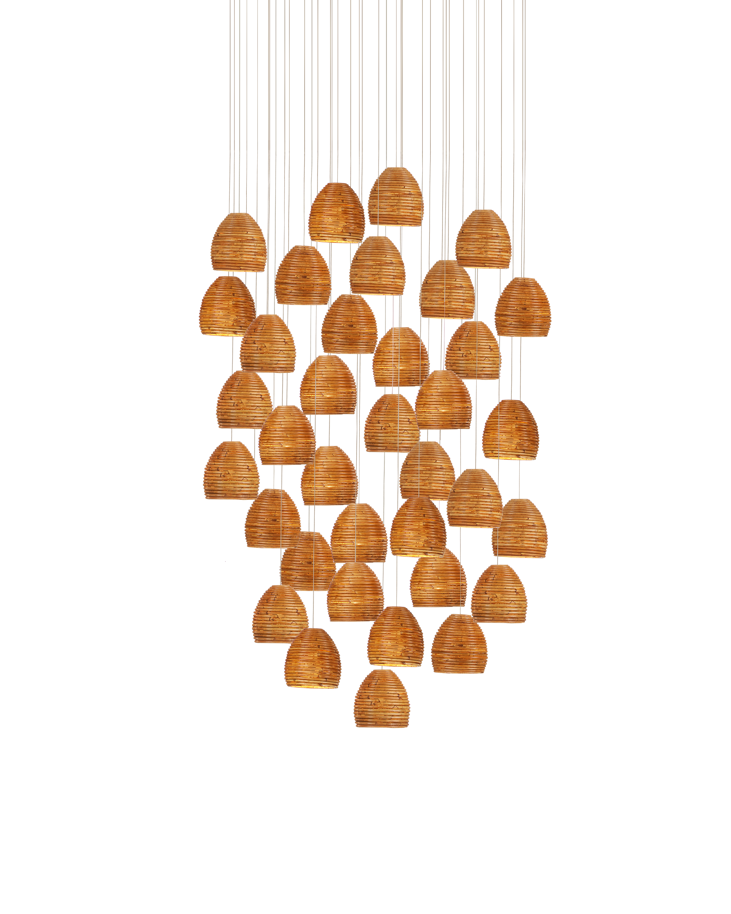 The Beehive 36-Light Multi-Drop Pendant has rattan bell-shaped shades. Because the natural material is not perfectly uniform, there are fissures in the shades that allow illumination to escape to create a warm glow. The canopy of this piece is luminous in a painted silver finish. This fixture is among Currey & Company's multi-drop pendant collection, which includes multiple configurations.