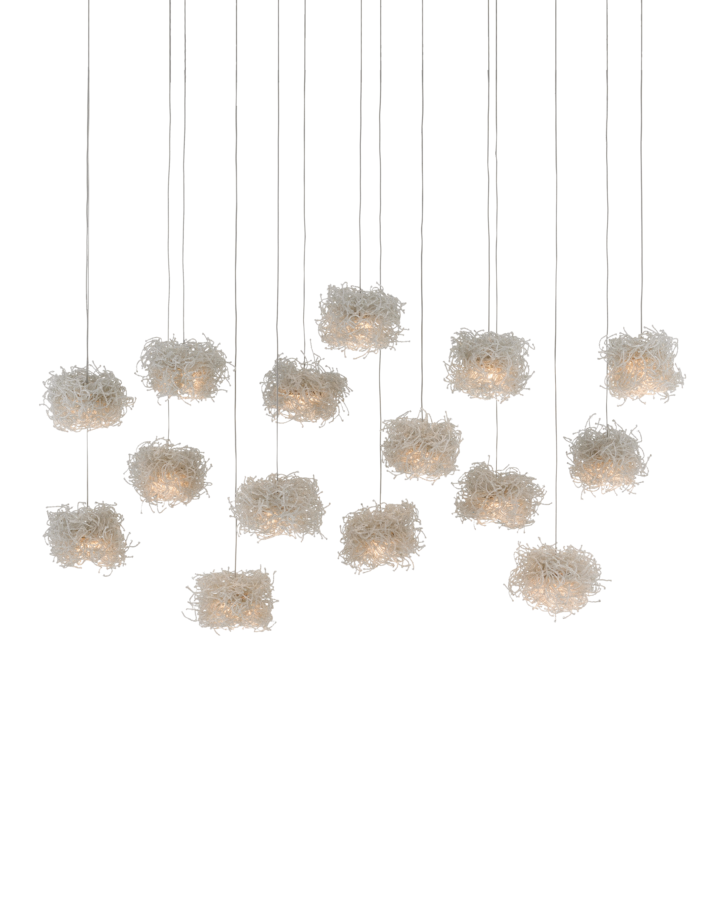 The Birds Nest Rectangular 15-Light Multi-Drop Pendant is an effervescent beaded pendant that looks like luminous nests. Rather than twigs, the shades are made up of whorls of clear beads strung along pieces of wire. It takes many hours for our artisans to create these shades that look so whimsical. The canopy of this piece is luminous in a painted silver finish. This fixture is among Currey & Company's multi-drop pendant collection, which includes multiple configurations.