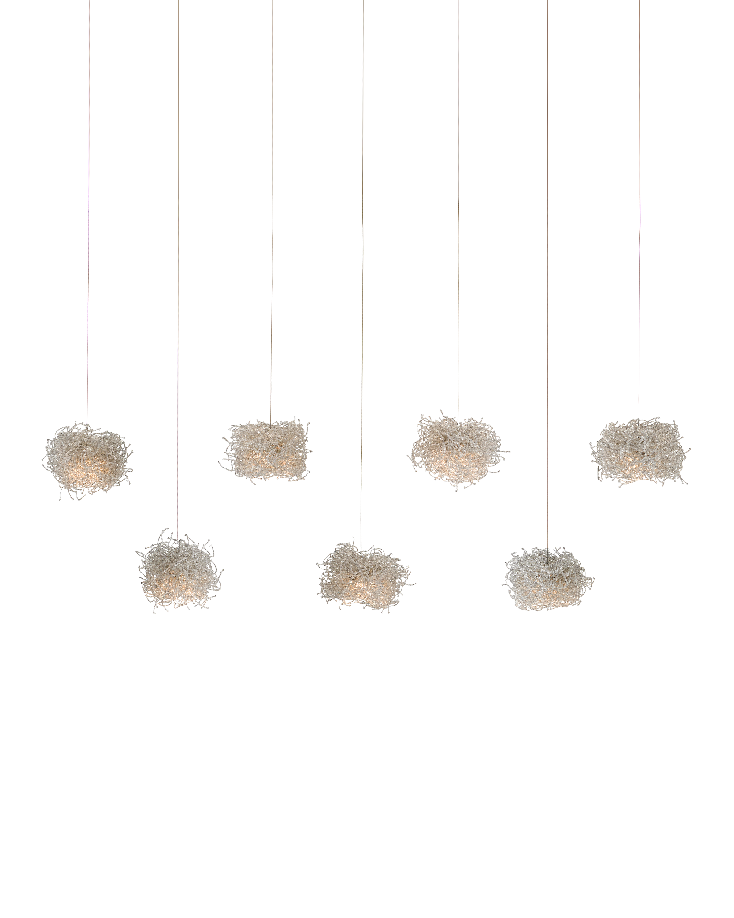 The Birds Nest Rectangular 7-Light Multi-Drop Pendant is an effervescent beaded pendant with shades that look like luminous nests. Rather than twigs, the shades are made up of whorls of clear beads strung along pieces of wire. It takes many hours for our artisans to create these works of art that look so whimsical. The canopy of this piece is luminous in a painted silver finish. This fixture is among Currey & Company's multi-drop pendant collection, which includes multiple configurations.