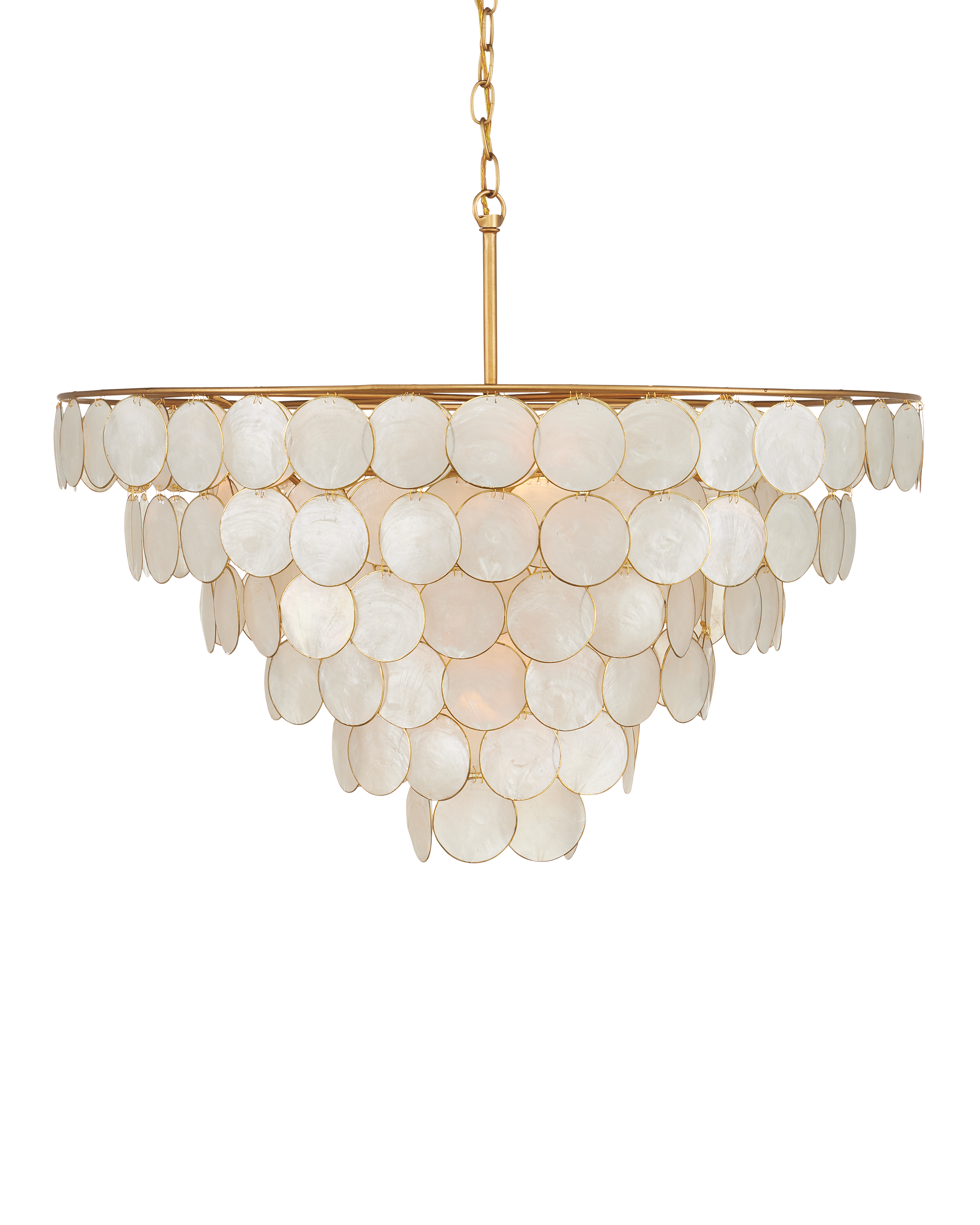 Ethereal in its overall vibe, the Bon Vivant Large Semi-Flush Mount was designed by Tom Caldwell. The discs that effervesce with illumination are made of Capiz shells ringed in a decorative metal edge that matches the gold finish on the rest of the fixture. The thinness of the wires that fasten the discs to the frame and to each other is a sophisticated design detail. This gold semi-flush is convertible to a chandelier when the lower canopy is removed. Adjustable from 31" to 99" with use of included chain/rod kit/cable. If your space calls for a longer drop, additional chain/rods/cable is available for purchase.
