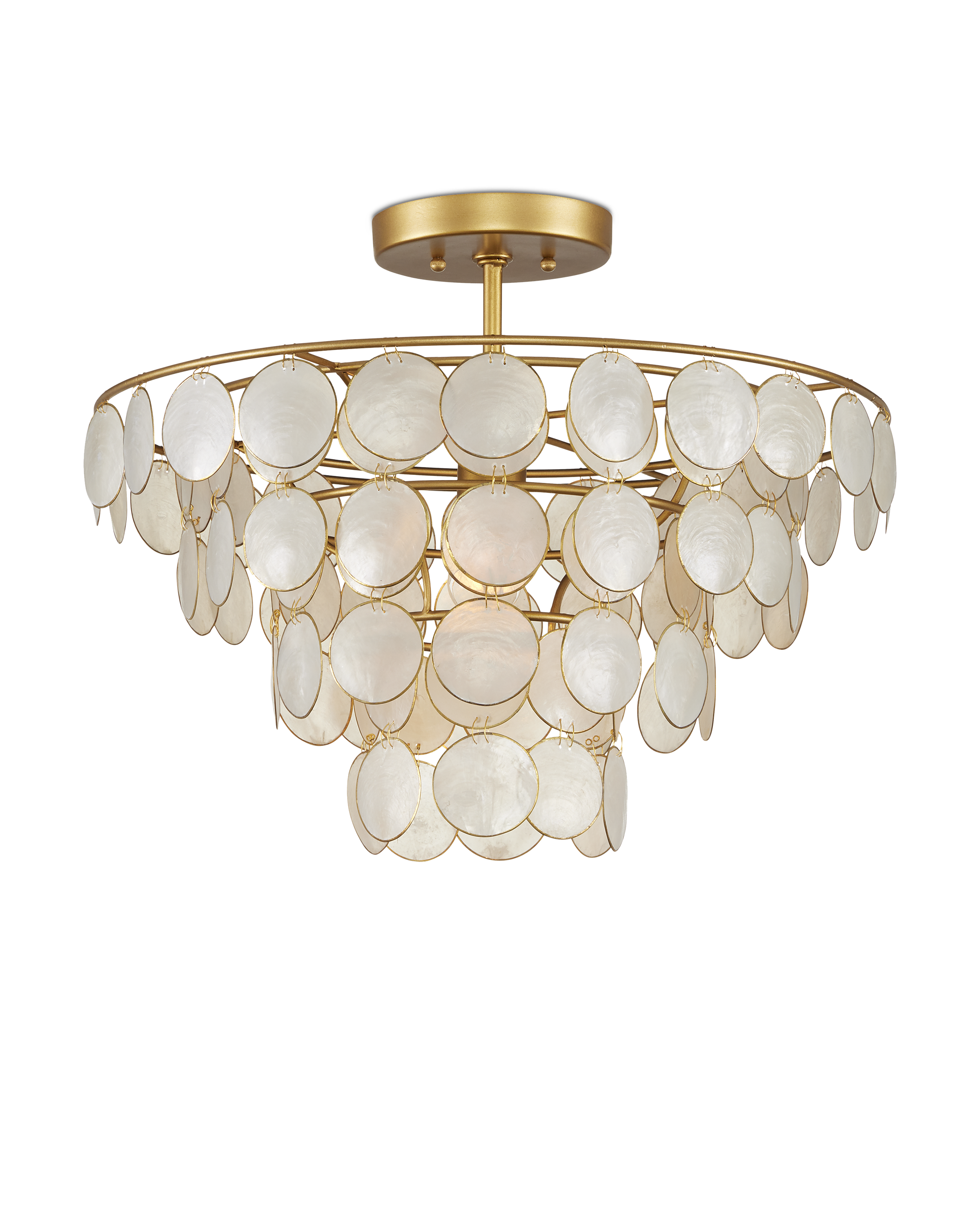Ethereal in its make-up, the Bon Vivant Small Semi-Flush Mount was designed by Tom Caldwell. The discs that effervesce with illumination are made of Capiz shells ringed with a decorative metal edge. These match the contemporary gold finish on the rest of the fixture. The thinness of the wires that fasten the discs to the frame and to each other is a sophisticated design detail. This gold semi-flush is convertible to a chandelier when the lower canopy is removed. Adjustable from 23.25" to 91.25" with use of included chain/rod kit/cable. If your space calls for a longer drop, additional chain/rods/cable is available for purchase.