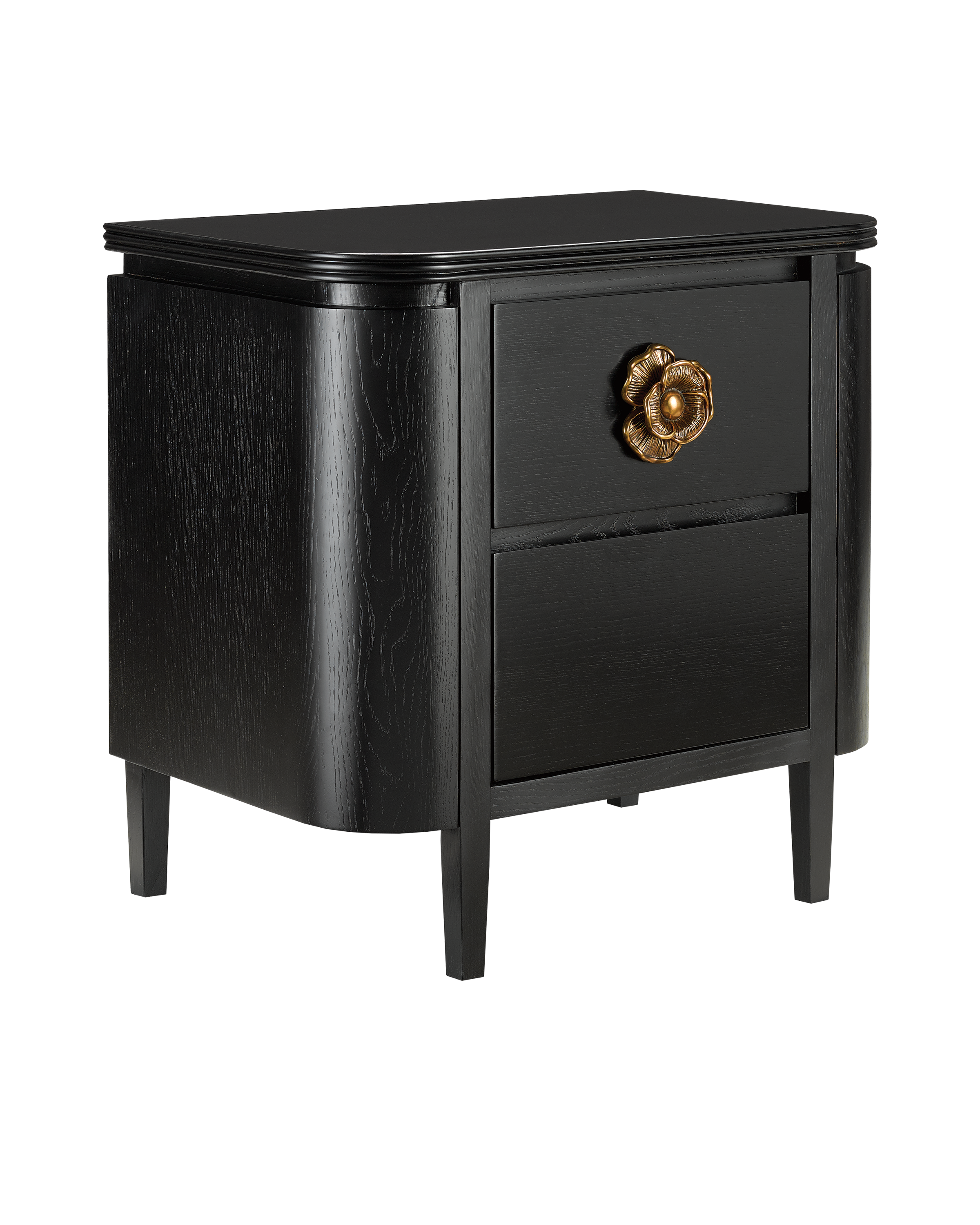 The impressively sized brass flower pull on the Briallen Black Nightstand is a stunning ornamentation. Contrasting the Caviar black stain, the floral motif in an antique brass finish brings the nightstand a sophisticated feel and illustrates the skill of our artisans who hand-cast the handle in brass.