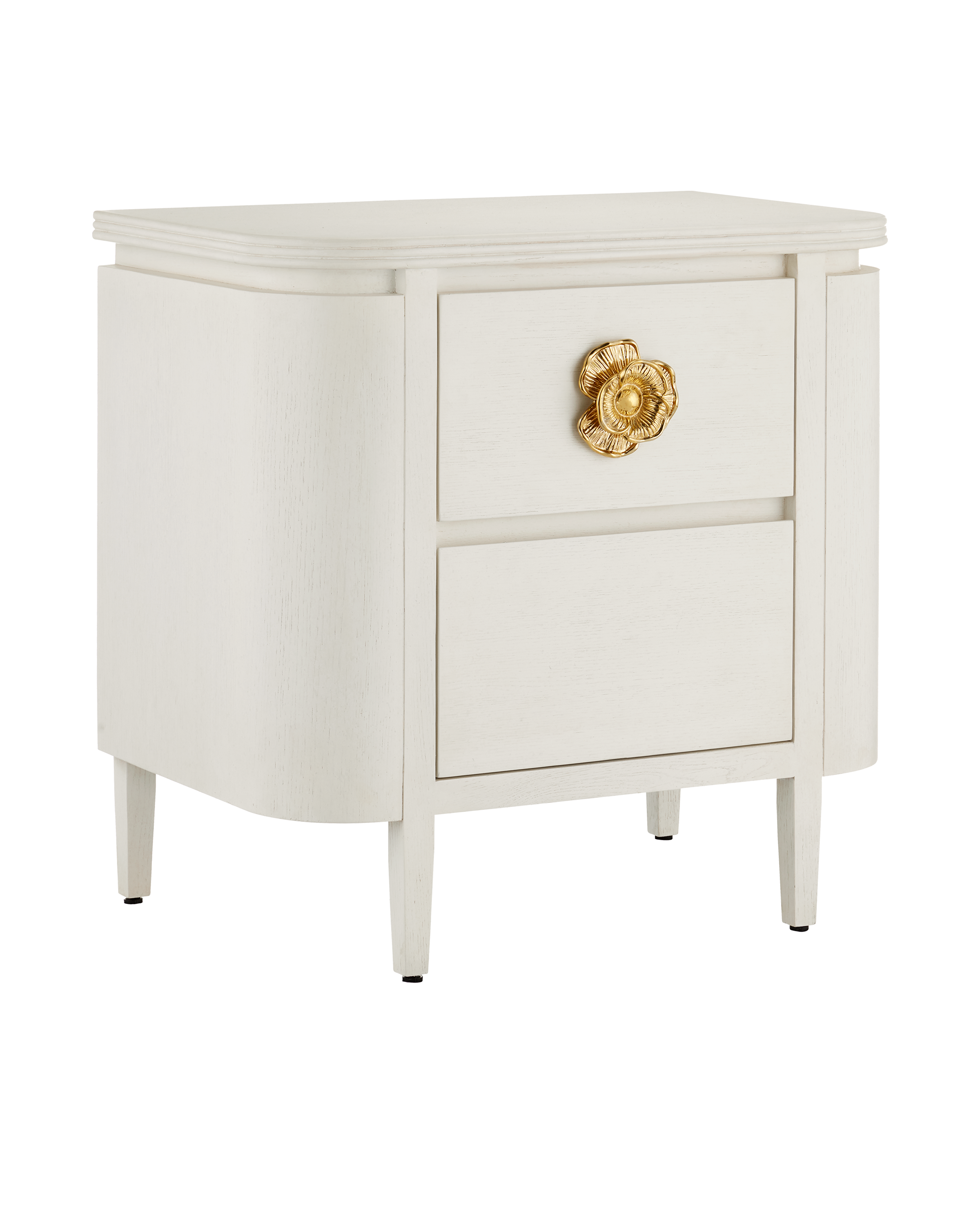 The impressively sized gold flower pull on the Briallen White Nightstand is a stunning ornamentation. A bright accent on the cerused white oak, the brass floral motif in a brass finish brings the white nightstand a sophisticated feel and illustrates the skill of our artisans who hand-cast the handle in brass. The two drawers on the nightstand are soft-close.