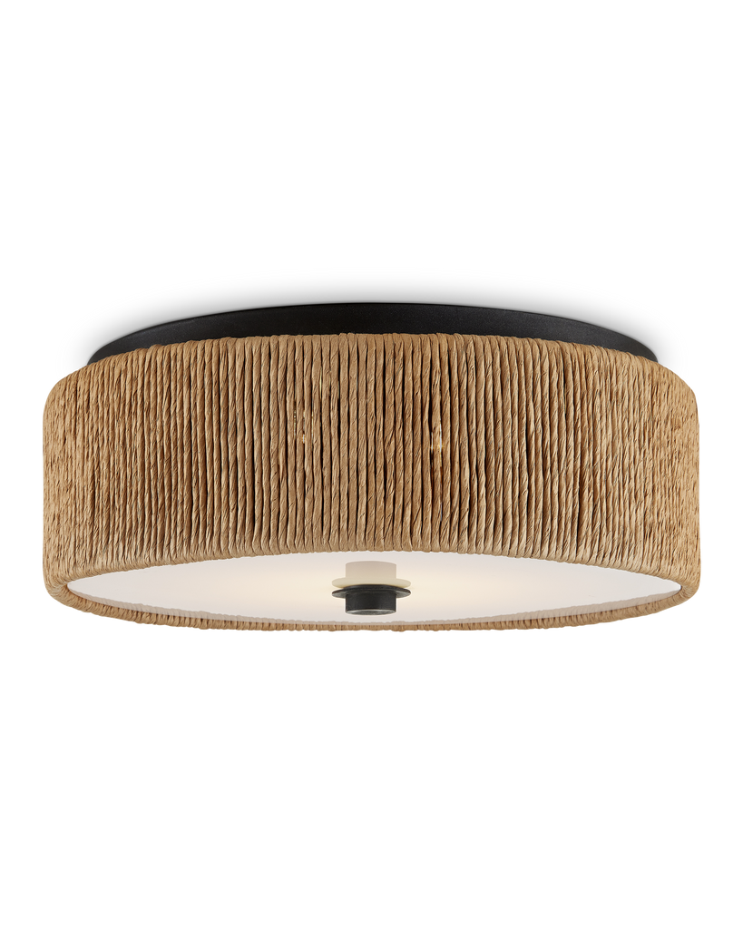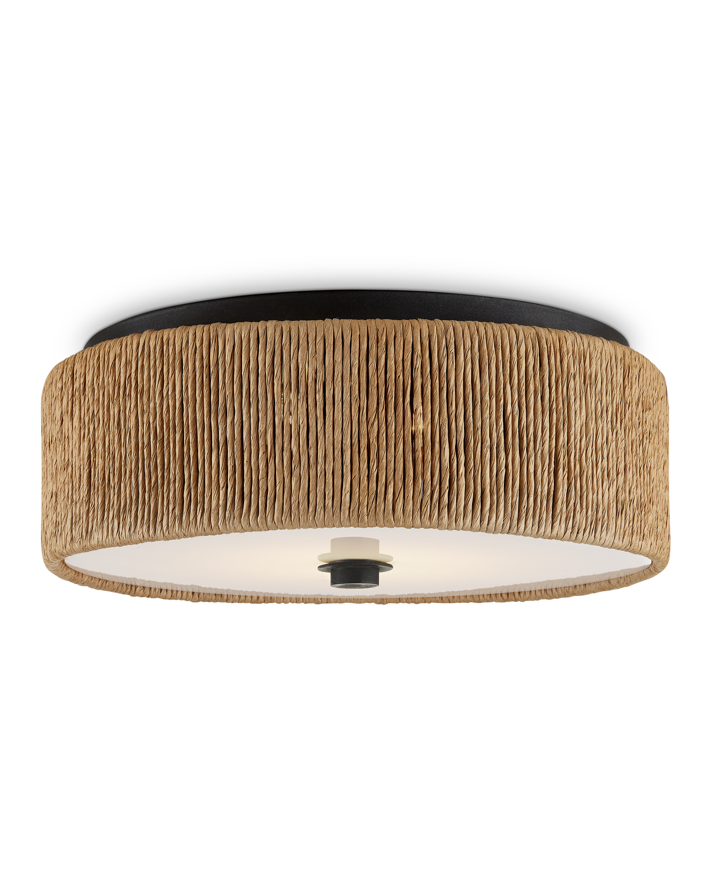 The Brownell Flush Mount has a mix of warmth and brightness. The warmer tones are created by the Kraft paper twine woven around its circumference, and the blacksmith finish on the metal that mounts it to the ceiling and the finial that fastens the acrylic diffuser to the bottom. The diffuser will create an even glow when light wafts through it. The pale, sleek material is the contrasting element to this design.