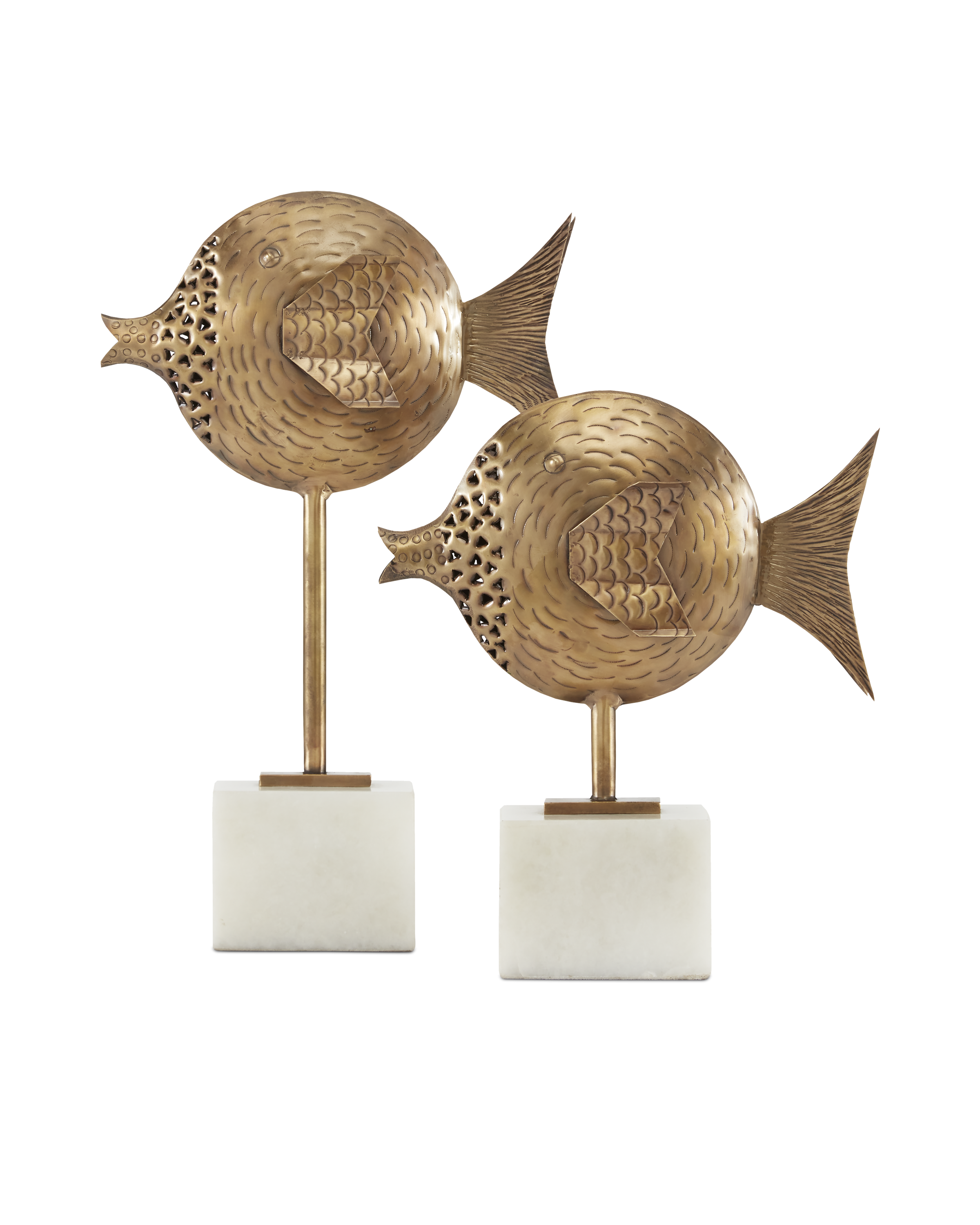 Handmade from brass to look like found objects unearthed in an exotic bazaar, the Cici Brass Fish Set includes one tall and one short fish in antique brass finishes. The artful creations extend from white marble bases that contrast the warmth of the brass fish sculptures.