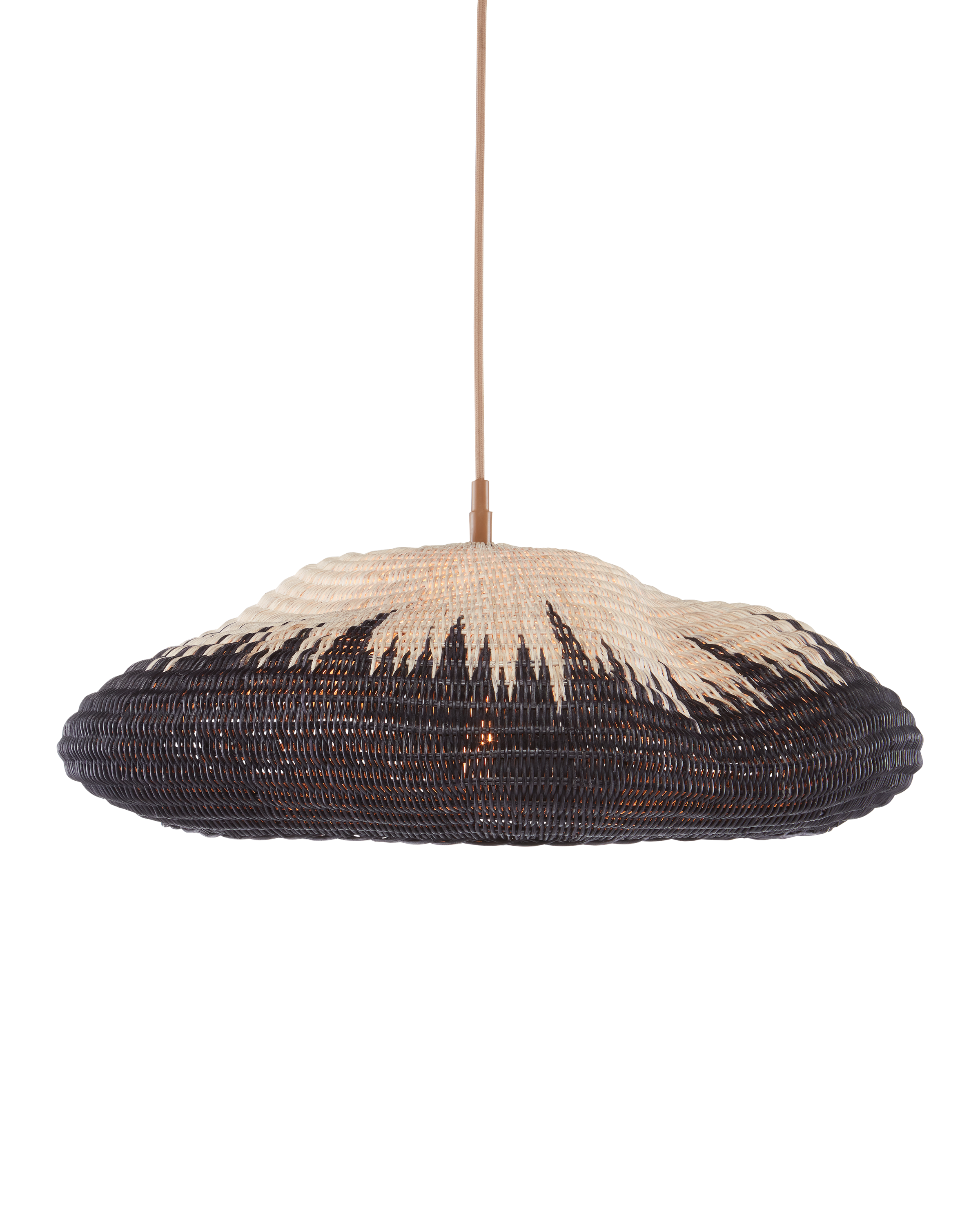 The Comme Des Paniers Pendant was inspired by wicker bags our design team saw in Paris. Panier in French means basket, the name a nod to the basket-weave it took to achieve this cloche-like shade. A detail of note is how the two-tone wicker shade looks as if there is a flame flowing up it. The wrought iron hardware on this basket-weave pendant is in a Khaki finish. Adjustable from 15.5" to 129.5" with use of included chain/rod kit/cable. If your space calls for a longer drop, additional chain/rods/cable is available for purchase.