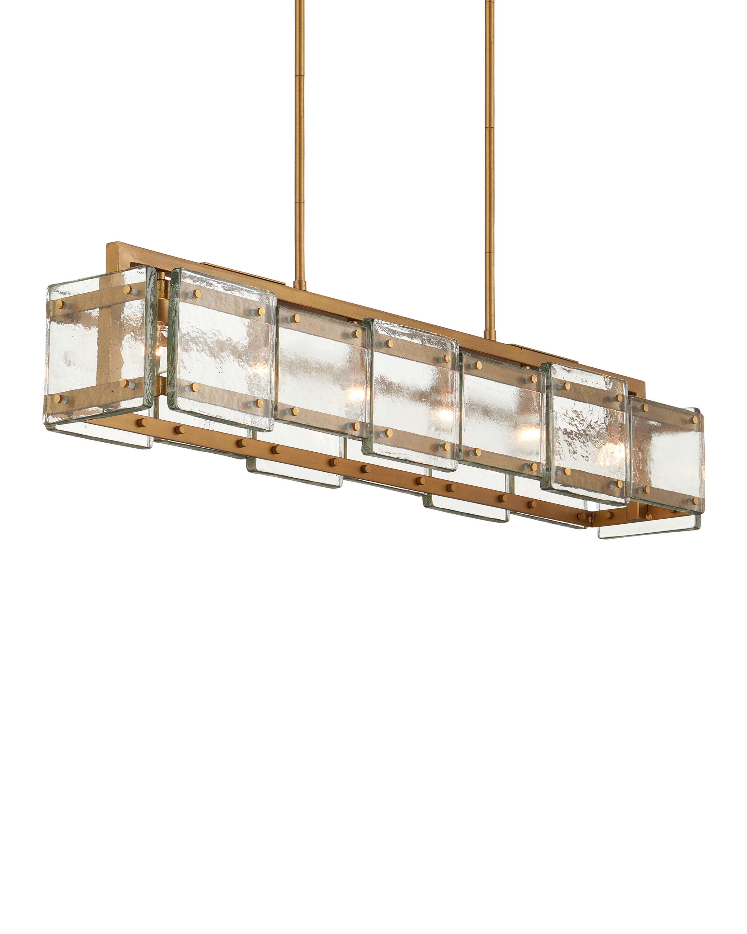 Clarence Mallari designed the Countervail Rectangular Chandelier with its panes of thick cast glass. The textural surfaces were the inspiration for this piece because the mottled nature of the glass enhances the glow of the chandelier. Each piece of the material that is fastened to a metal frame in an antique brass finish is unique. Mallari designed the panes to be fastened in place with sophisticated screws, which makes each piece removable. Adjustable from 12.75" to 54.75" with use of included chain/rod kit/cable. If your space calls for a longer drop, additional chain/rods/cable is available for purchase.