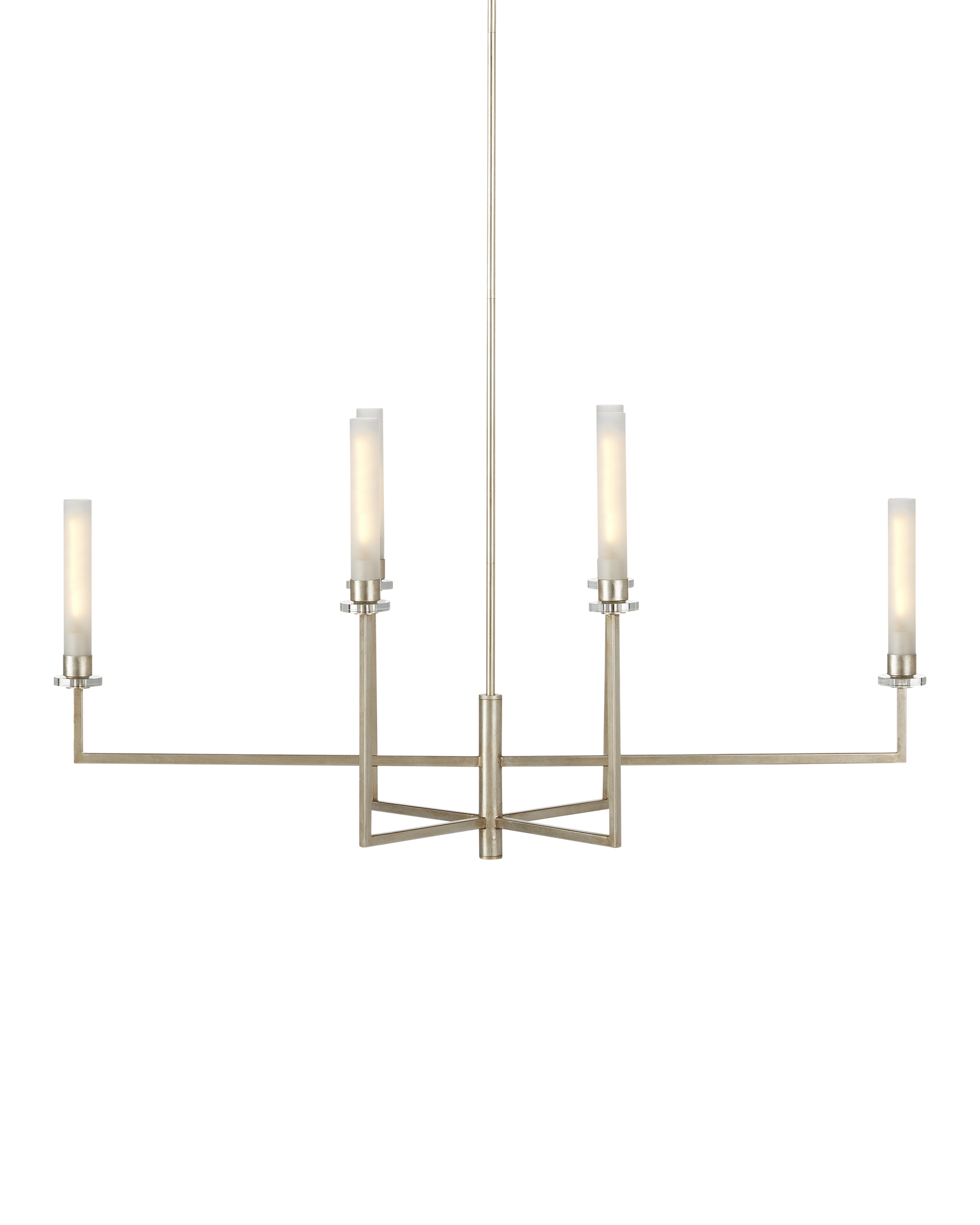 Made of metal in a champagne finish, the squared arms of the Courante Silver Chandelier balance optic crystal bobeches and frosted glass candle sleeves that enclose LED bulbs. Ian Thornton designed this chic chandelier in an oblong, so it would illuminate rectangular tables or kitchen islands. The height of the arms, the pared-down profile, and the gleaming combination of materials and finishes make this a traditional style turned thoroughly modern. Adjustable from 27.5" to 69.5" with use of included chain/rod kit/cable. If your space calls for a longer drop, additional chain/rods/cable is available for purchase.