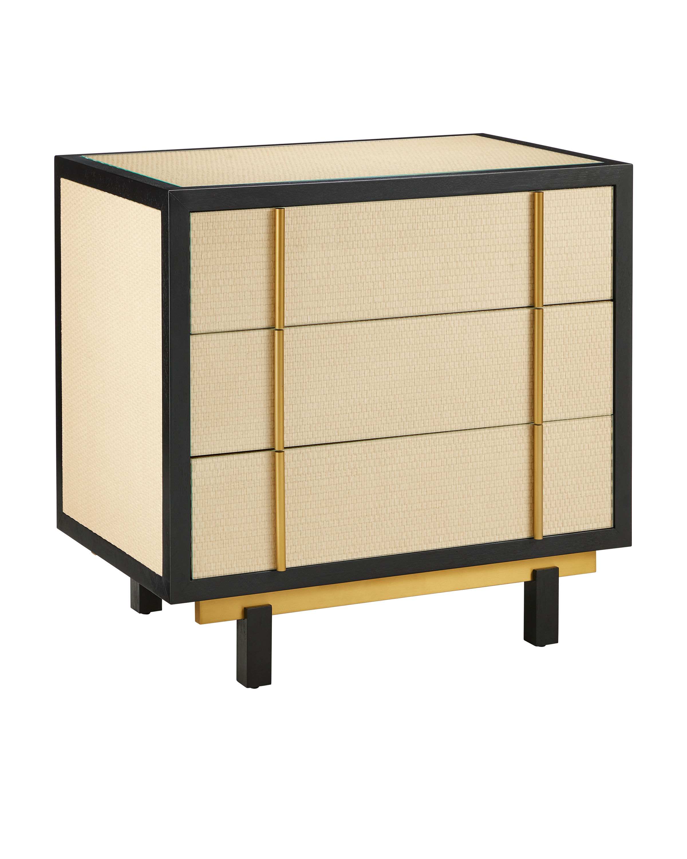 The Deanna Raffia Nightstand has panels of woven raffia on its drawer-fronts, sides, and top that are surrounded by strips of Okoume wood in a black finish, matching the nightstands legs. The combination of black and beige bring this piece a tailored feel that fits within a wide spectrum of design styles, especially a room that exudes Hollywood glamour. The subtle texture of the raffia is a special aspect of this design, as is the fact the nightstand is fitted with an inset glass top to protect the natural fibers. Linear drawer pulls and a plinth base are made of metal in a brushed brass finish to bring elegance to the piece.