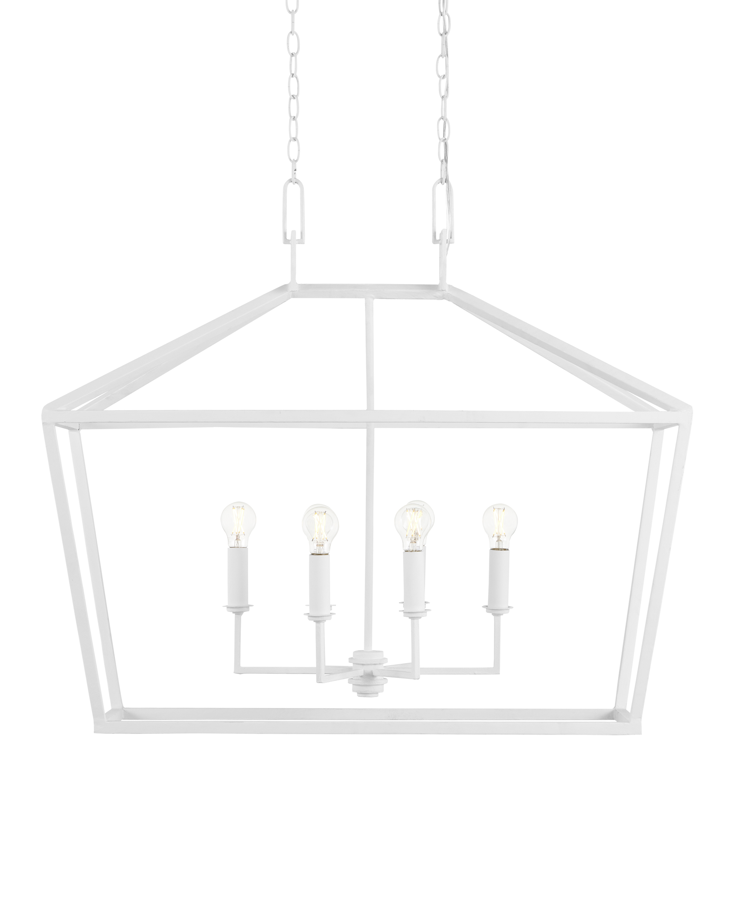 The Denison White Rectangular Chandelier is a hammered wrought-iron fixture in a gesso white finish. This classic lantern shape has stood the test of time to make it one of our most popular offerings. A refined aspect of the design is the square that fastens the lantern to the chain. The pared-down profile and pale finish on this version makes it perfect for coastal aesthetics. Adjustable from 42" to 110" with use of included chain/rod kit/cable. If your space calls for a longer drop, additional chain/rods/cable is available for purchase.